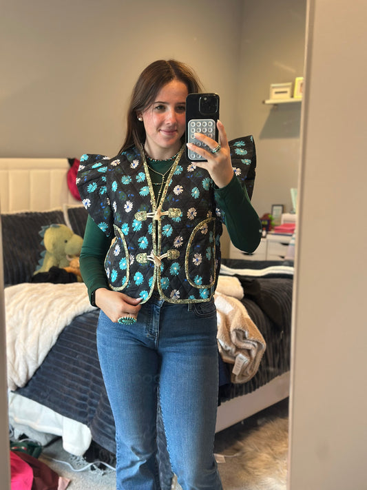 Floral print quilted puff ruffle sleeve vestRegular price $58.00 USDRegular priceUnit price / per-