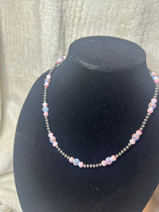 4mm pearl + 6mm pink conch + 8mm ceramic necklace - sterling silver pearls