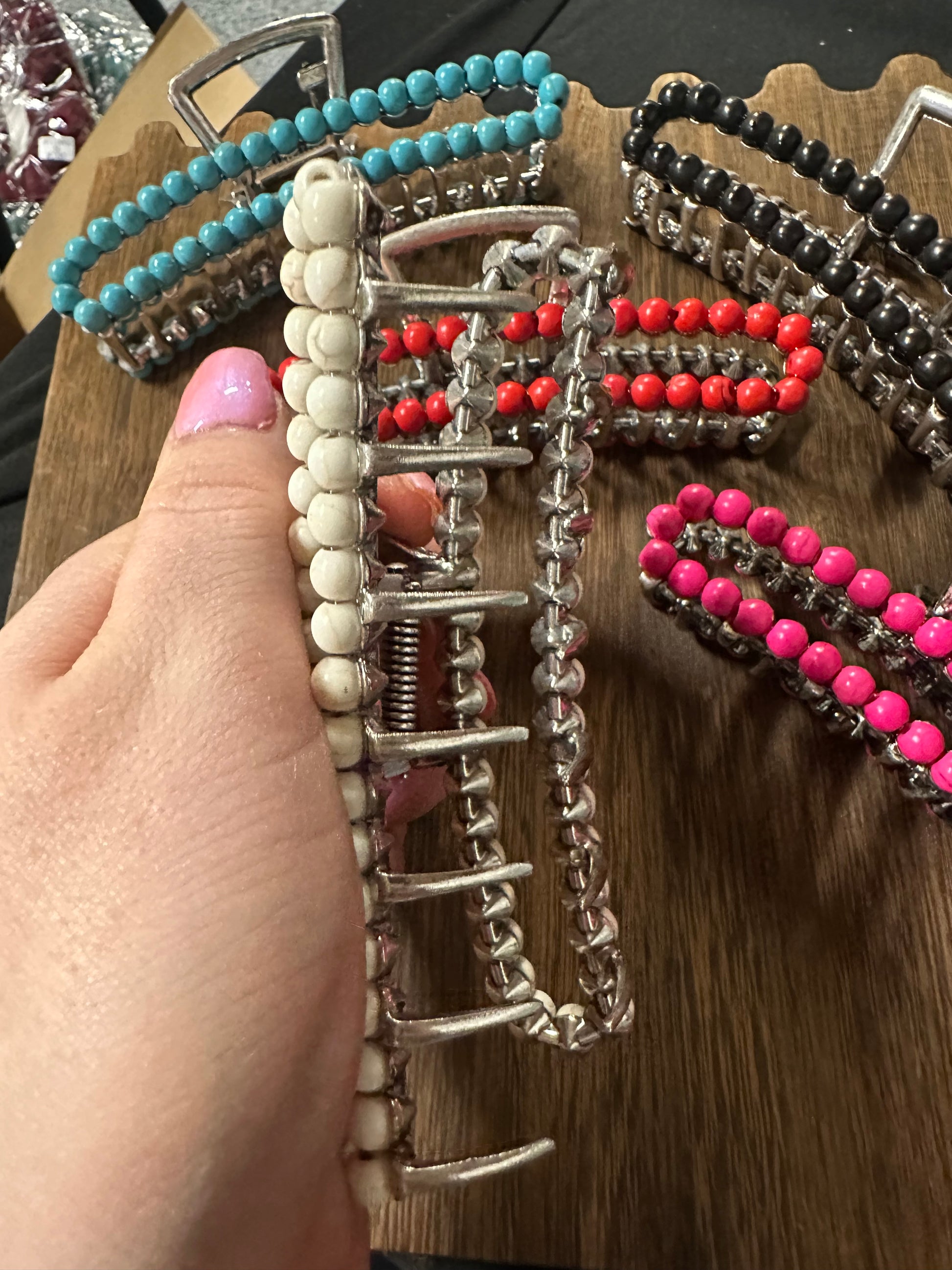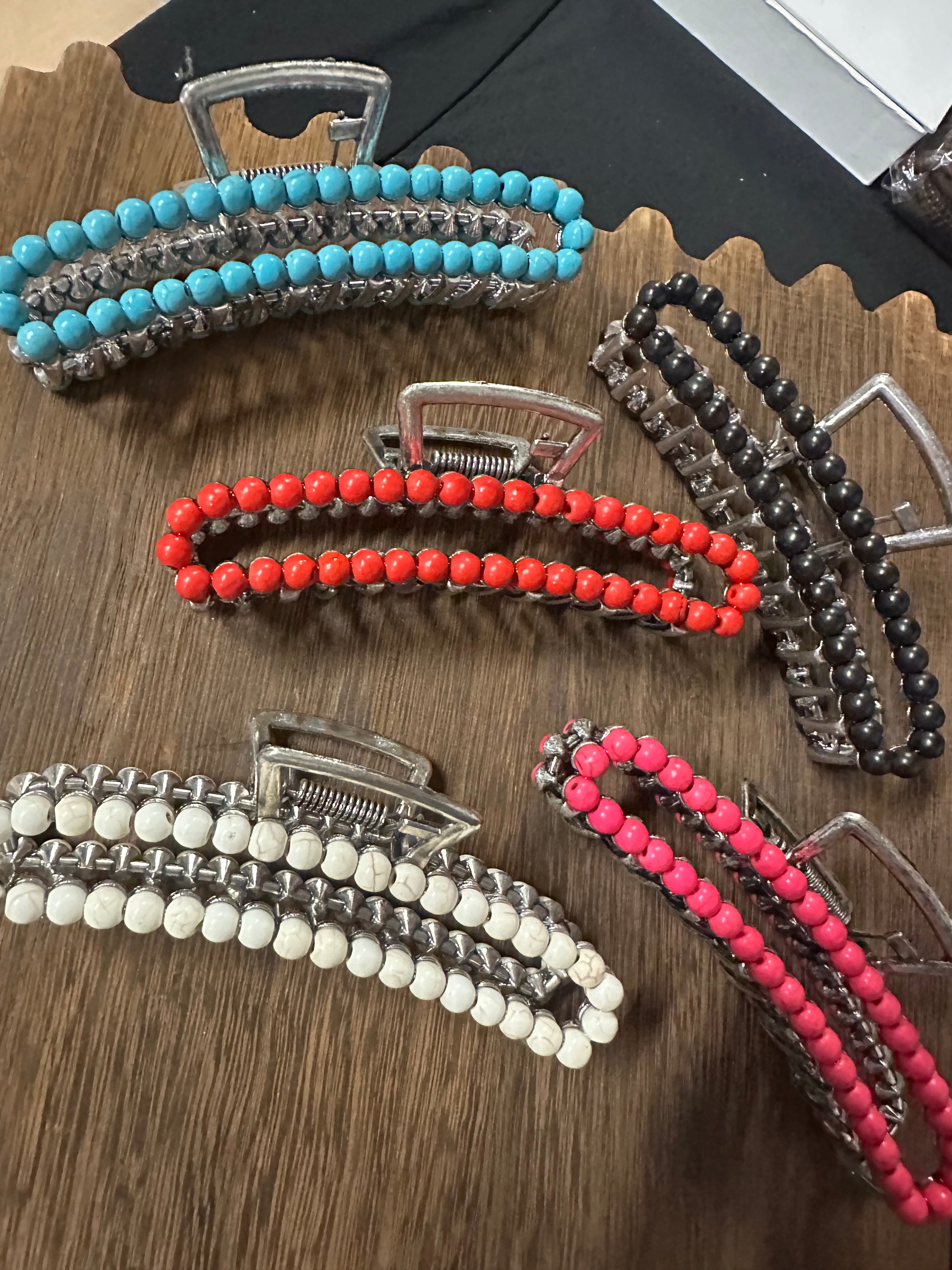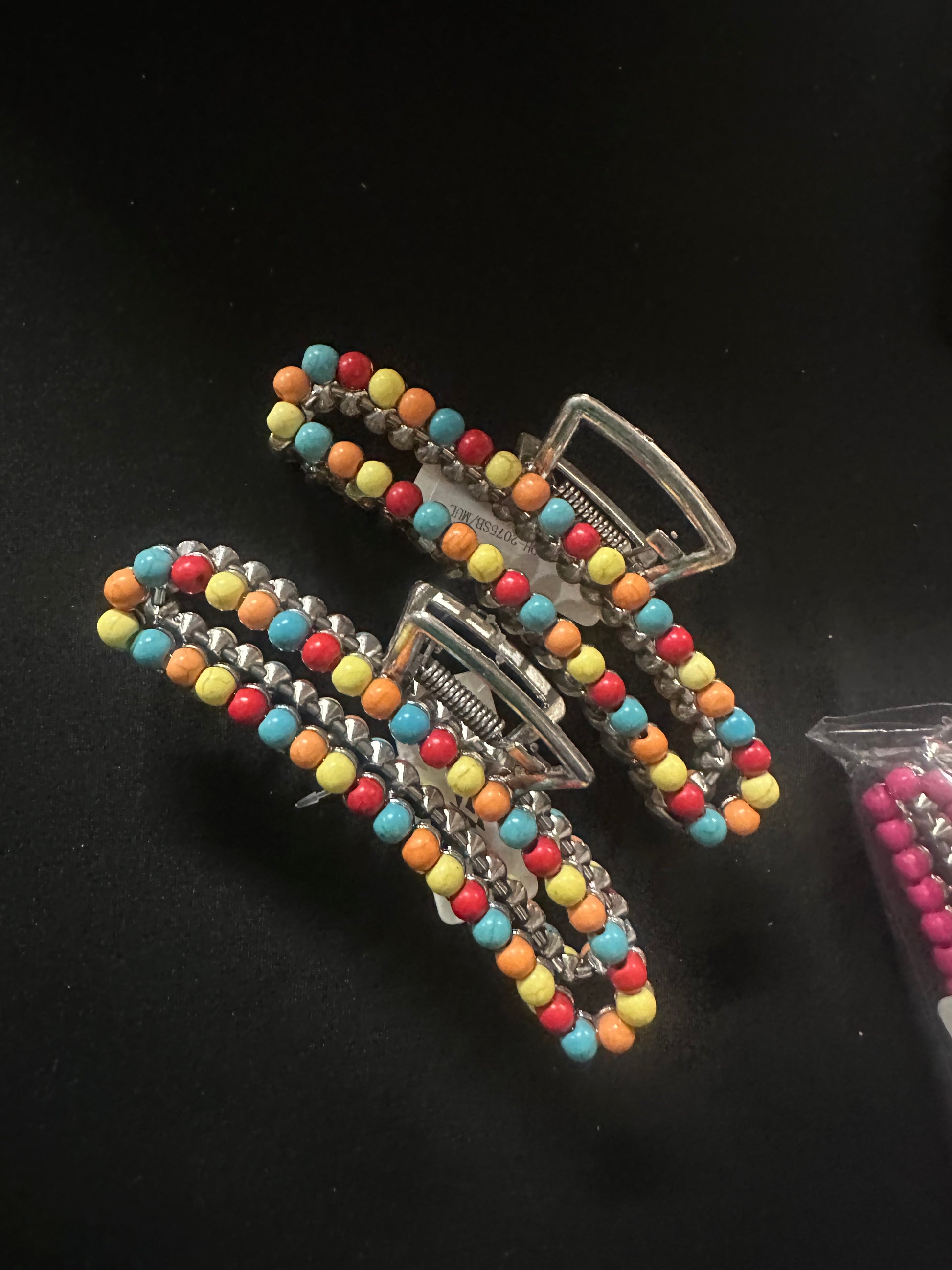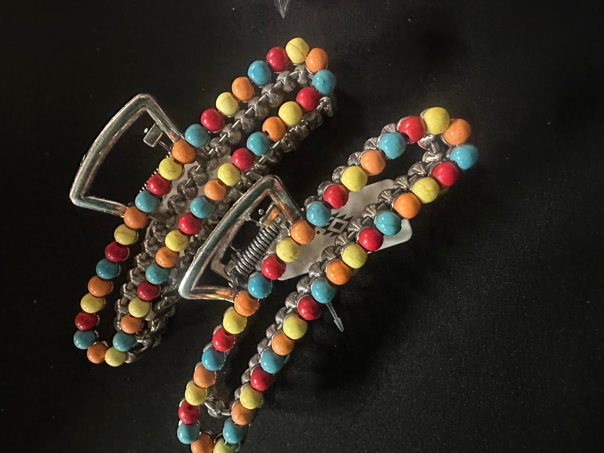 The claw clip features a burnished silver and turquoise color, adding a touch of elegance and sophistication to your hair style. The use of stone beads adds a unique touch of texture and sparkle, making it a statement piece that will elevate any look.
