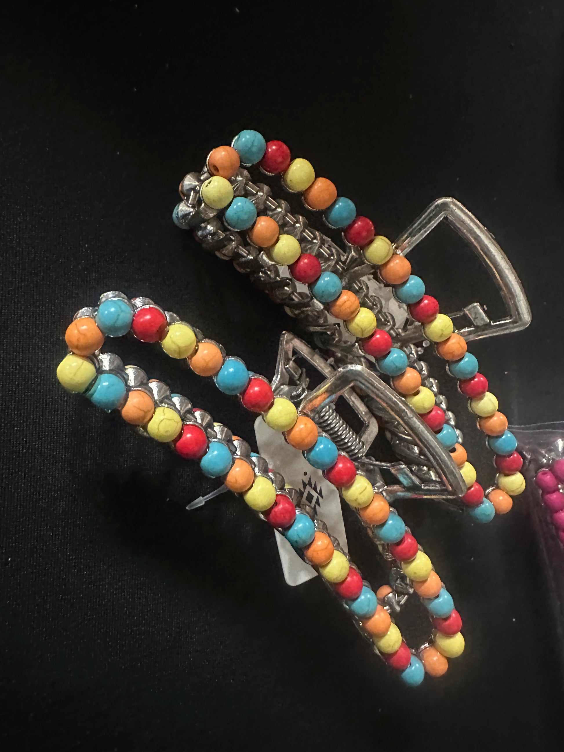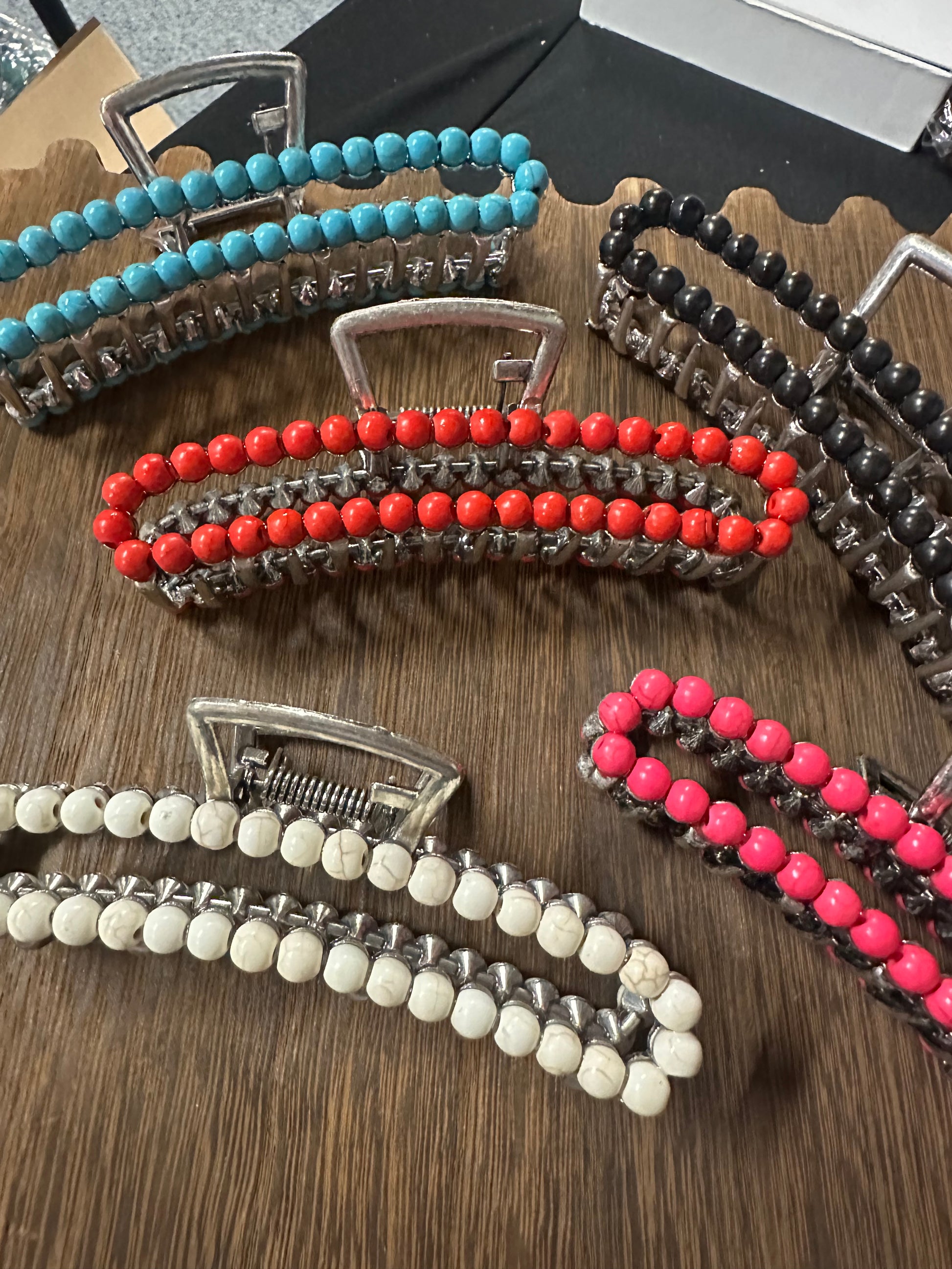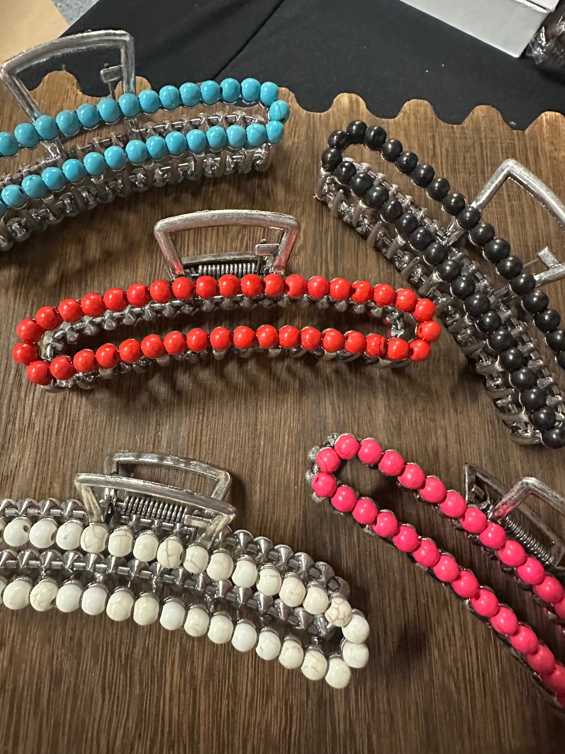 The claw clip features a burnished silver and turquoise color, adding a touch of elegance and sophistication to your hair style. The use of stone beads adds a unique touch of texture and sparkle, making it a statement piece that will elevate any look.