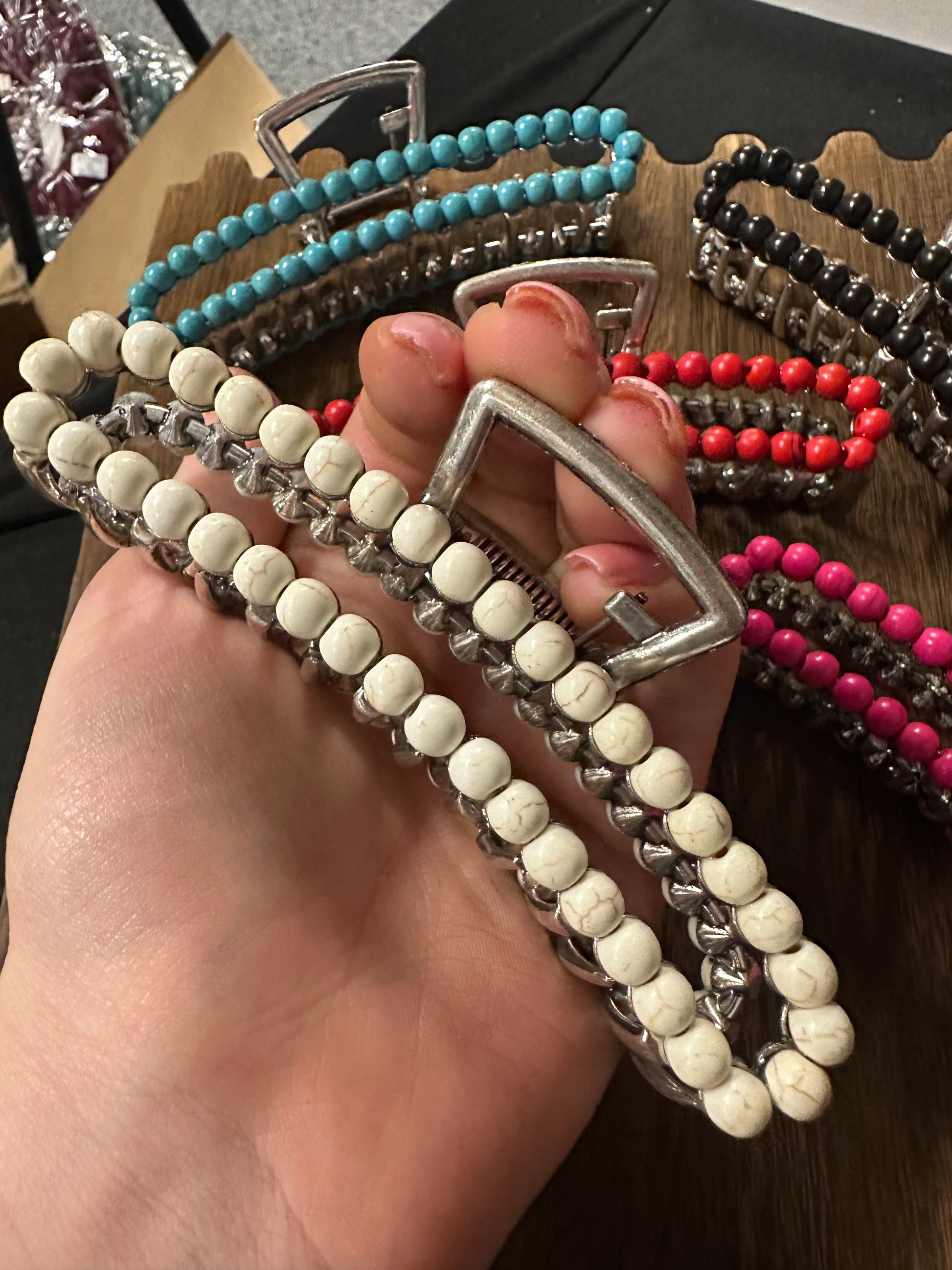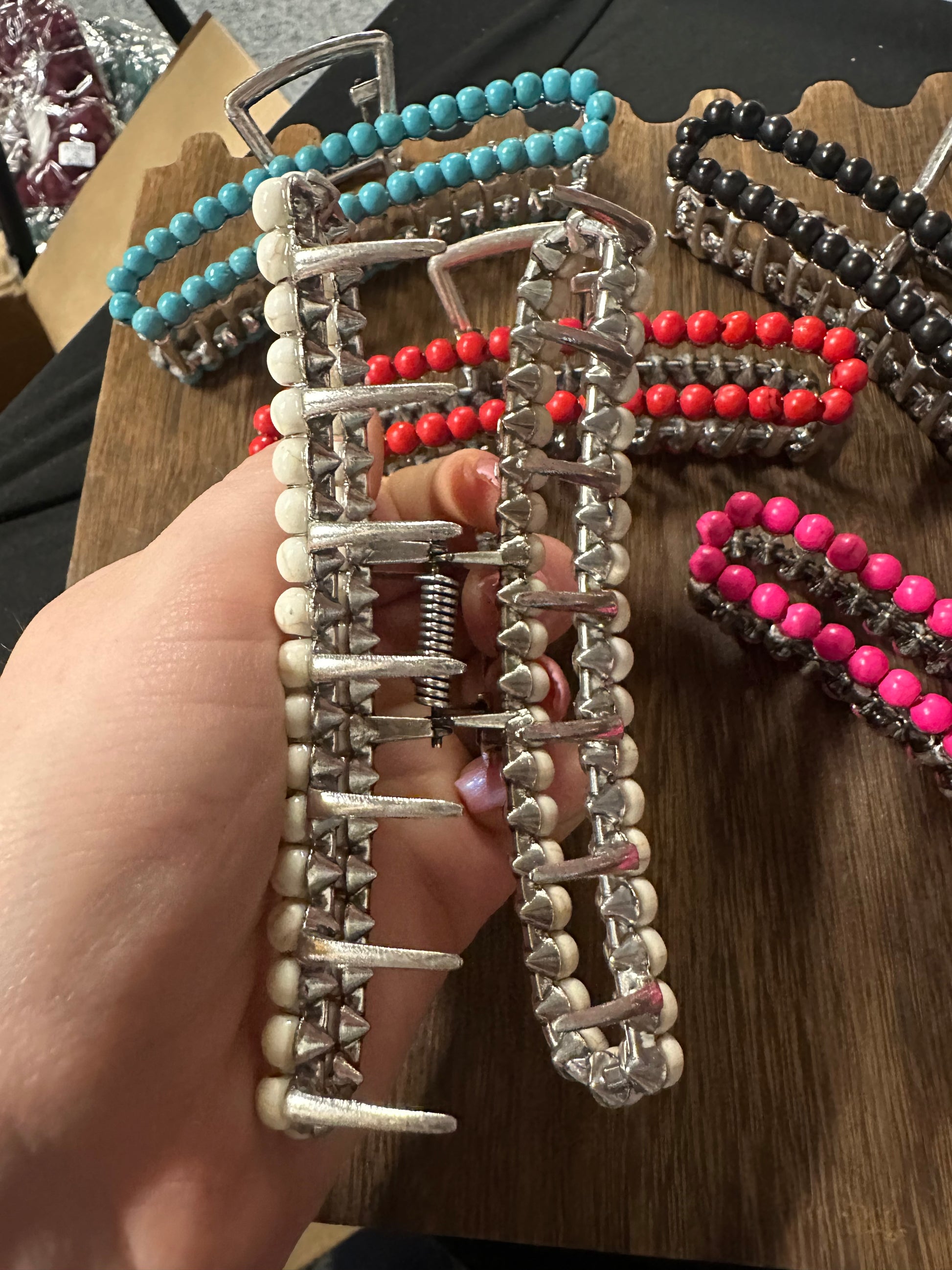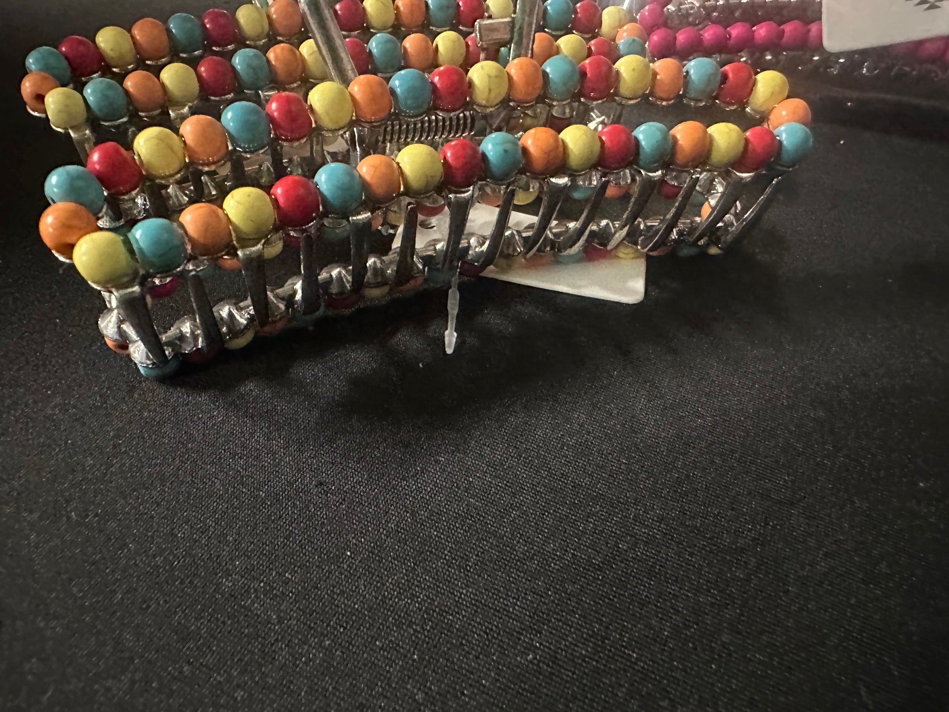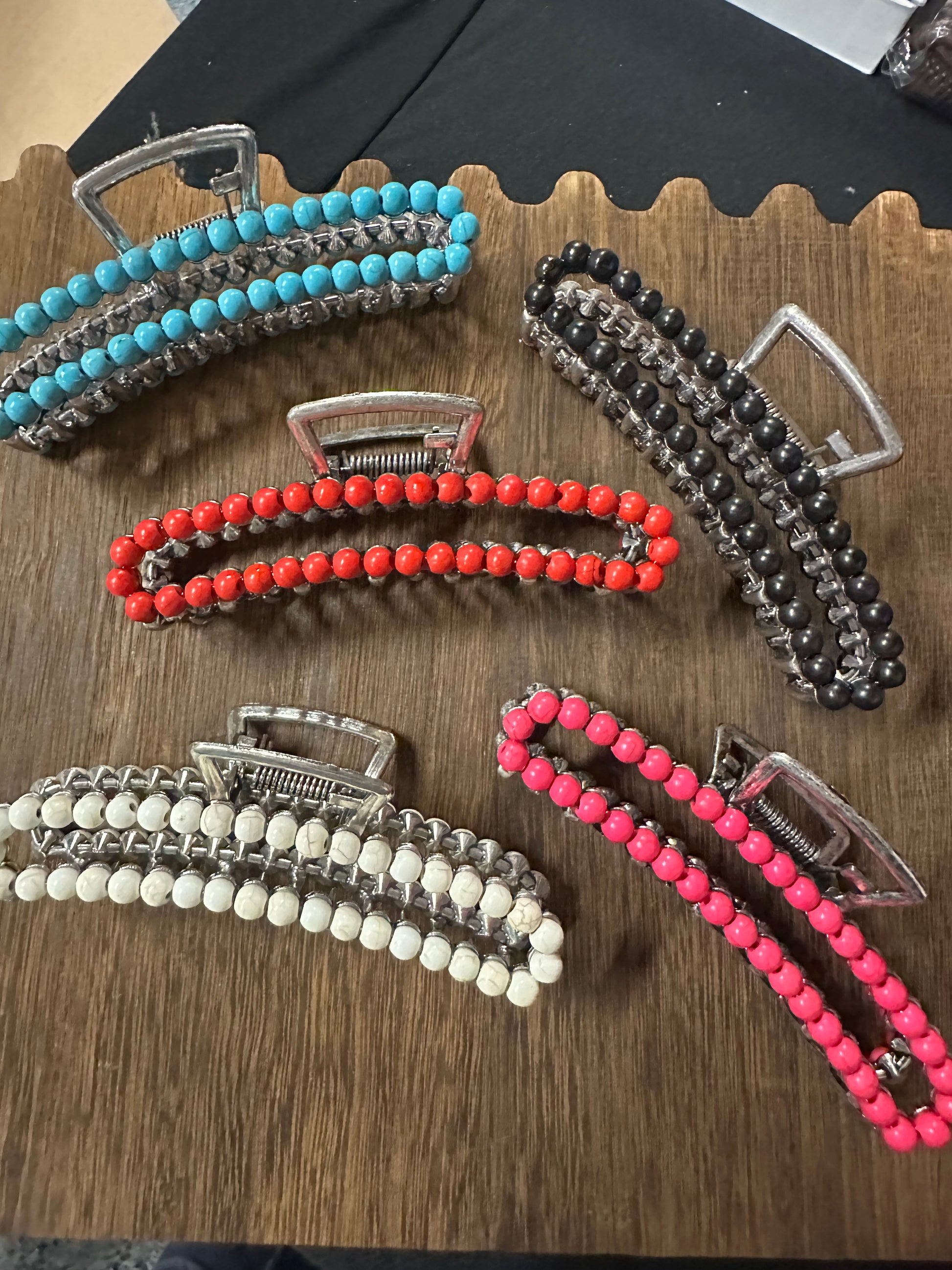 The claw clip features a burnished silver and turquoise color, adding a touch of elegance and sophistication to your hair style. The use of stone beads adds a unique touch of texture and sparkle, making it a statement piece that will elevate any look.