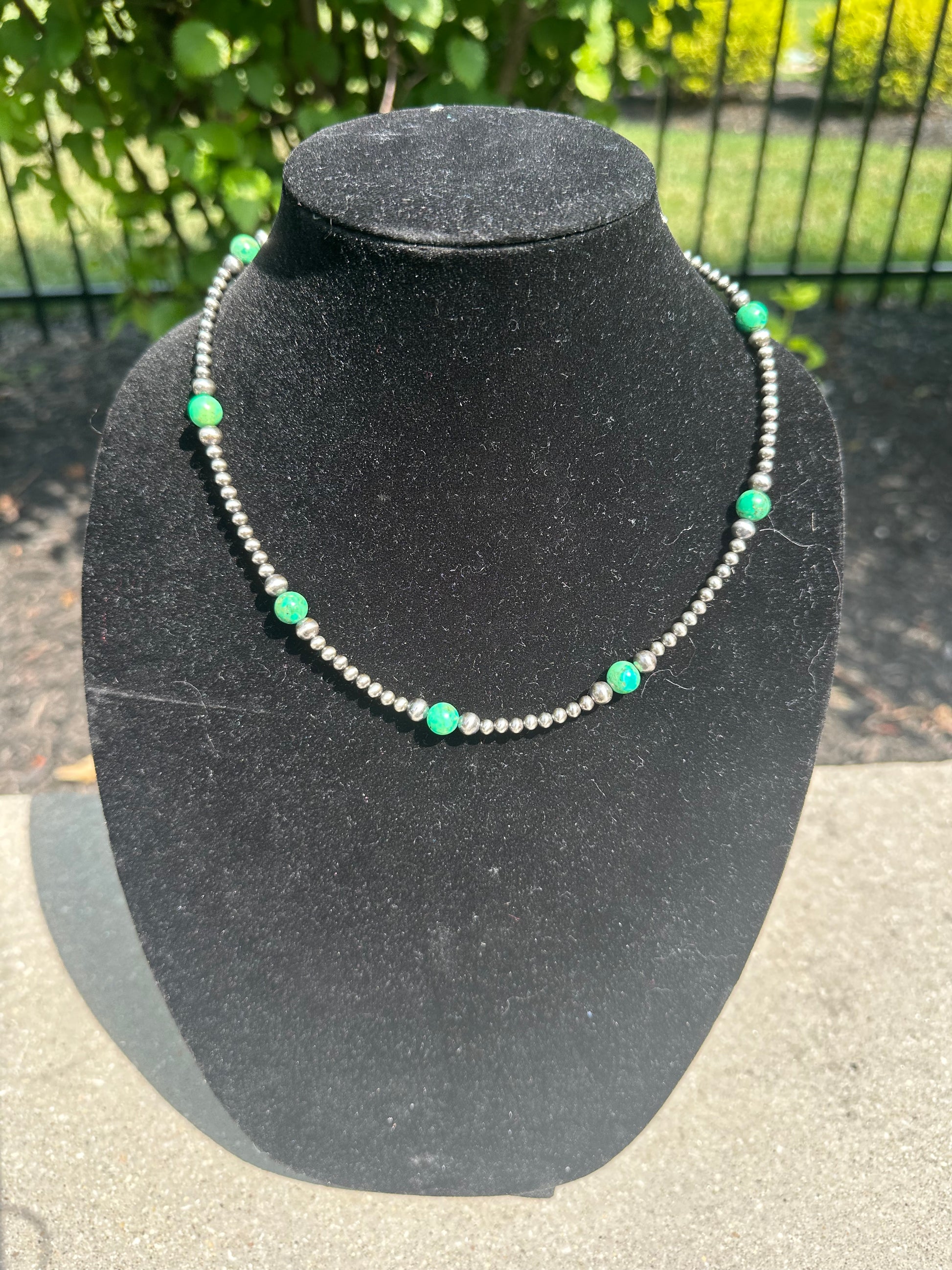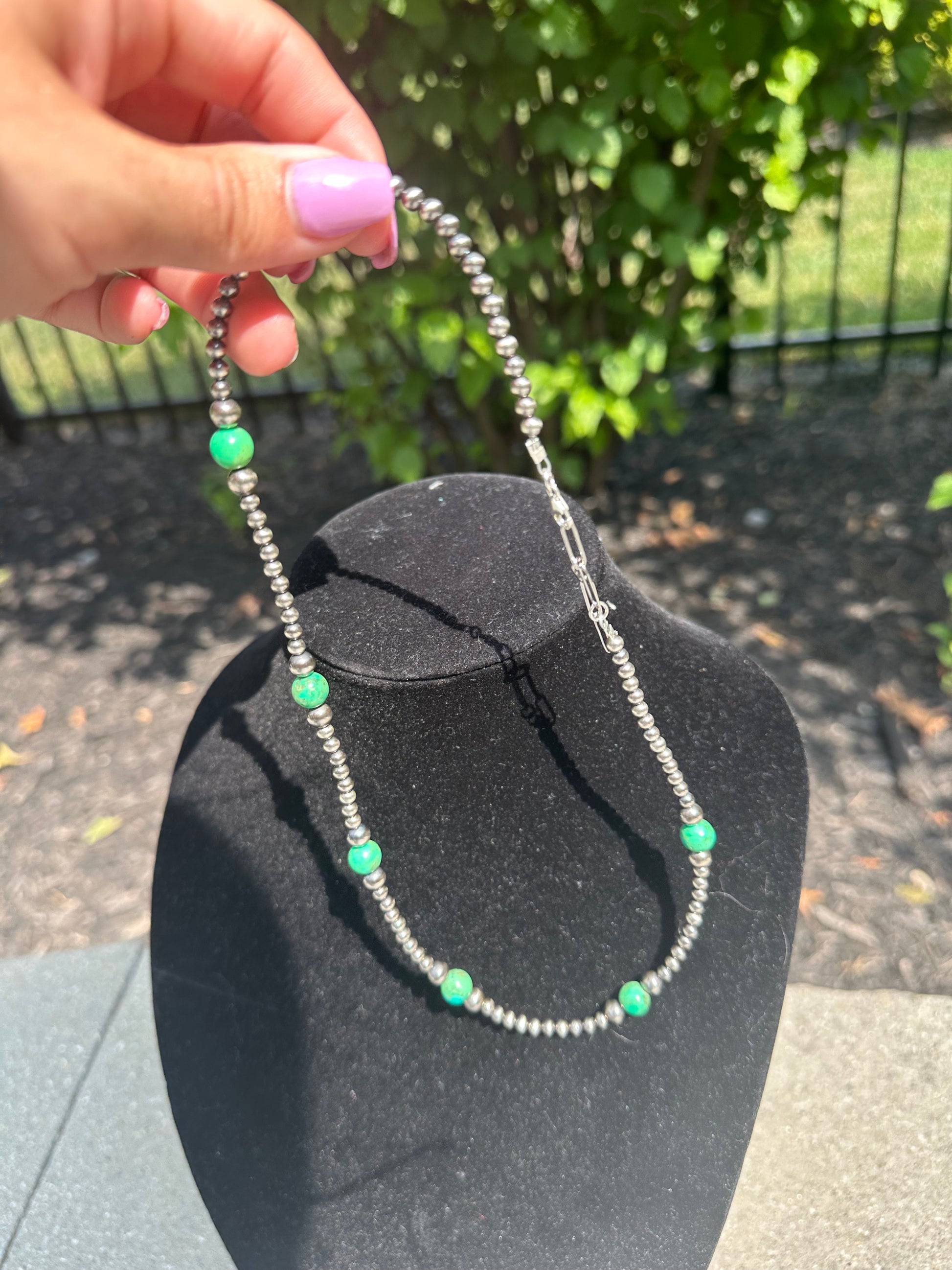 4-8mm graduated navajo style pearl + green turquoise necklace