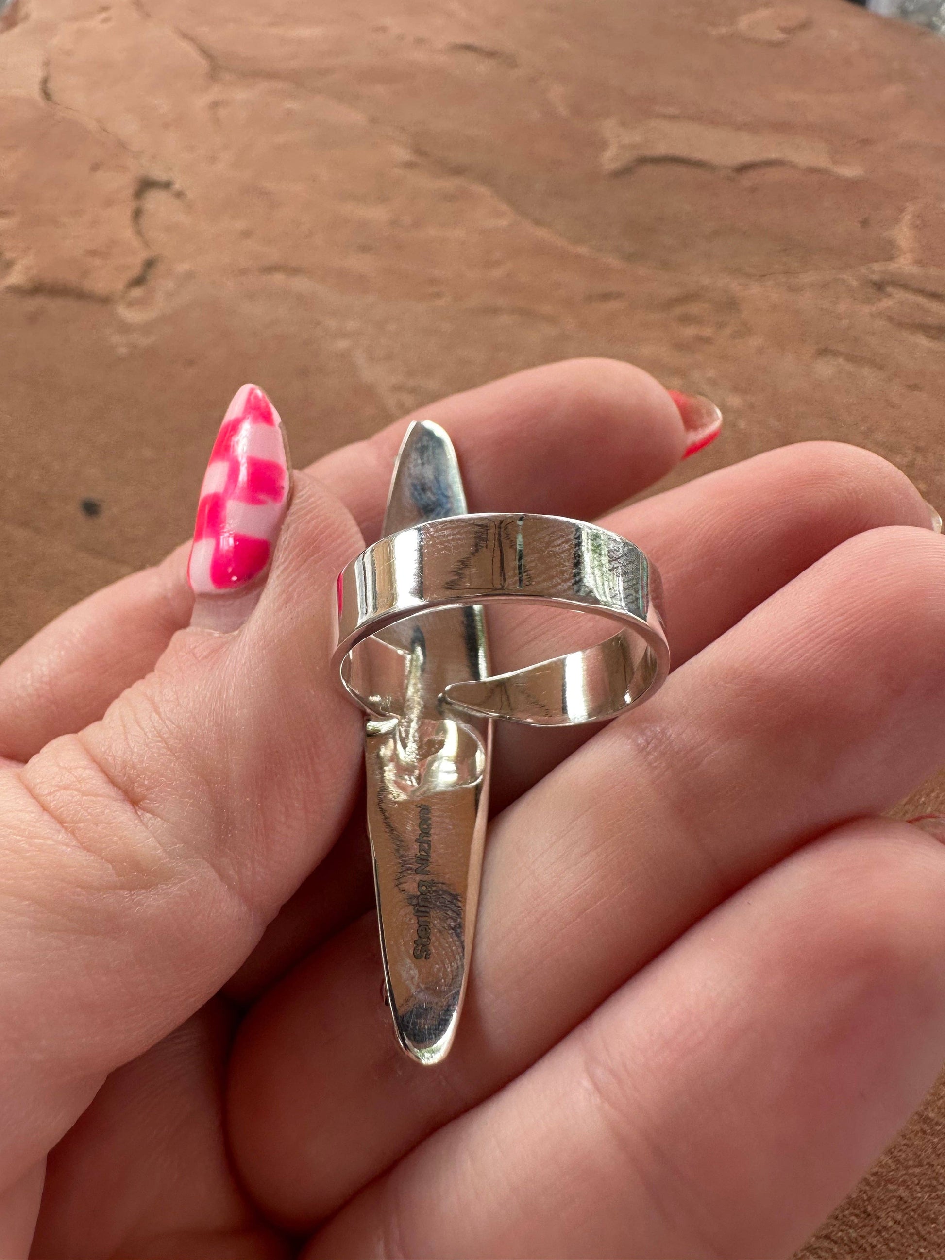 Adjustable in size to wear on any finger. Beautiful stones. Beautiful details. Really great Ring. Measuring 2 inches long and 1/2 inch wide . Signed Nizhoni and stamped Sterling.