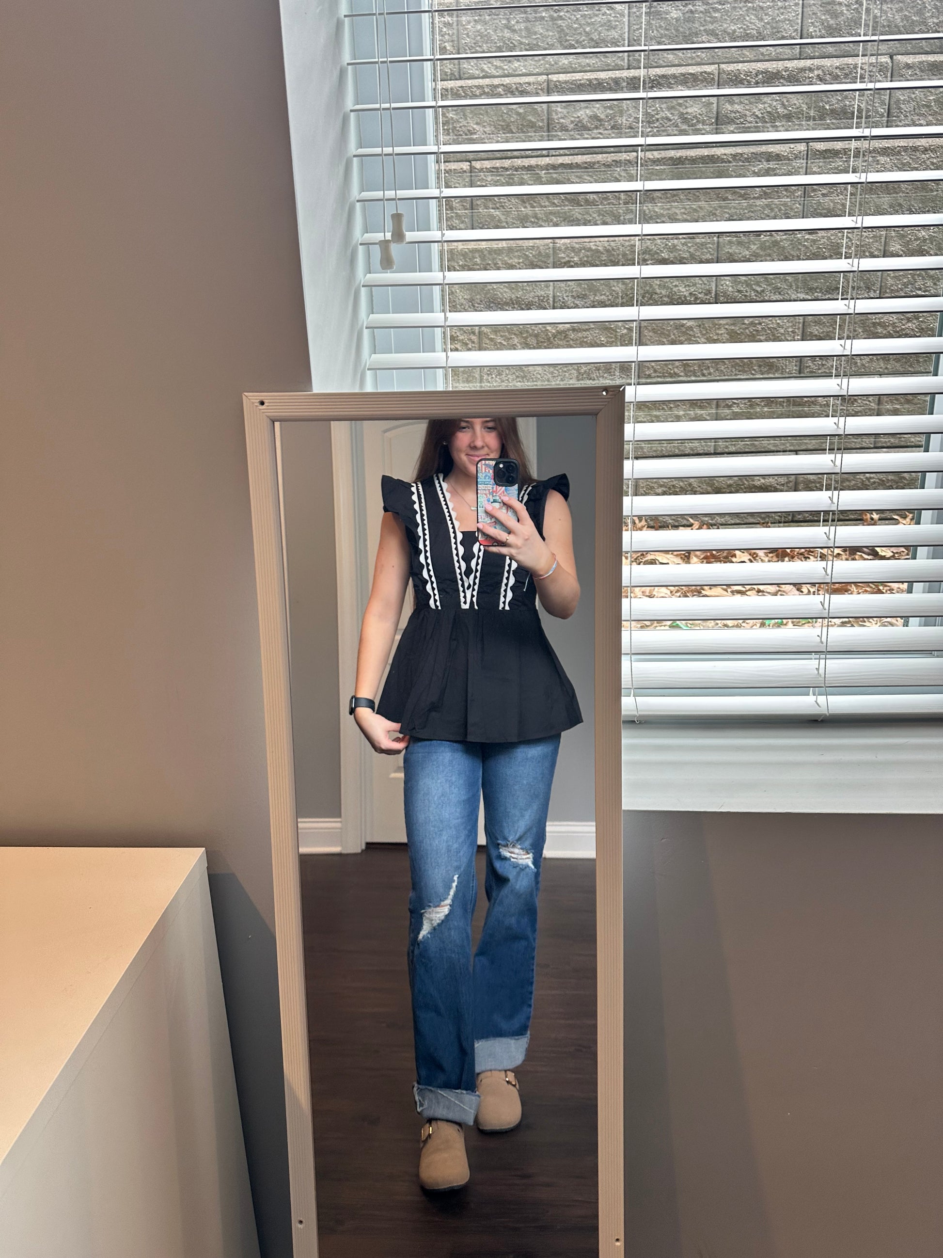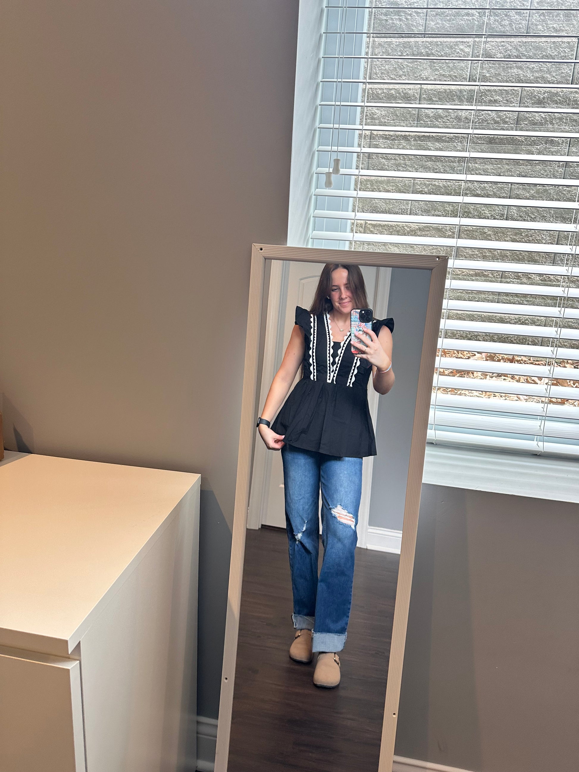 Black Contrast Ricrac Trim Ruffled V Neck Peplum Top