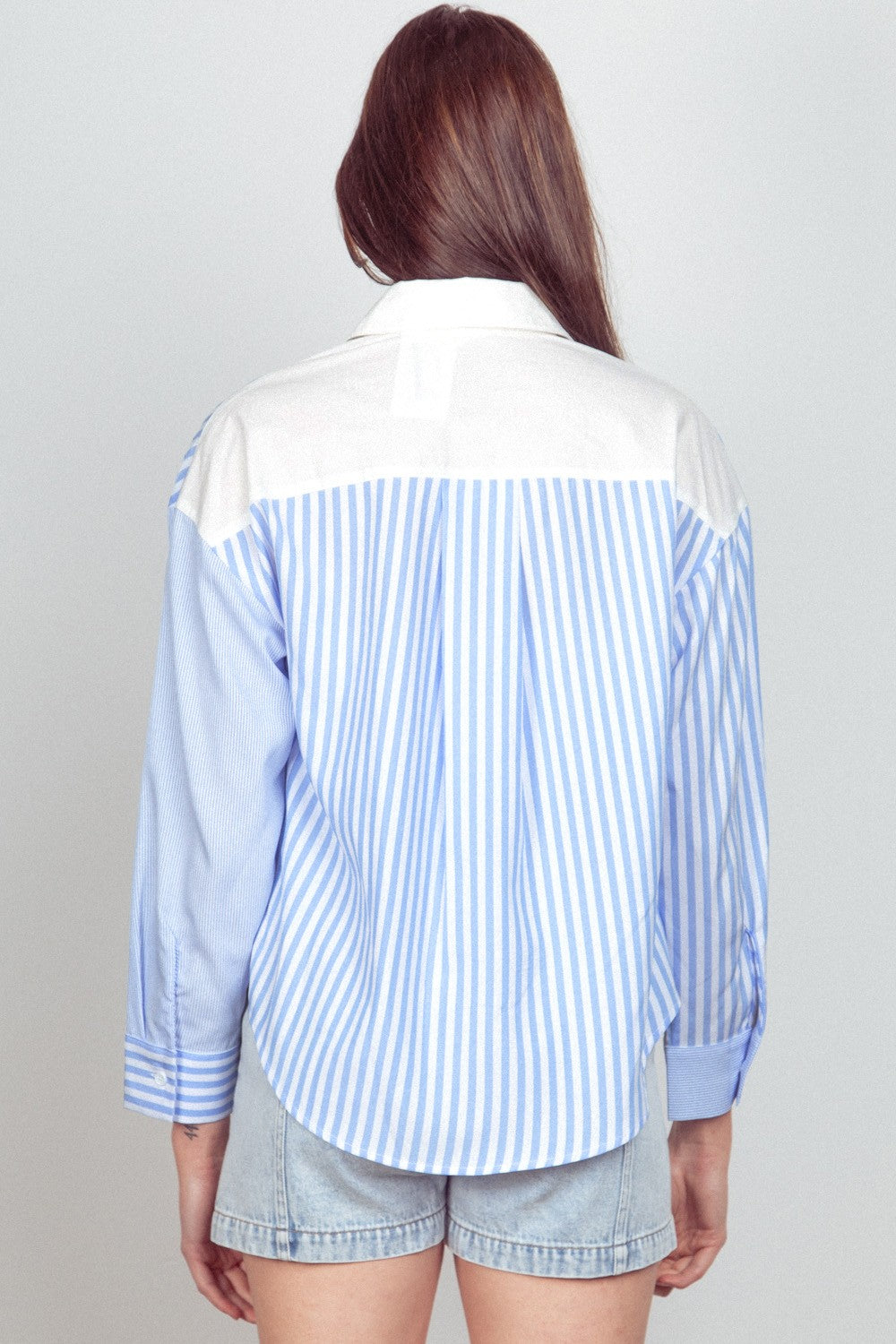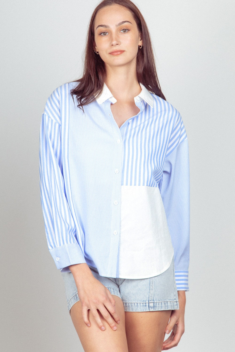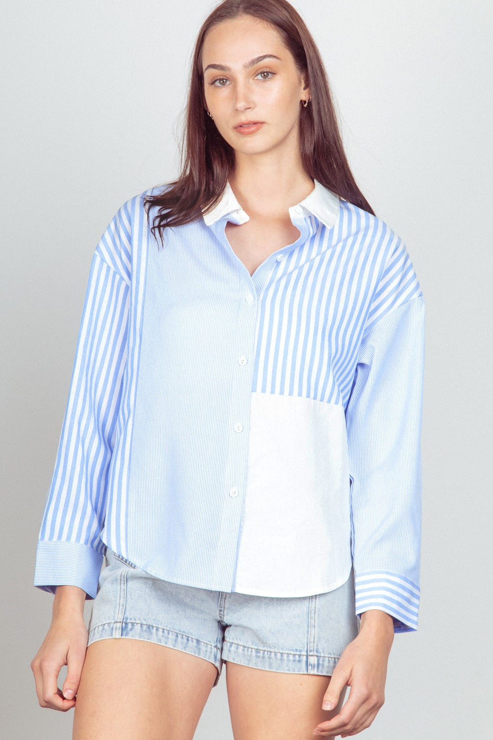 - Long Sleeve - Drop Shoulder - Collared - Button Up - Round Hem - Stripe - Oversized Shirt - Laid Back Casual Shirts - Transitional Shirts