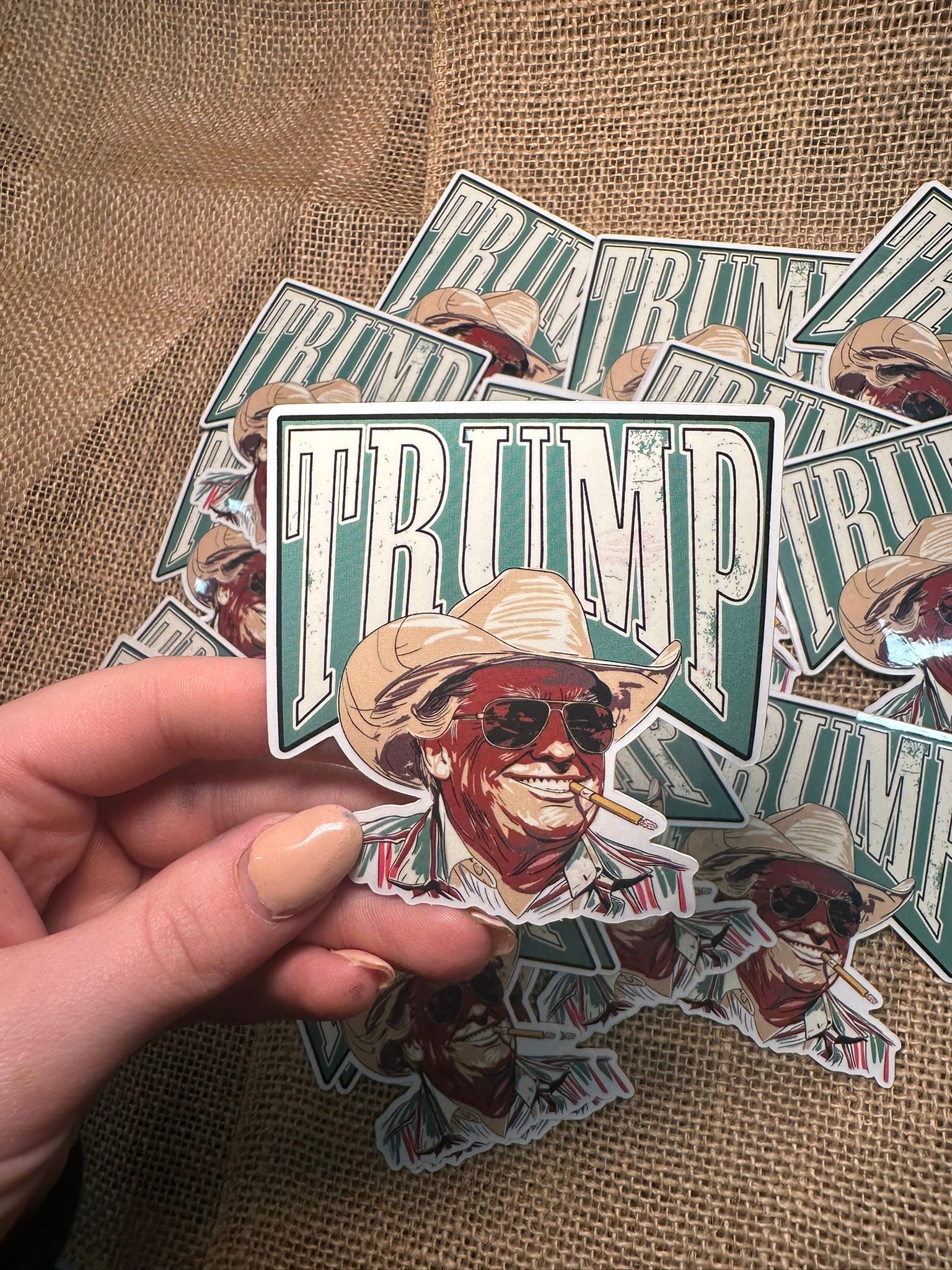 This expertly crafted sticker features a cowboy version of the current U.S. president, Donald Trump. With a size of 2.9x3 inches, it's the perfect addition to any political or western-themed collection.