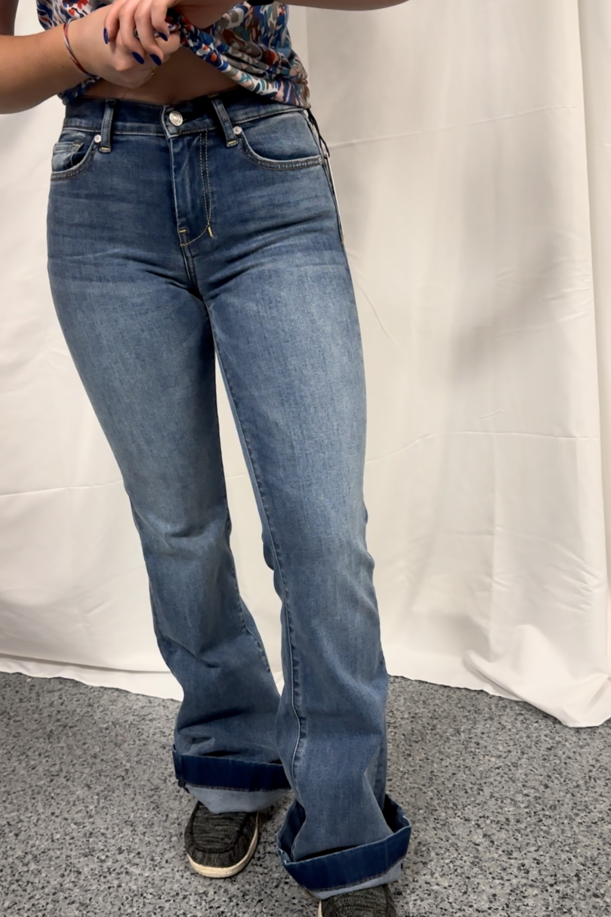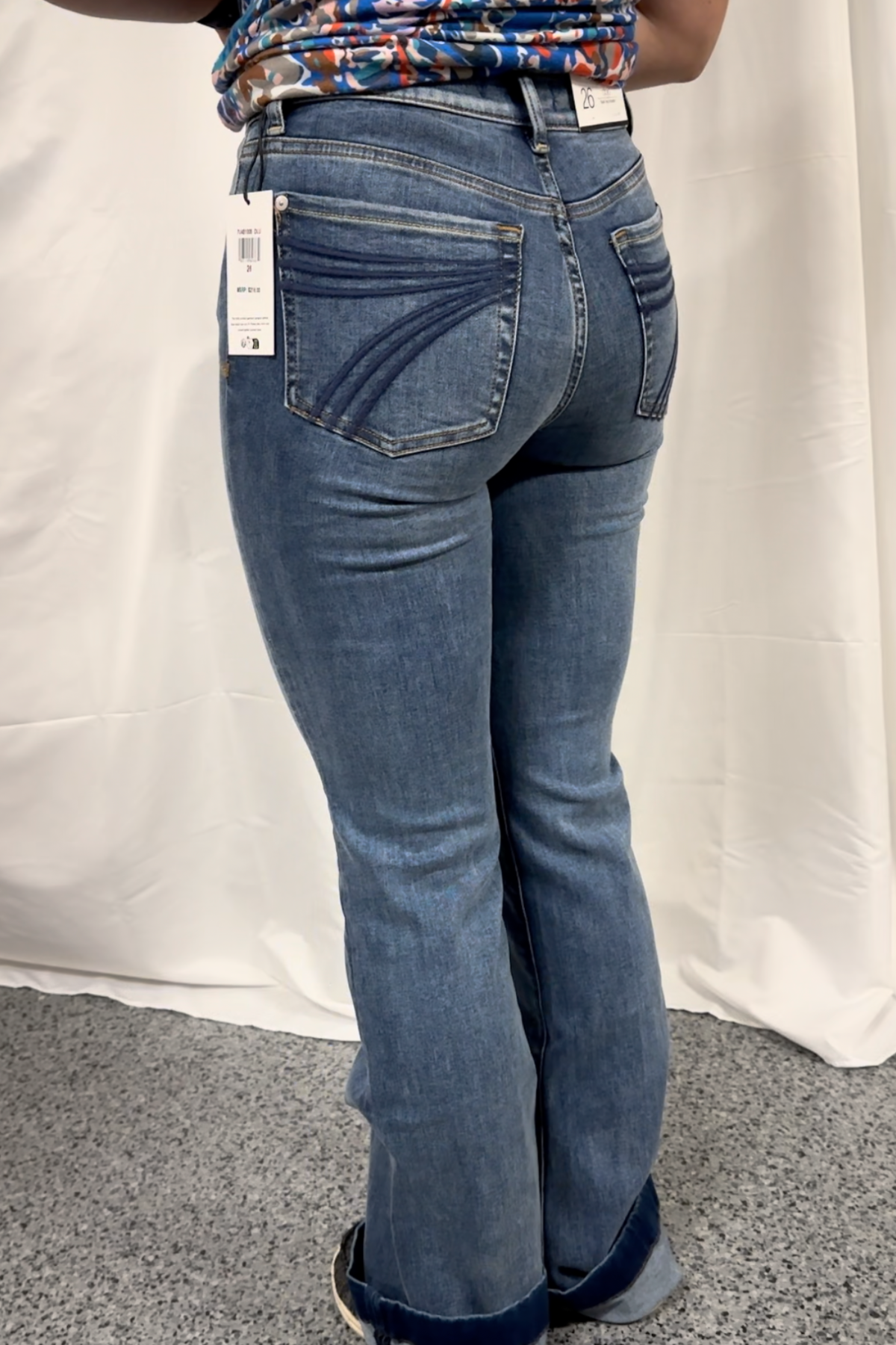 Our signature trouser jean features a wide leg with a subtle flare for a long, lean line—and the Tailorless version offers a shorter inseam while keeping the silhouette intact. The medium blue wash is artfully faded for extra dimension.