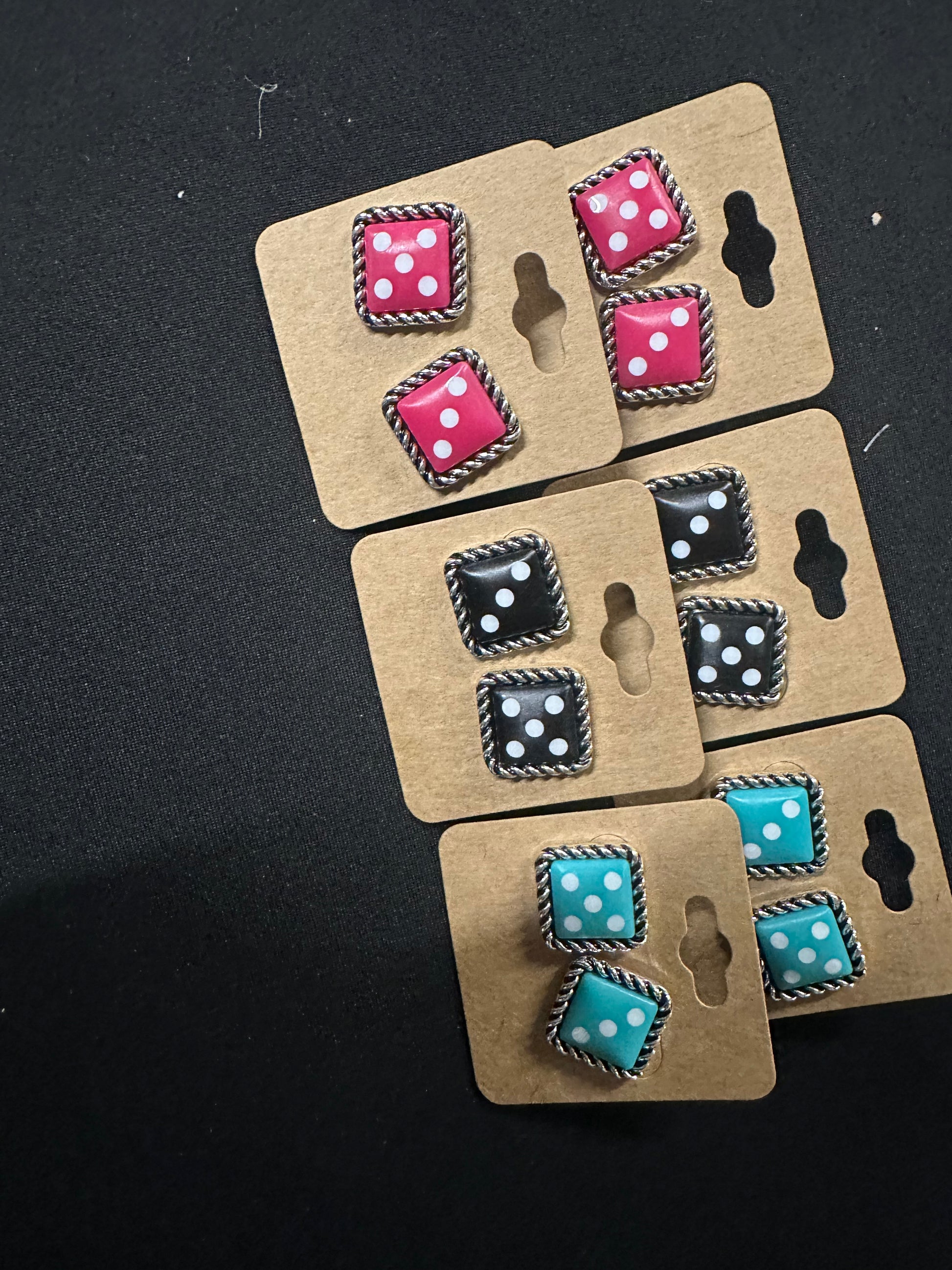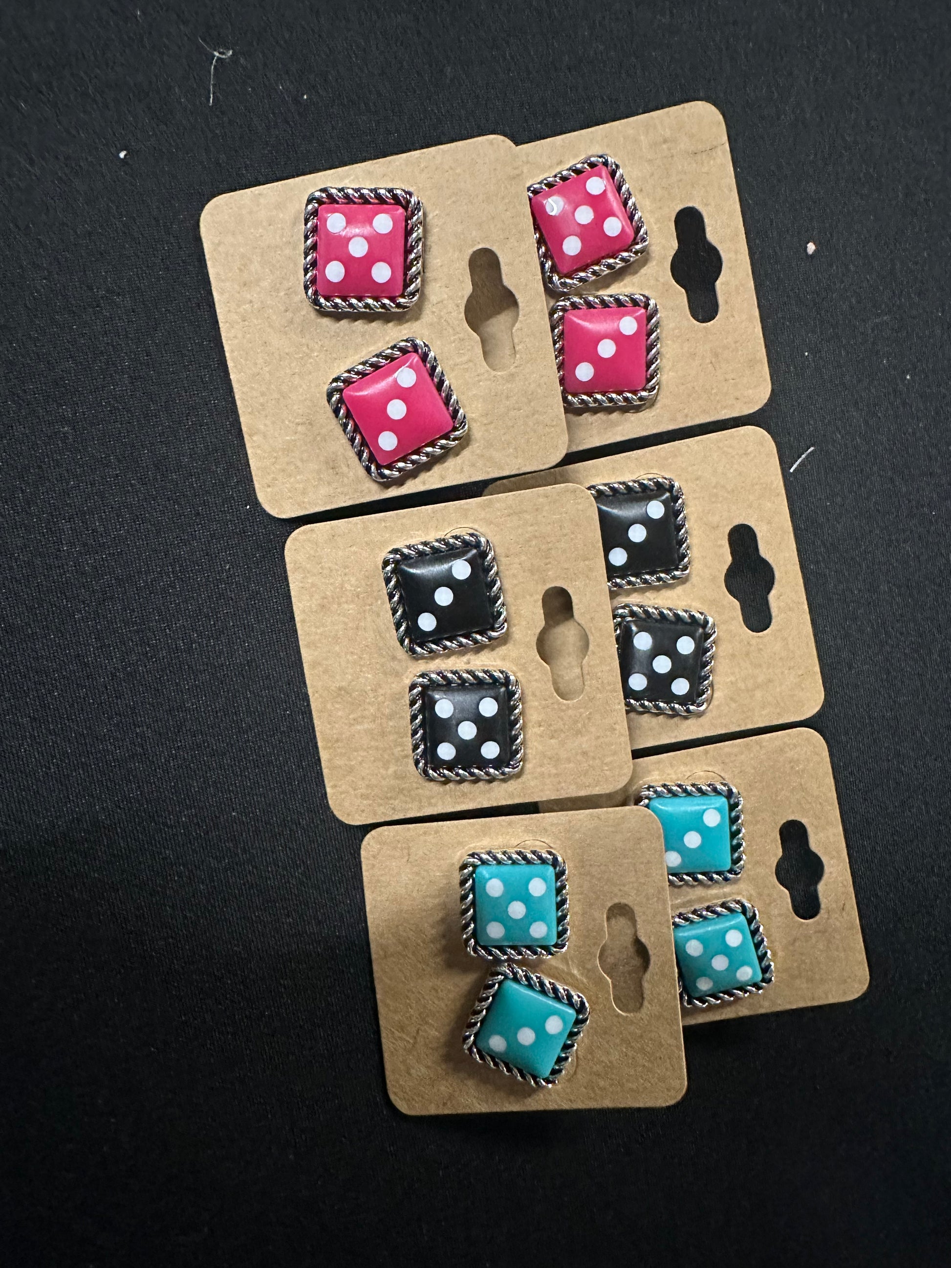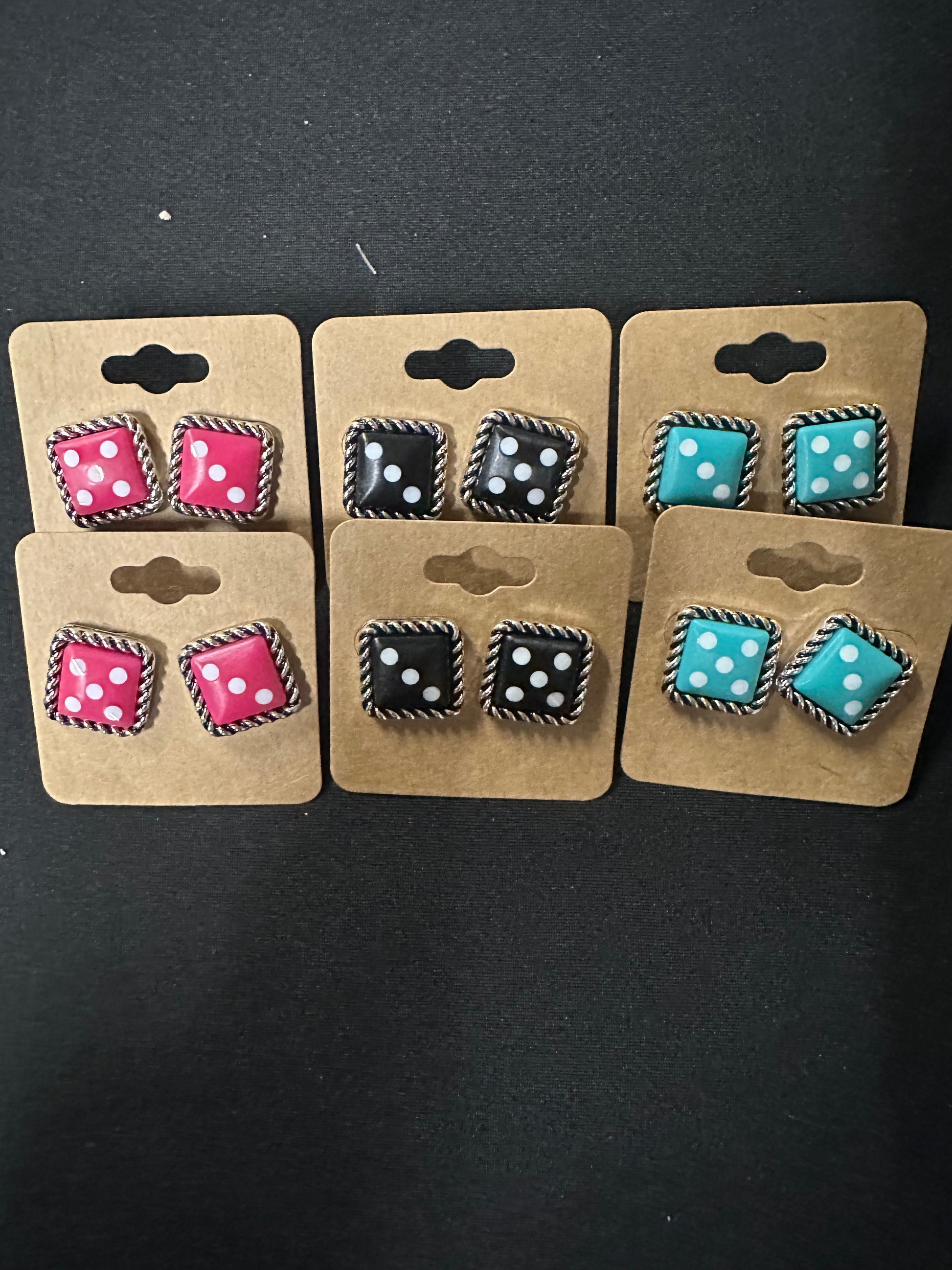 "Add a touch of whimsy to your wardrobe with our Dice Theme Stud Earrings. These three-color dice themed studs are perfect for a Western-inspired look. With their unique design, they are sure to stand out and make a statement. Upgrade your style game with these fun and playful earrings."