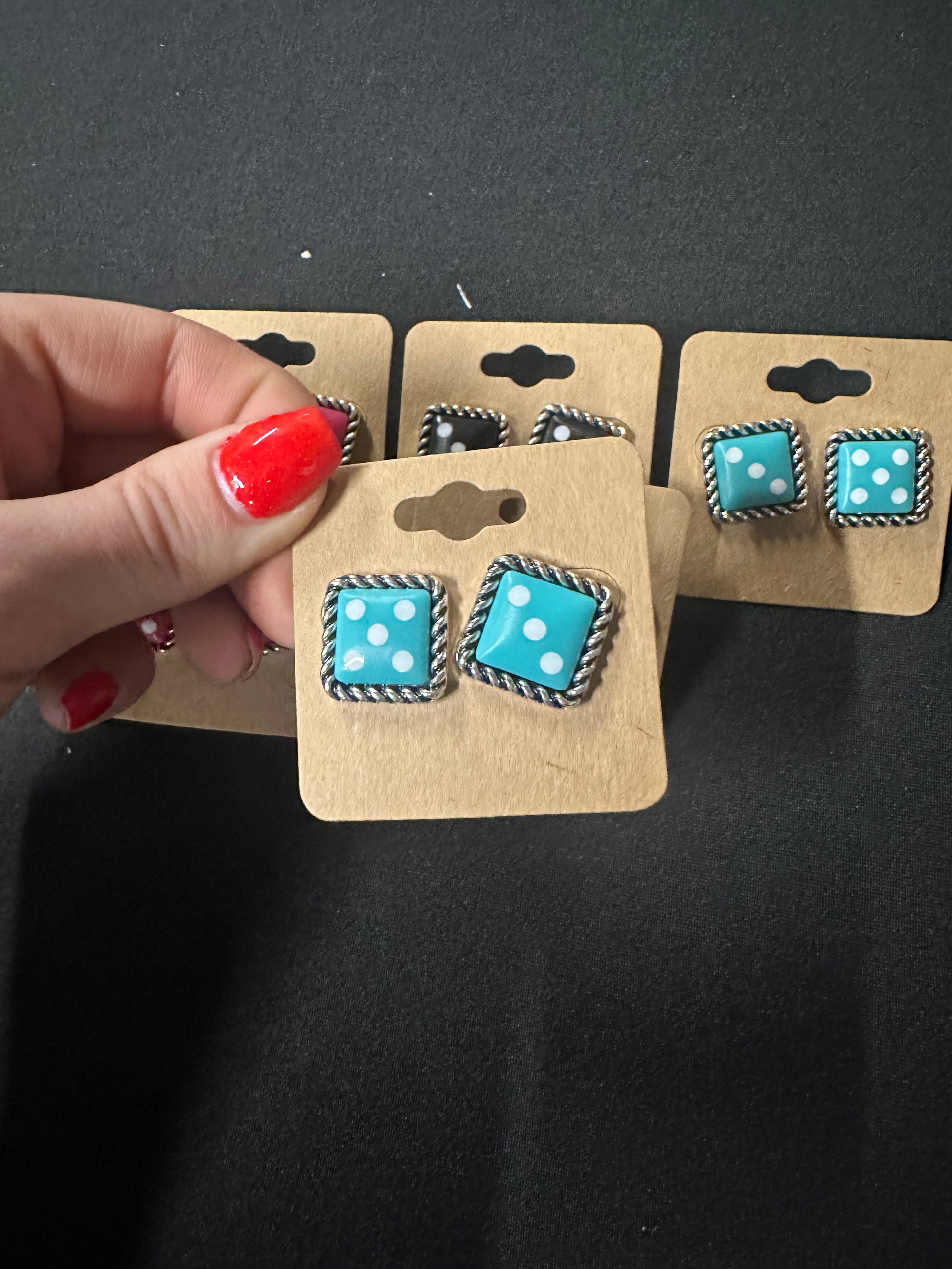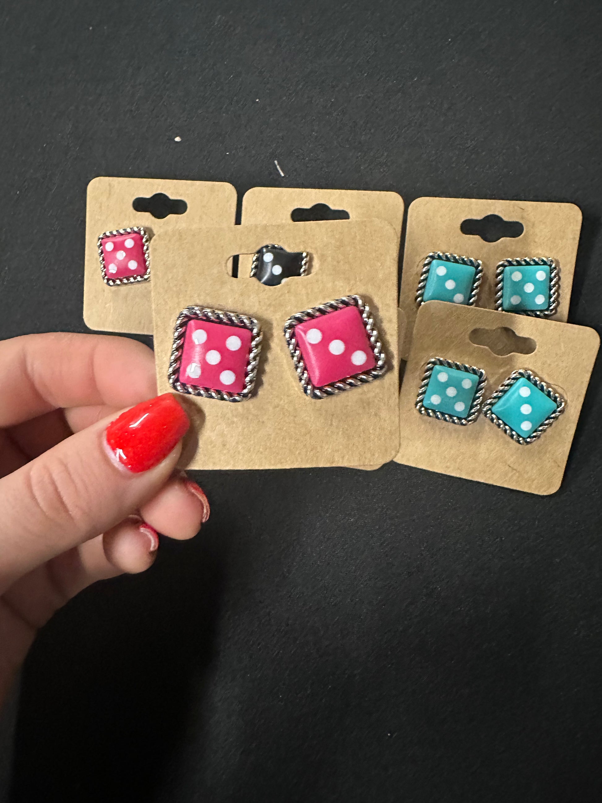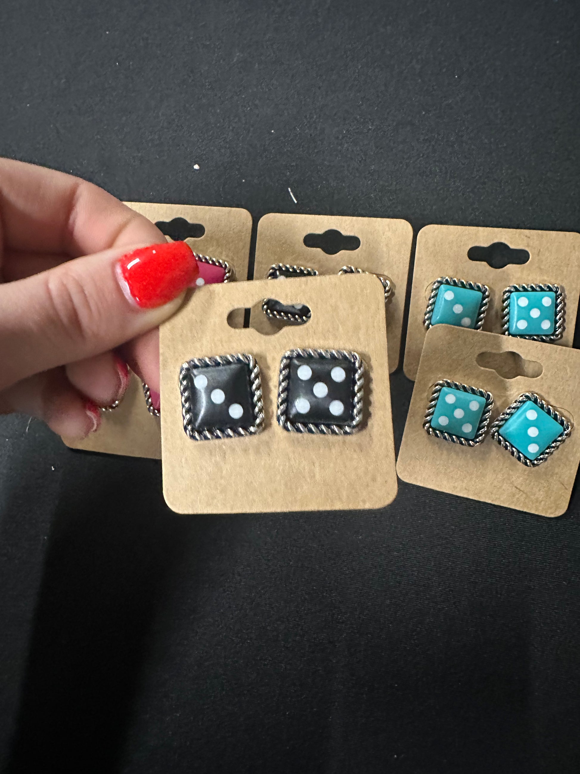 "Add a touch of whimsy to your wardrobe with our Dice Theme Stud Earrings. These three-color dice themed studs are perfect for a Western-inspired look. With their unique design, they are sure to stand out and make a statement. Upgrade your style game with these fun and playful earrings."