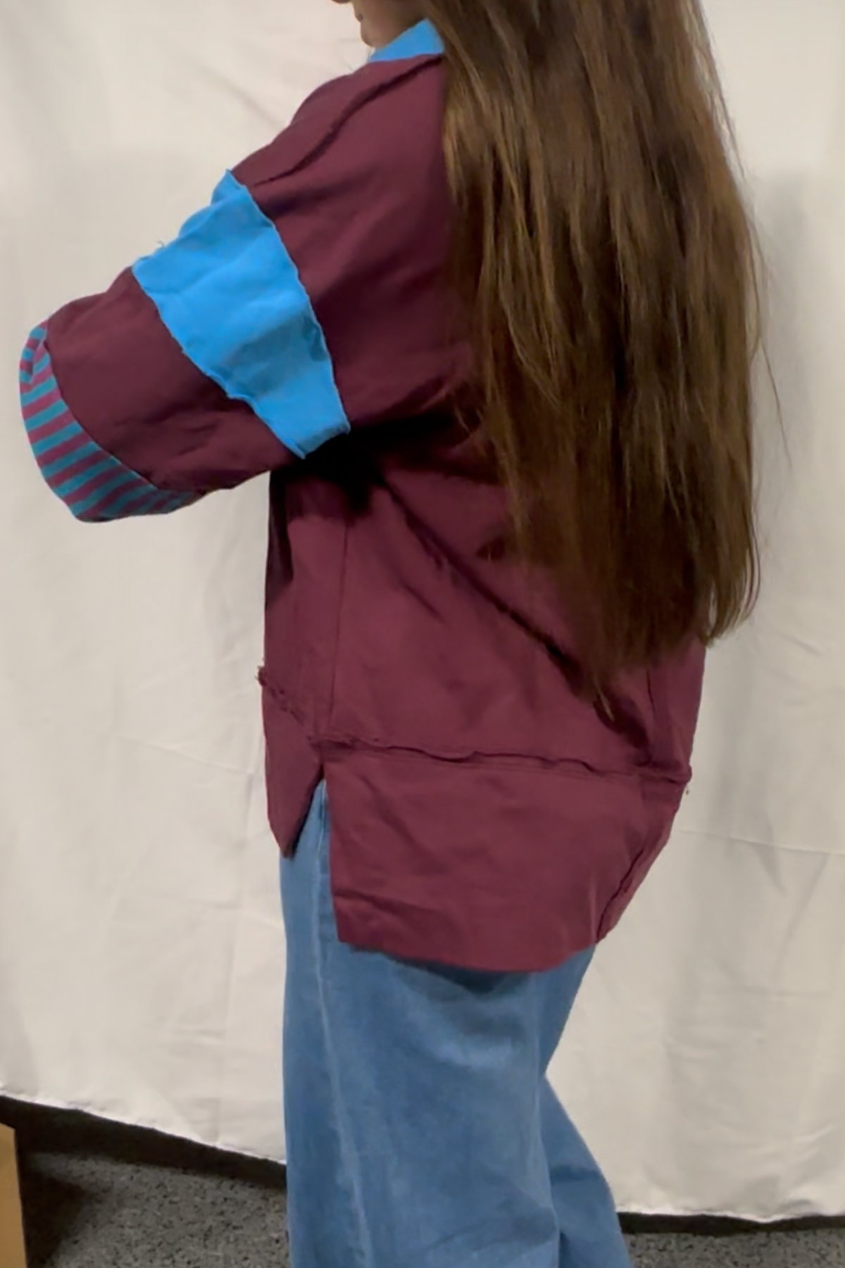 Long puff sleeves fabric mix match hi-low top, side slit, raw cut edge detail.