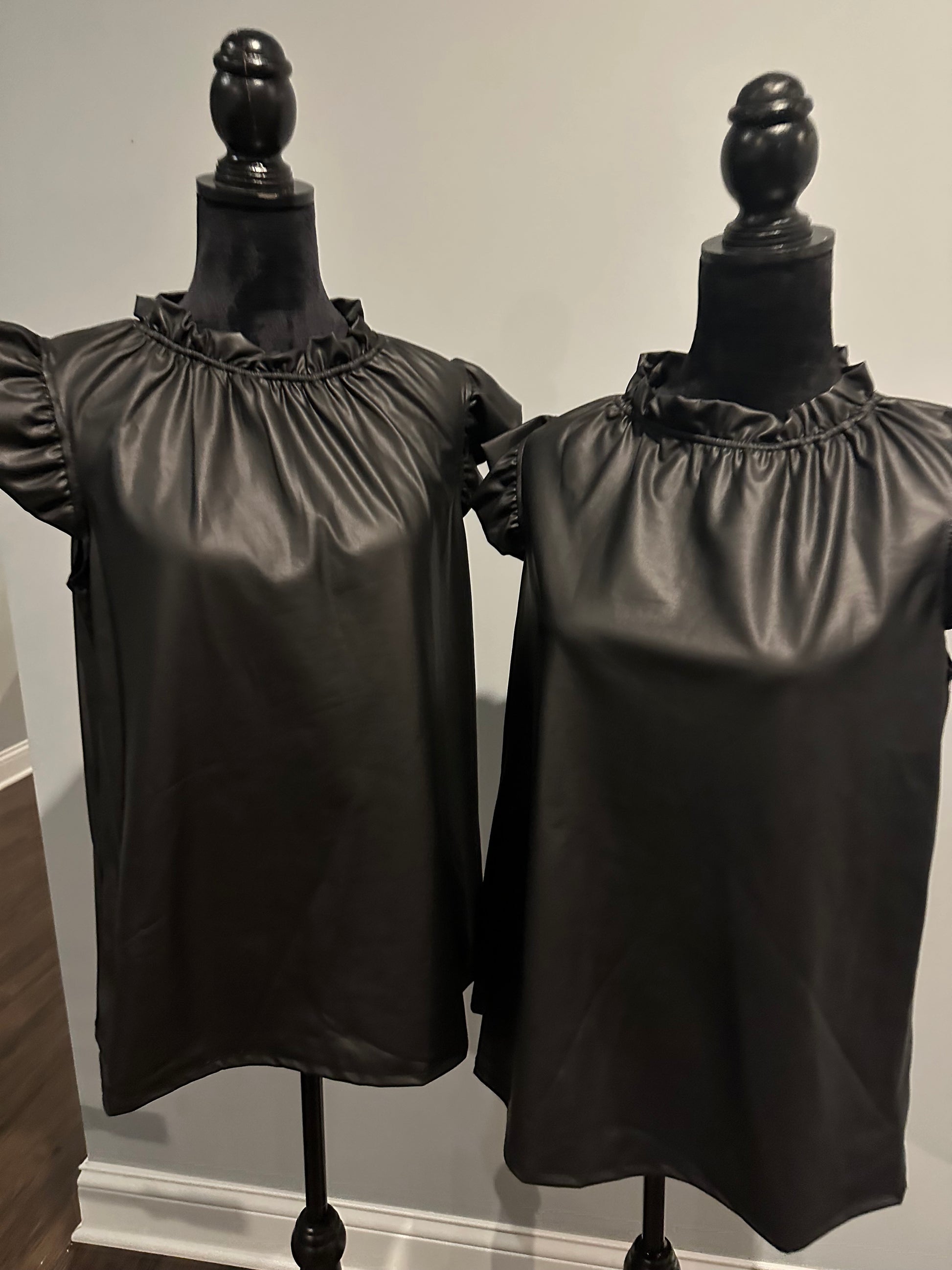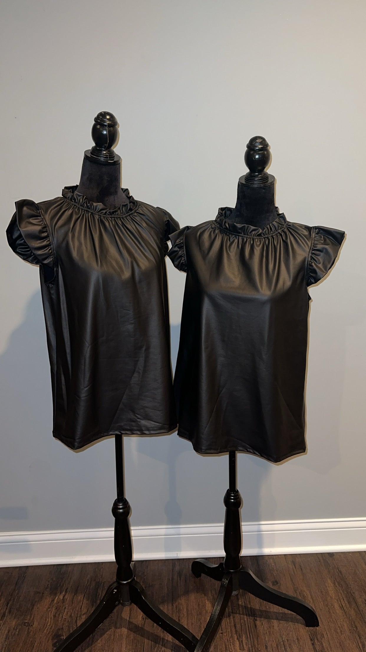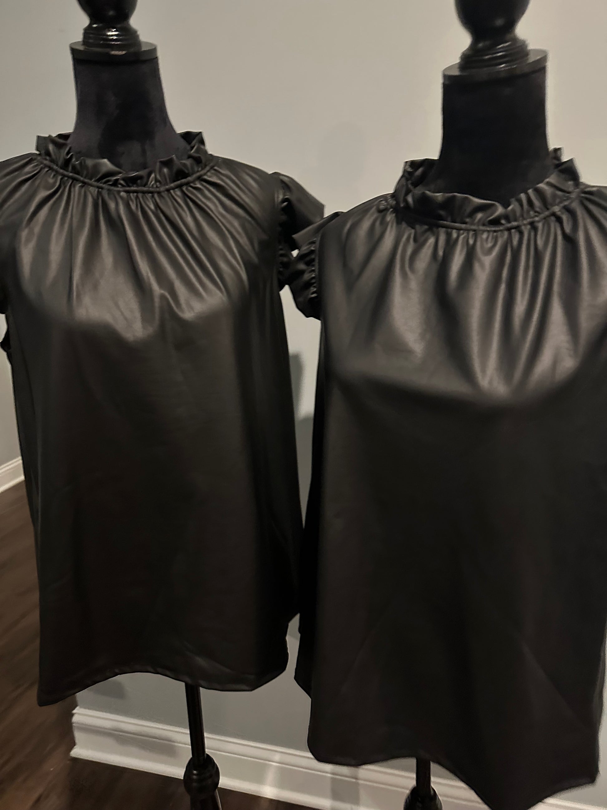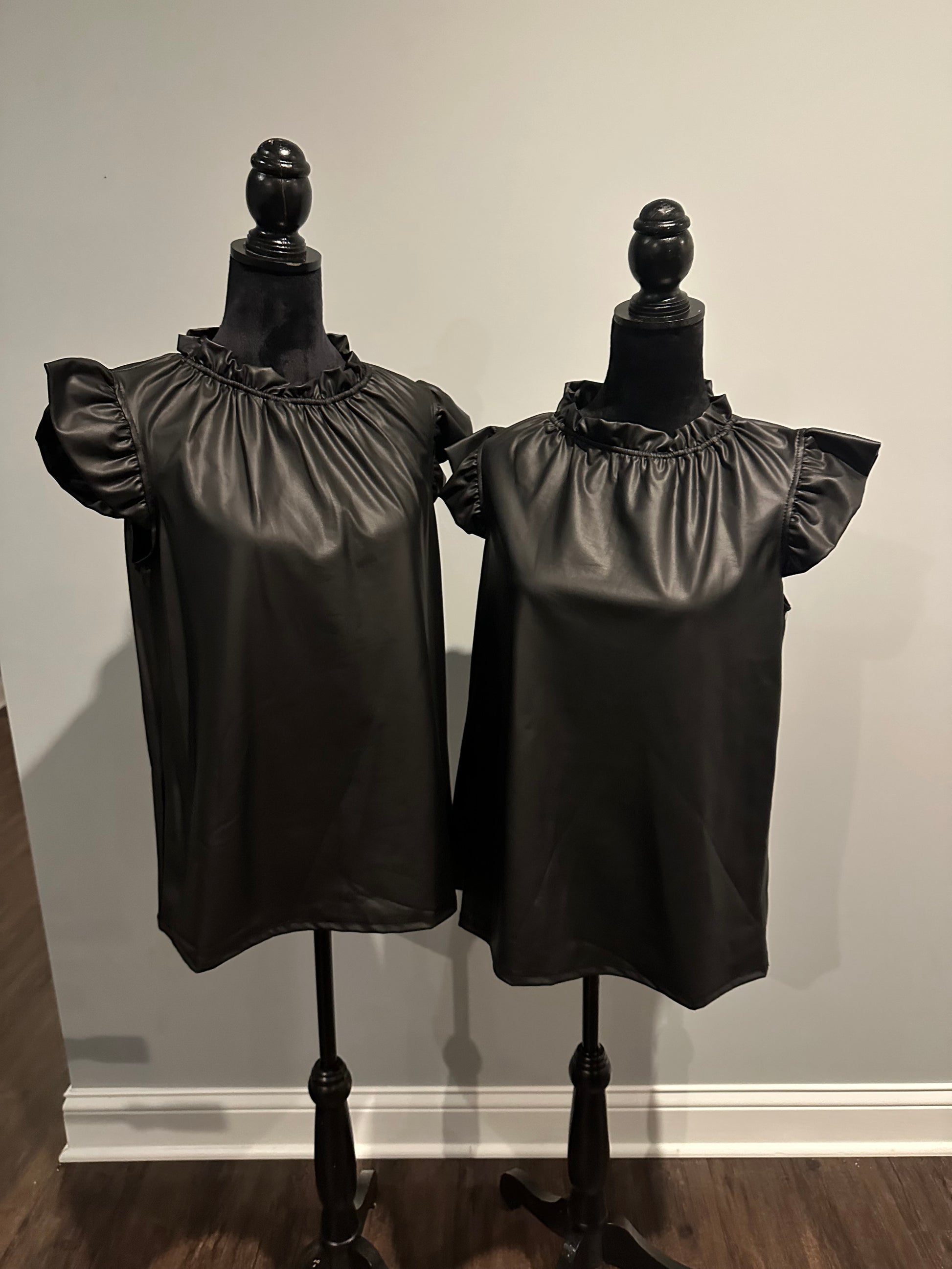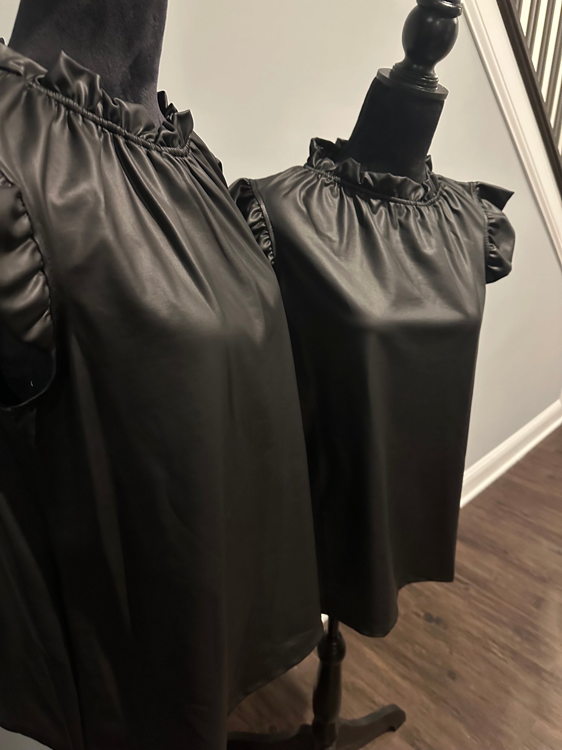 Introducing the FAUX LEATHER RUFFLE NECK FLUTTER SLEEVE TOP - a sophisticated and versatile addition to your wardrobe. With its elegant ruffled neckline and delicate flutter sleeves, this top exudes effortless style and charm. Crafted with faux leather, it offers a luxurious look without compromising on comfort. Perfect for any occasion, this top is a must-have for every fashion-forward individual.