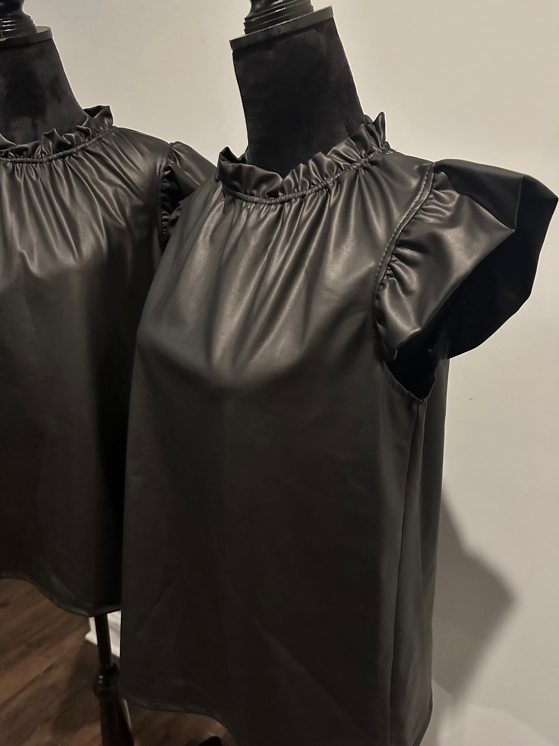 FAUX LEATHER RUFFLE NECK FLUTTER SLEEVE TOP