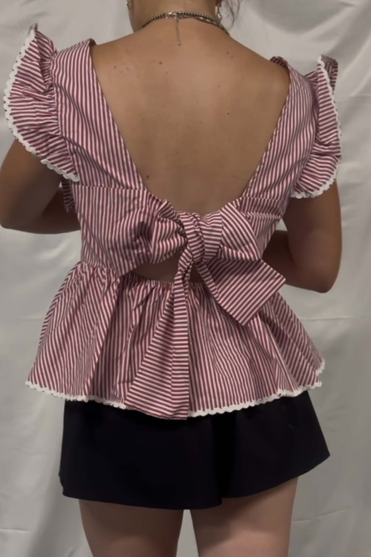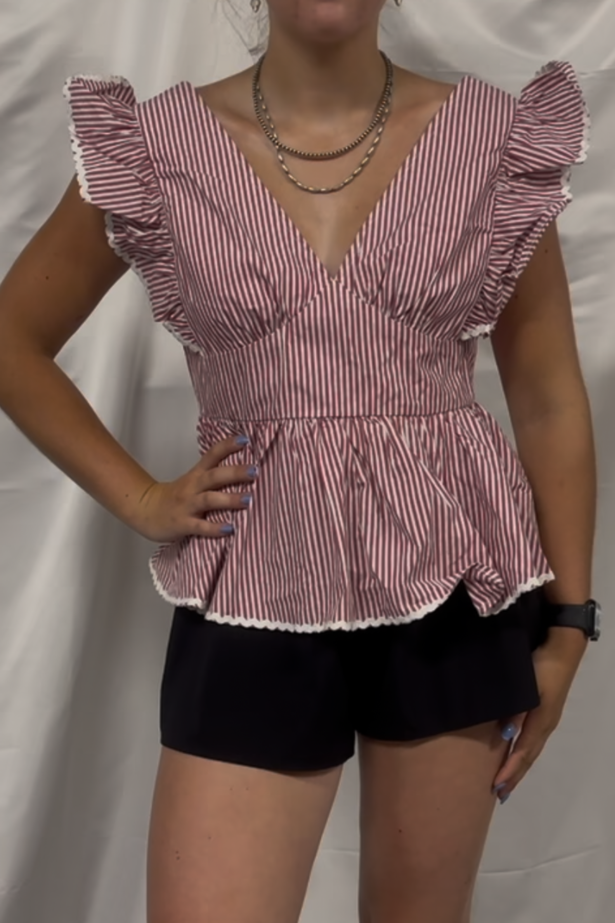 Gameday color cotton yarn dye striped peplum top with flutter sleeve and ricrac trim