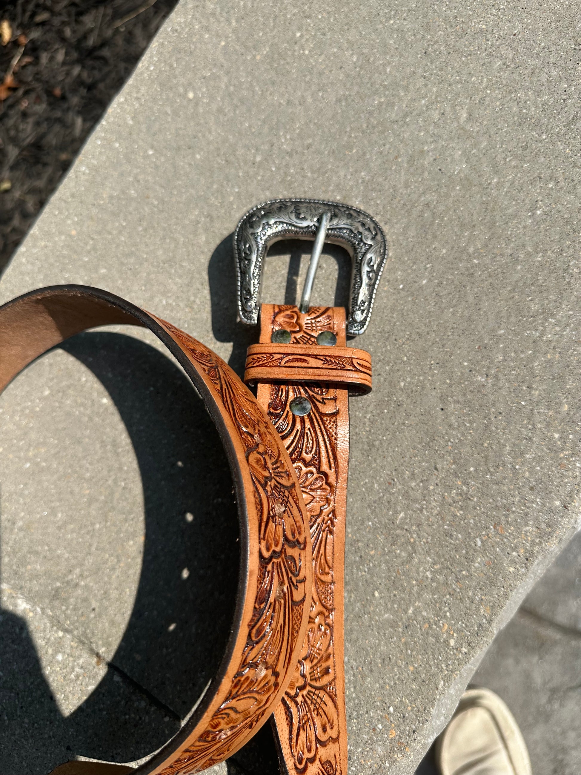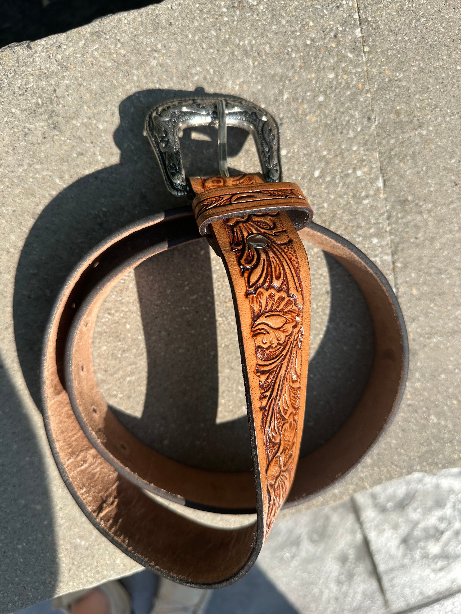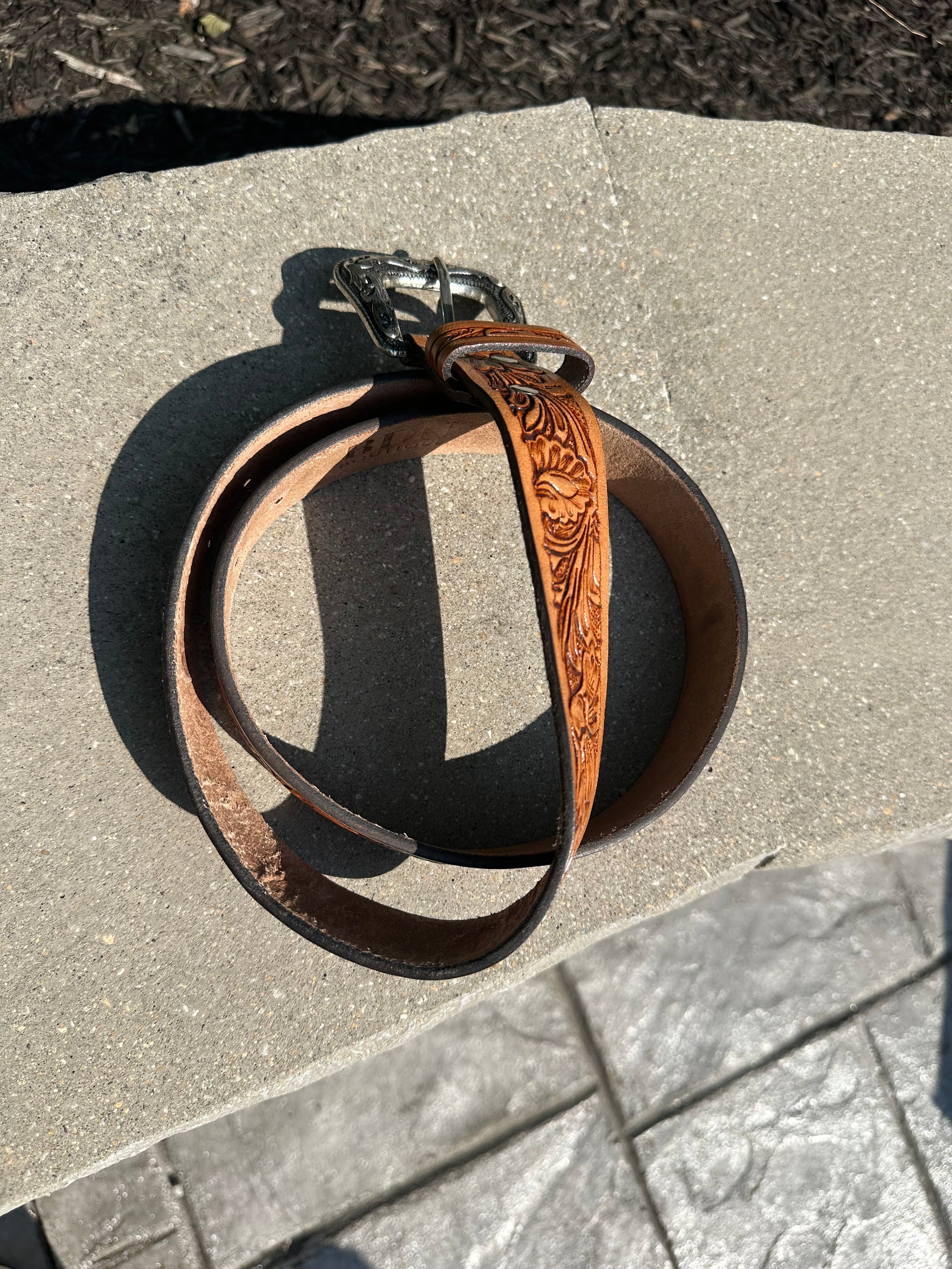 tooled leather, light brown, muliple sizes and holes, metal buckle, belt