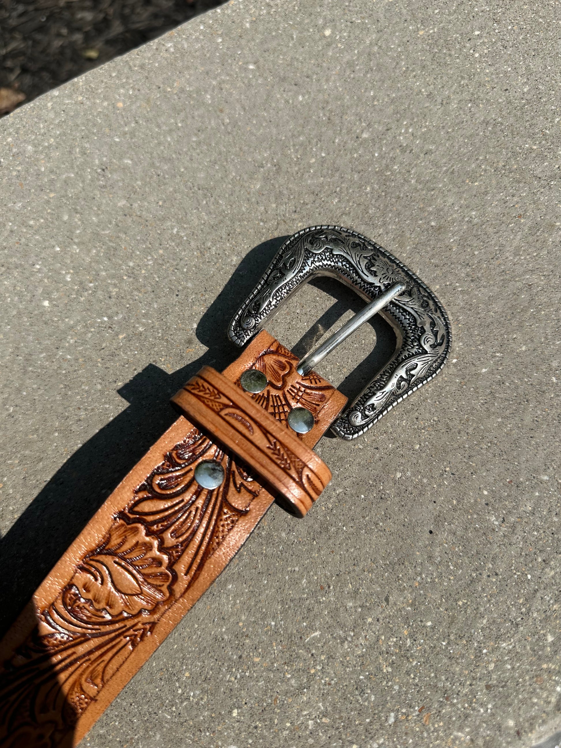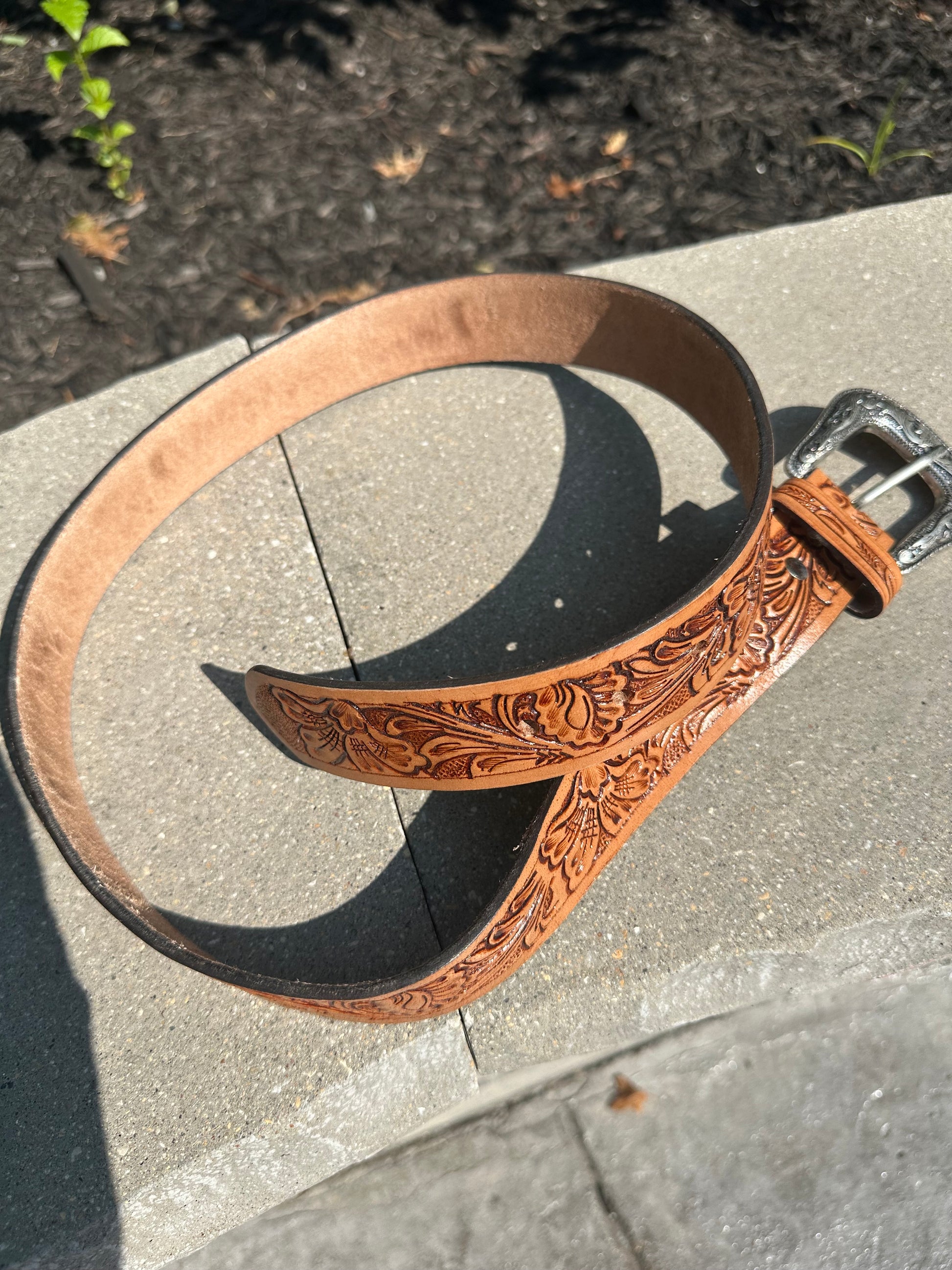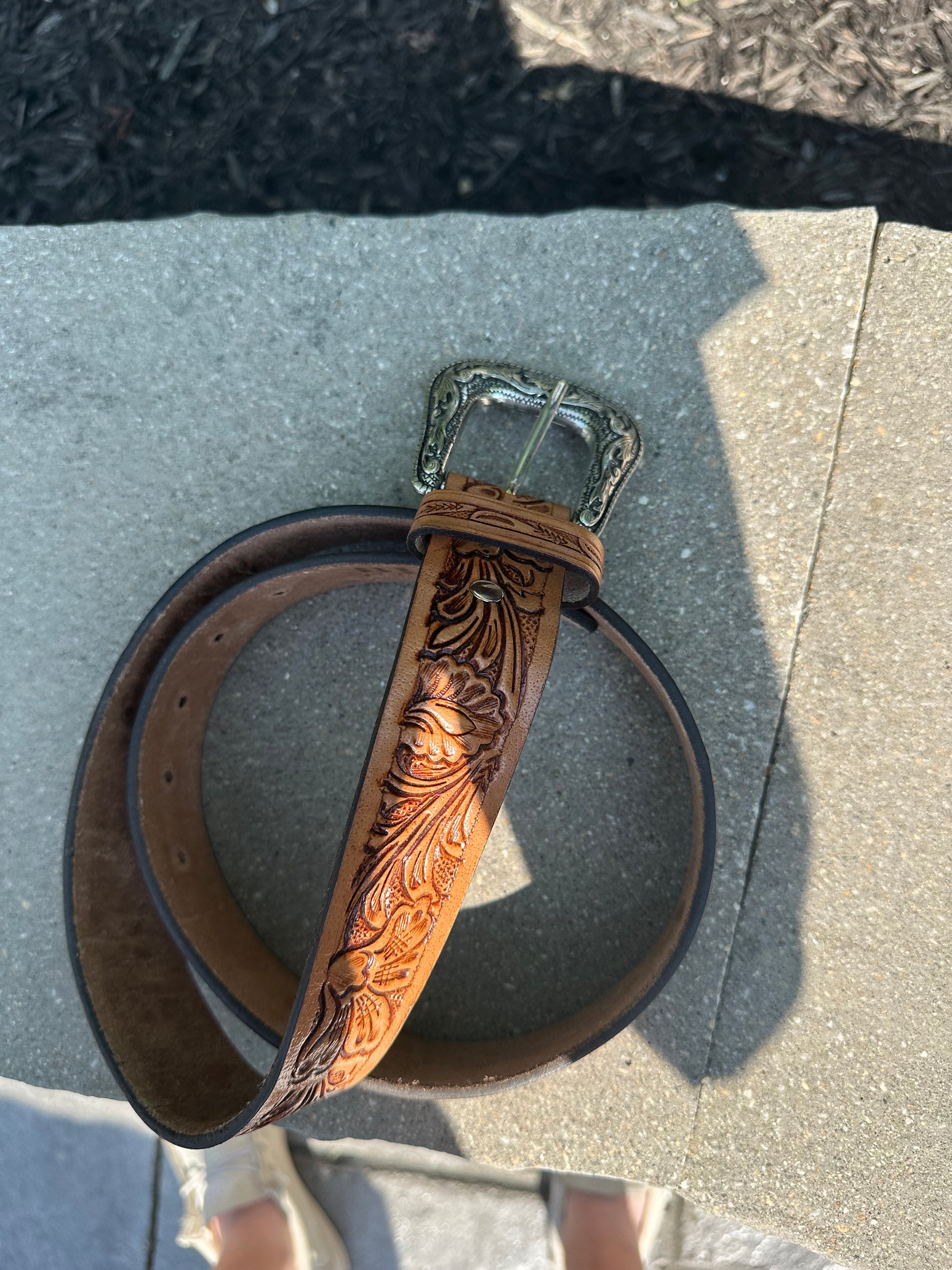 tooled leather, light brown, muliple sizes and holes, metal buckle, belt