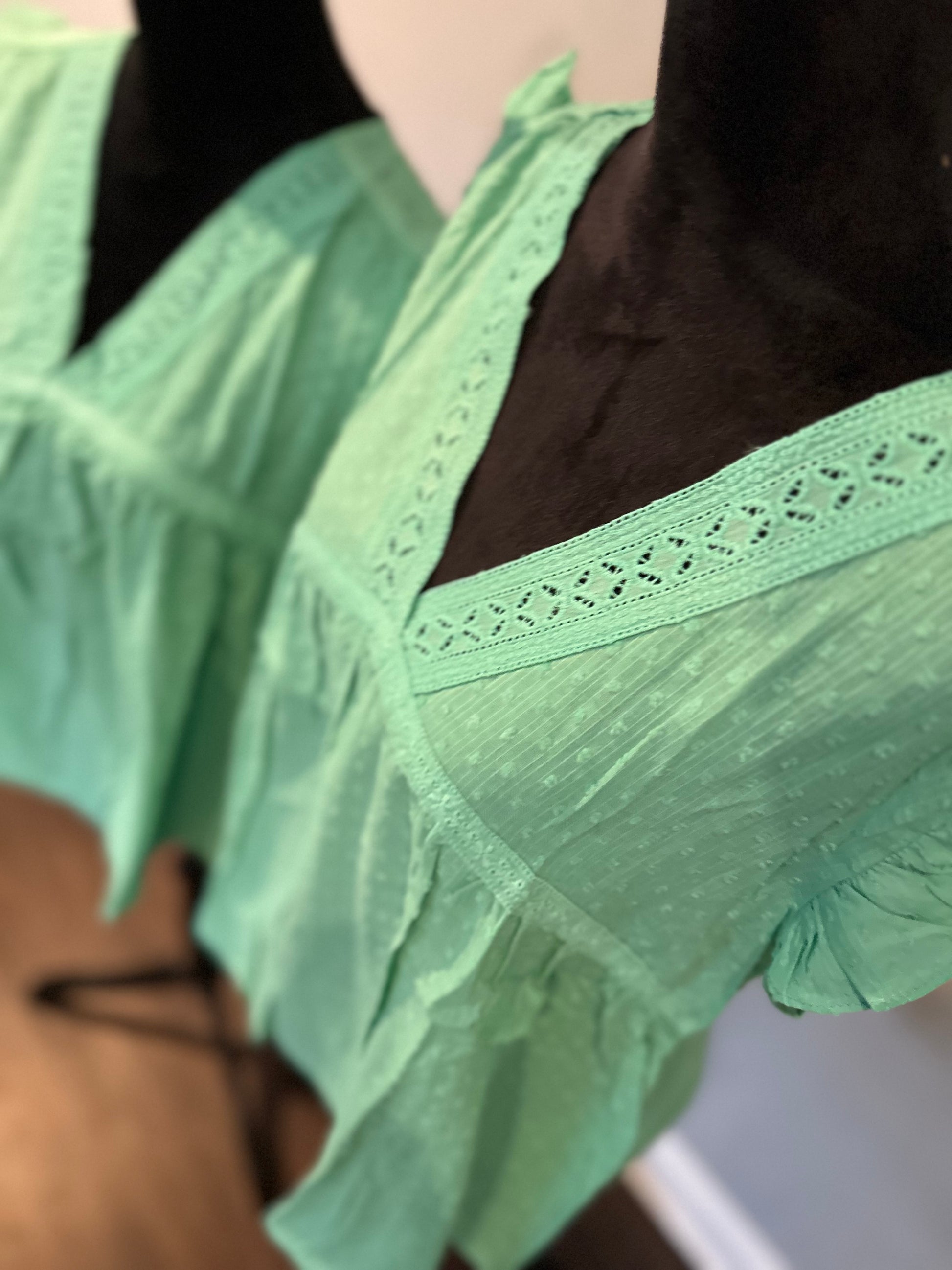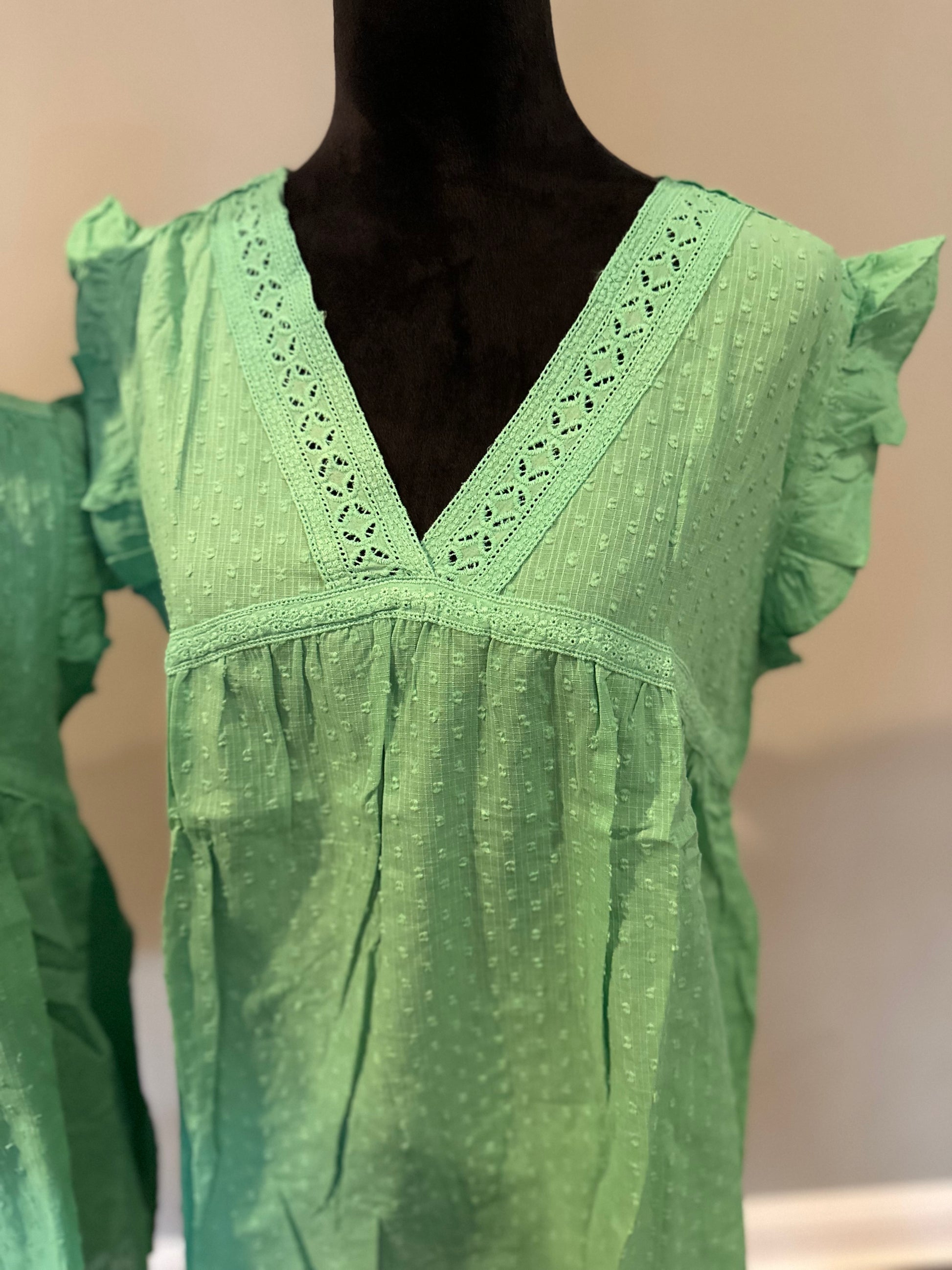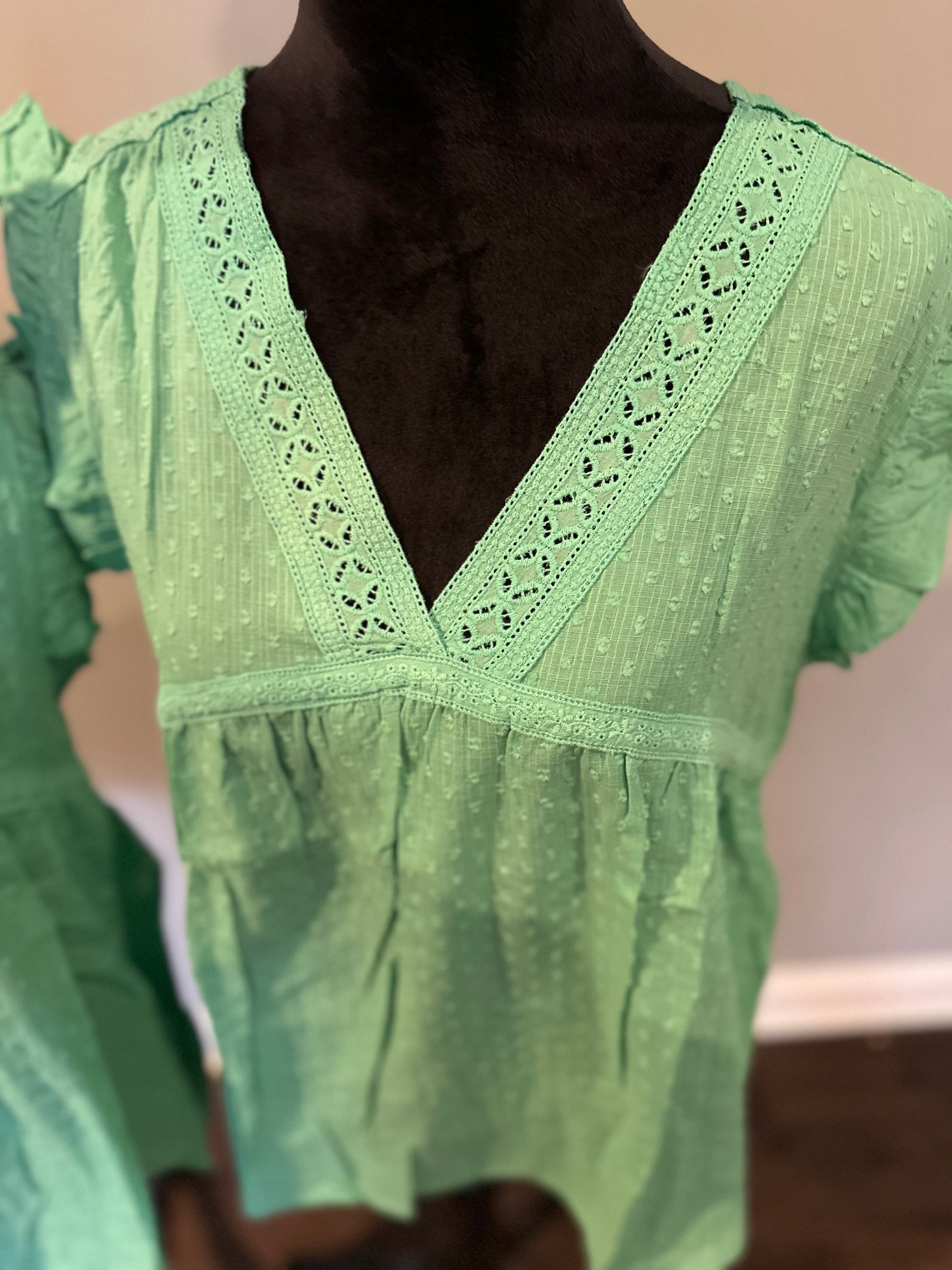 Green eyelet v neckline ruffle Swiss dot top