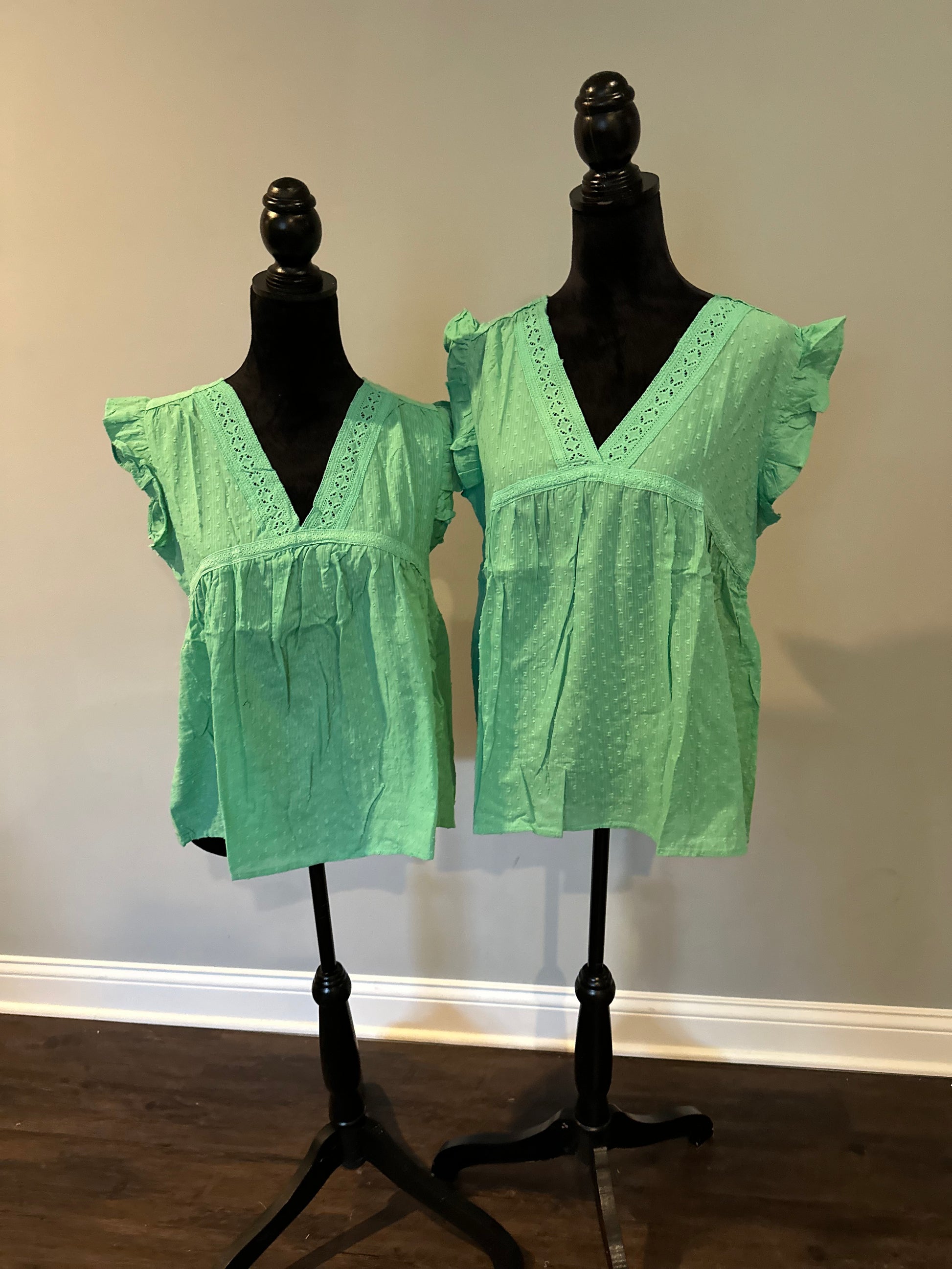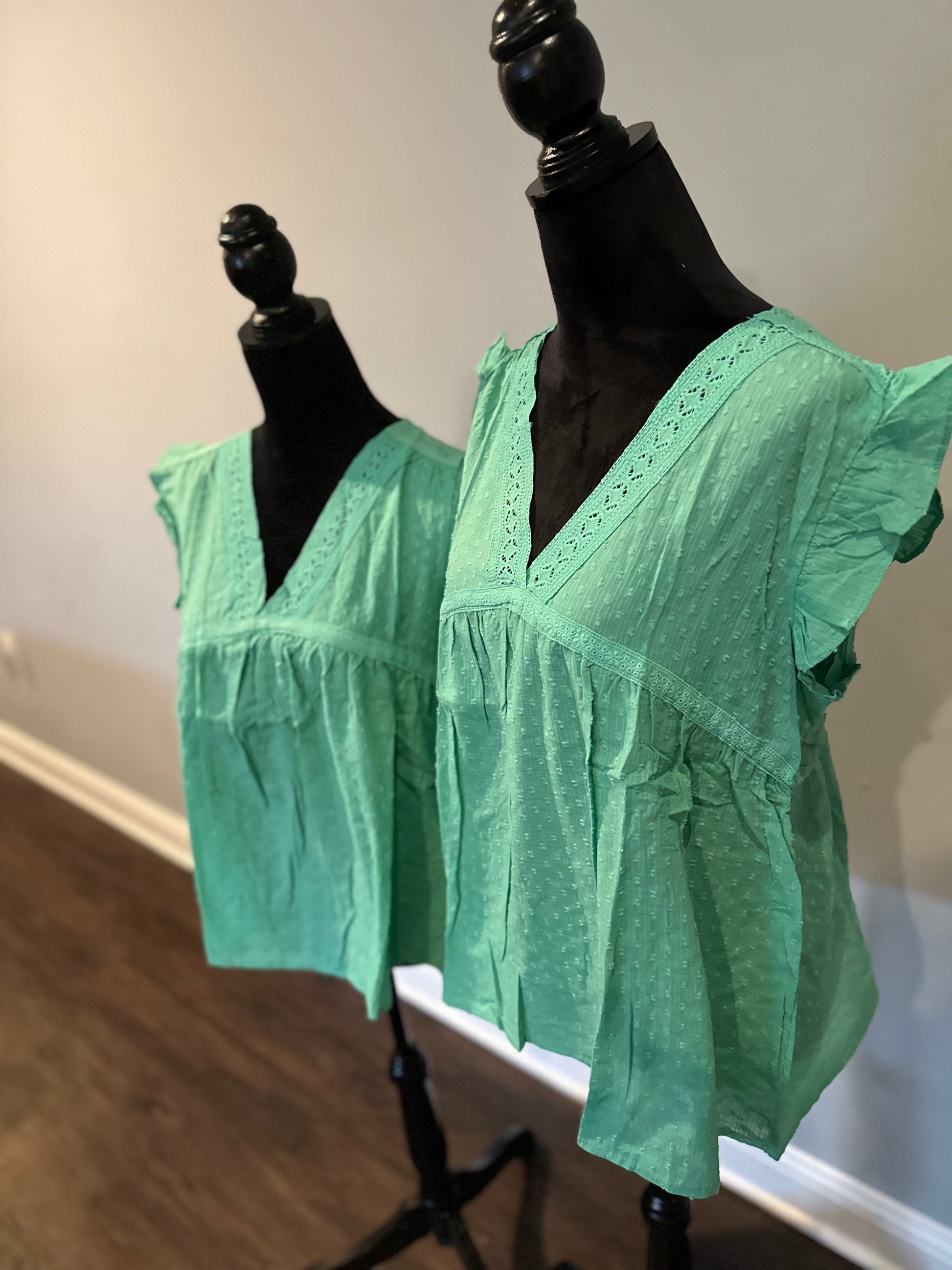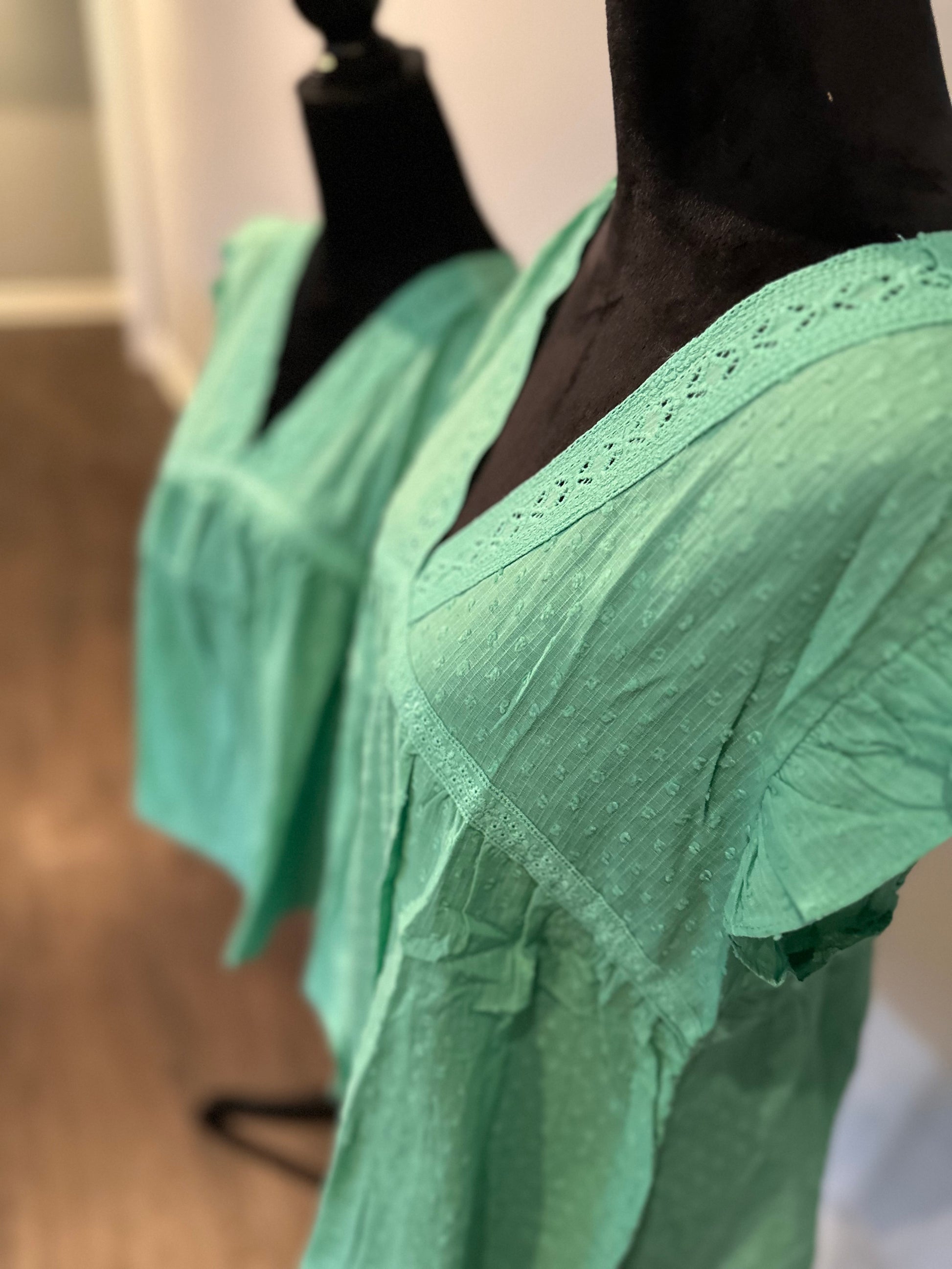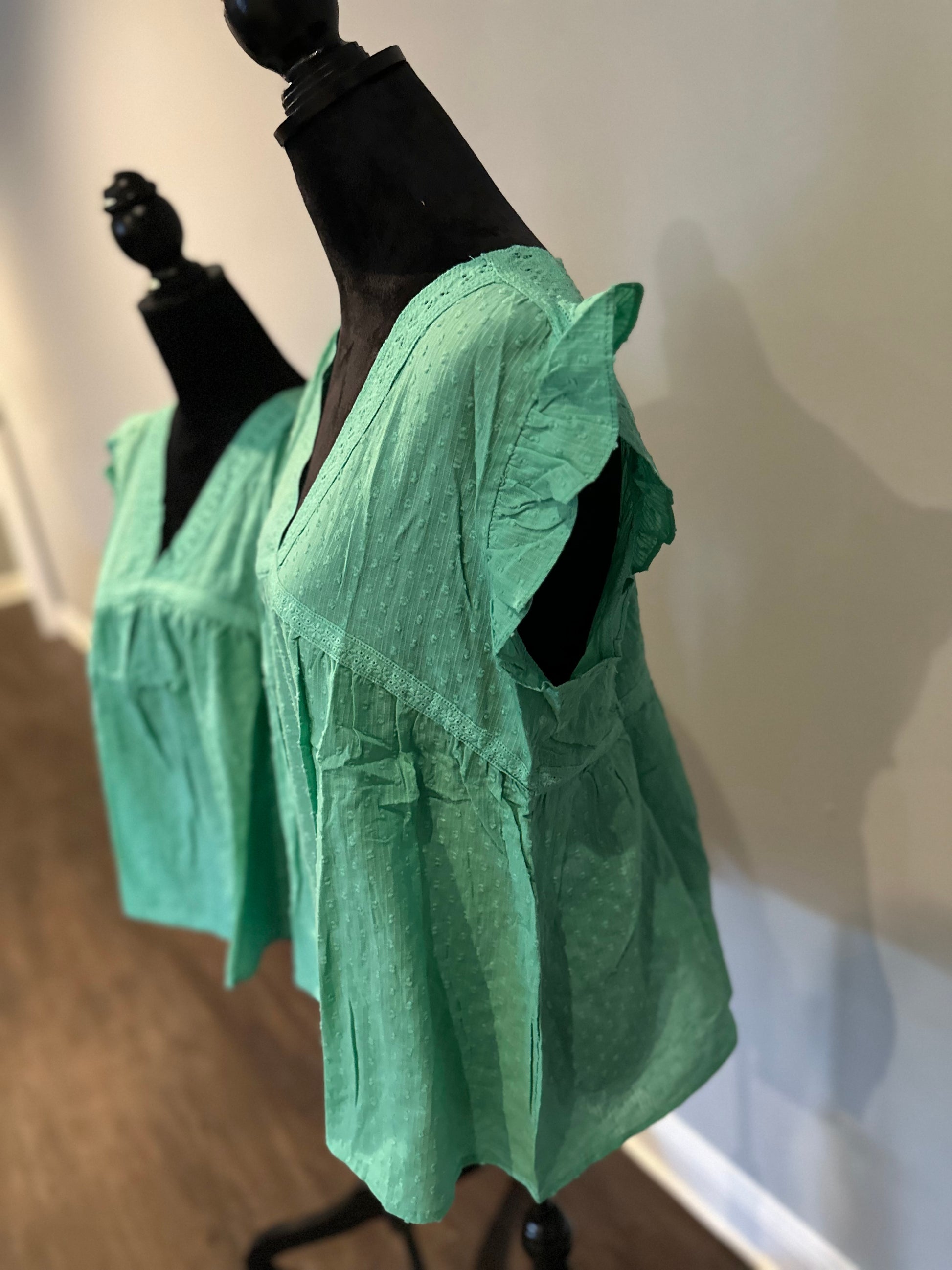 Green eyelet v neckline ruffle Swiss dot top