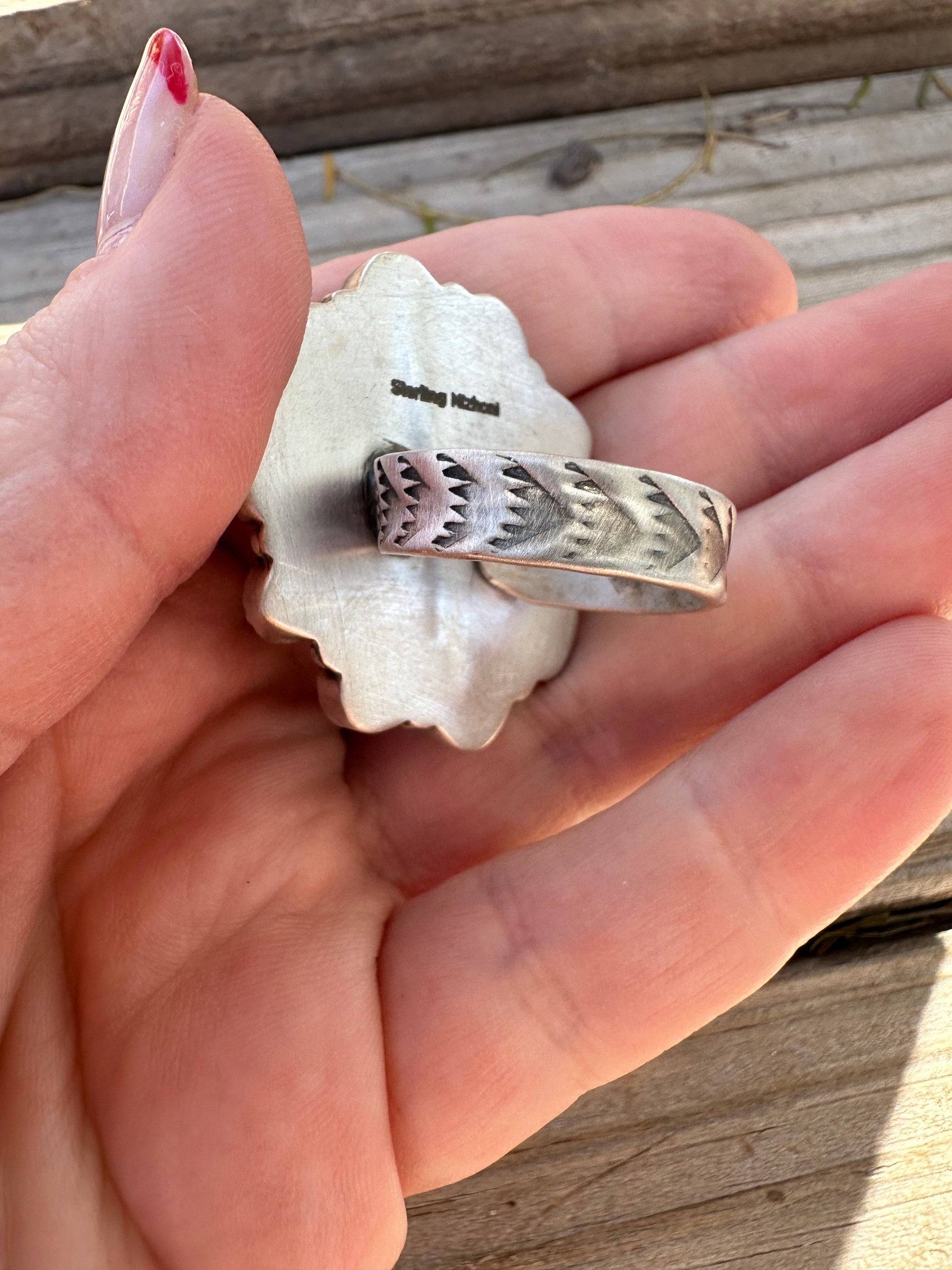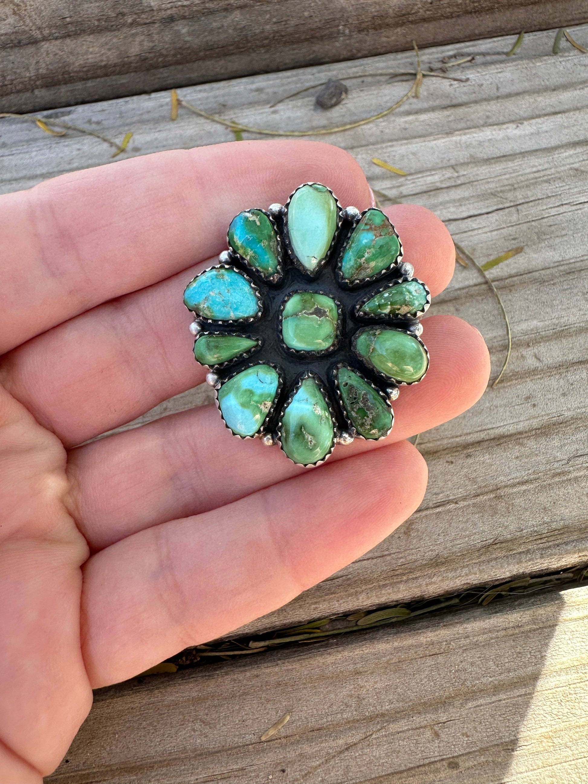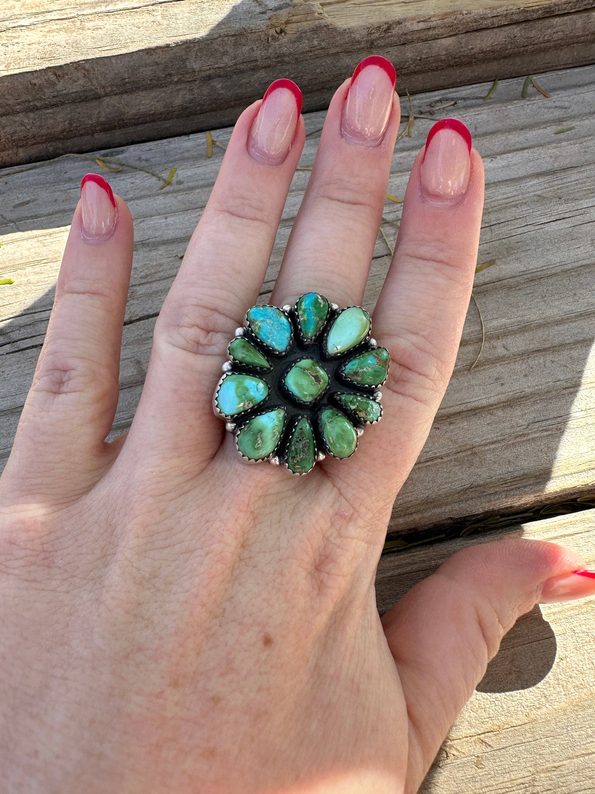 Handmade Sterling Silver and Sonoran Mountain Turquoise ring . Classic elegant style of the Southwest. Measuring 1.5 inch long and 1 1/4 inch wide. Size is adjustable. Signed and Stamped Sterling. Beautiful Stones.