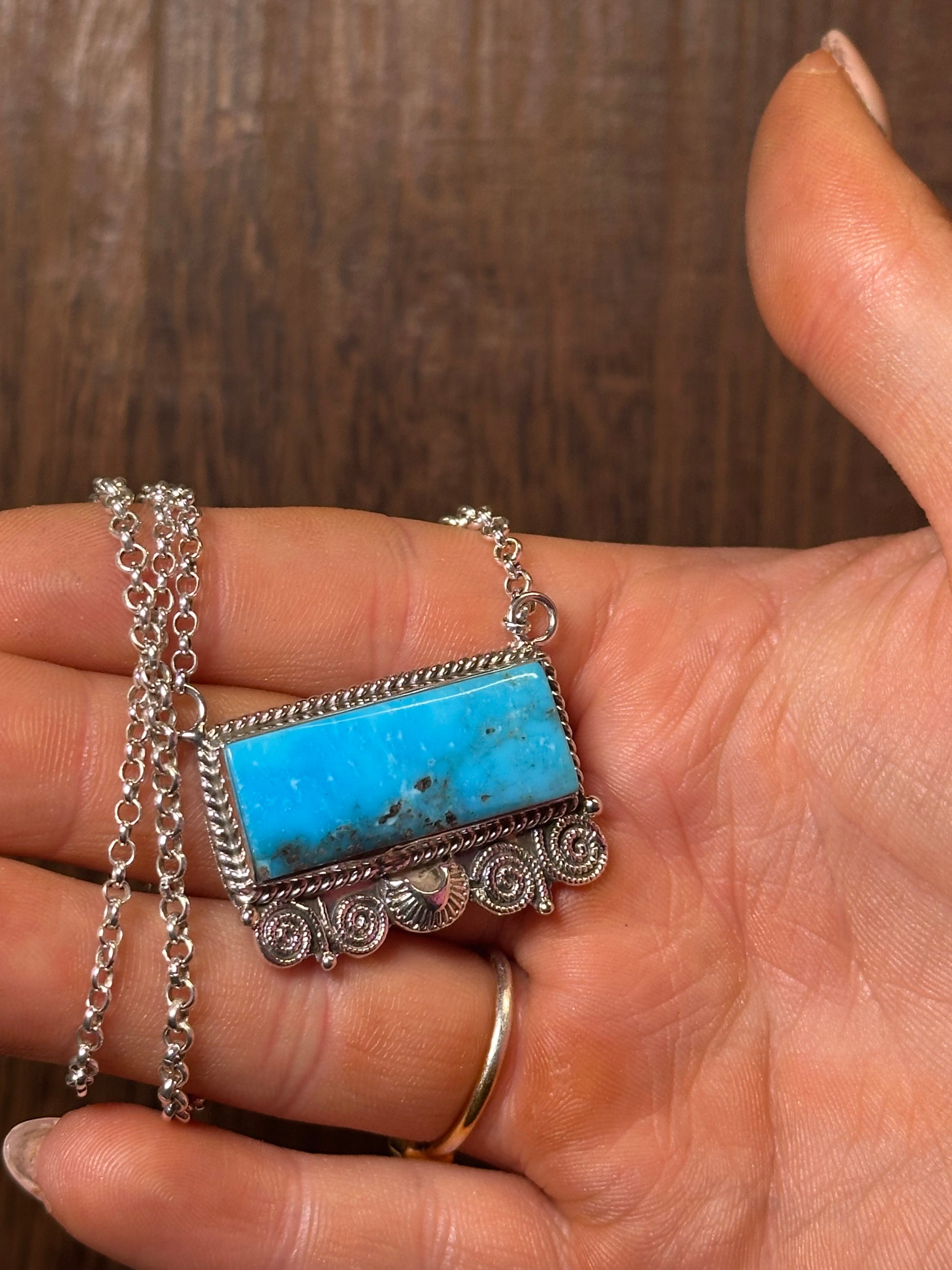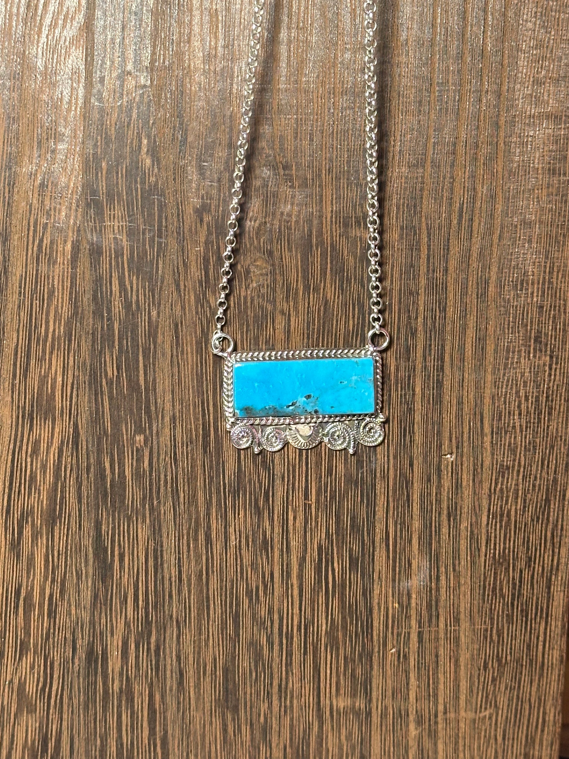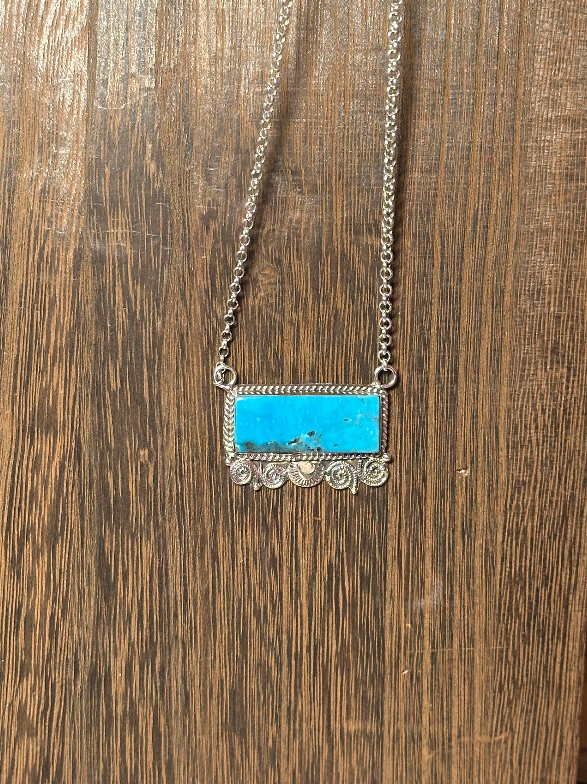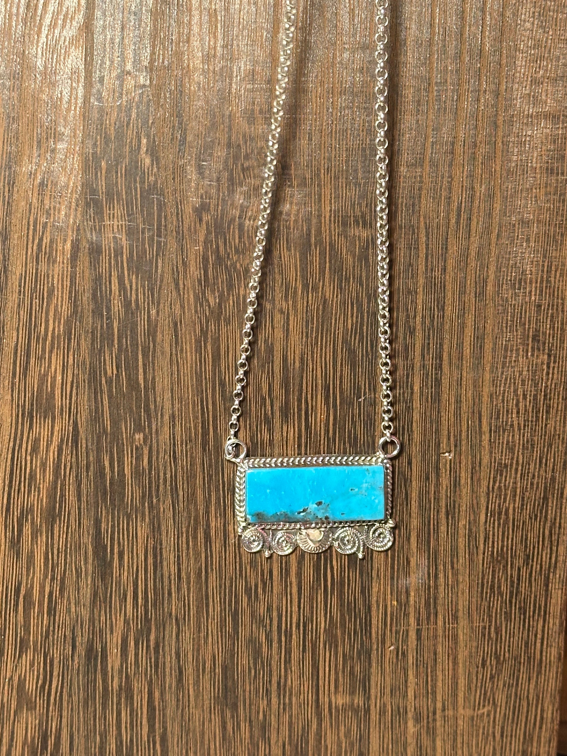 Beautiful Handmade Sterling Silver Bar Necklace. Such gorgeous craftsmanship! Sterling chain measures 16 inches long with a 2 inch extender. Pendant measures 1 inch long and 5/8 of an inch wide. Signed Nizhoni and stamped Sterling. Stones are natural and will vary.