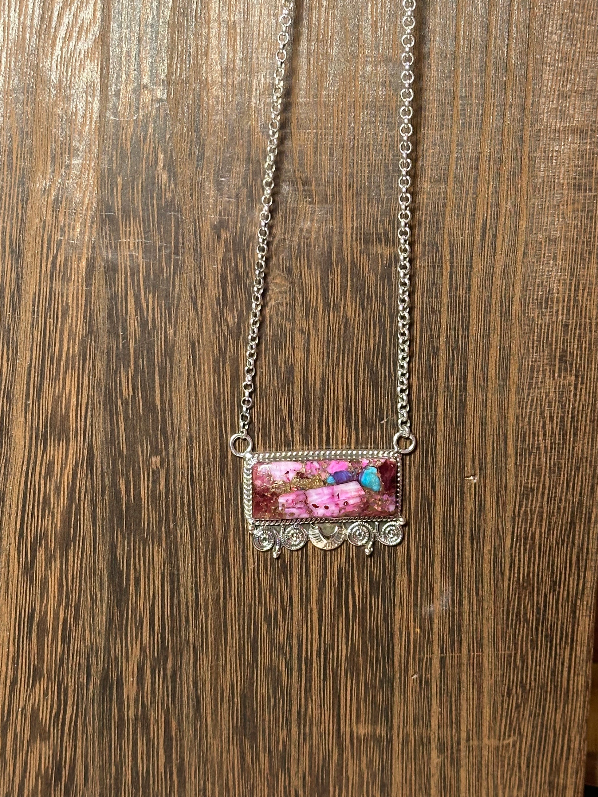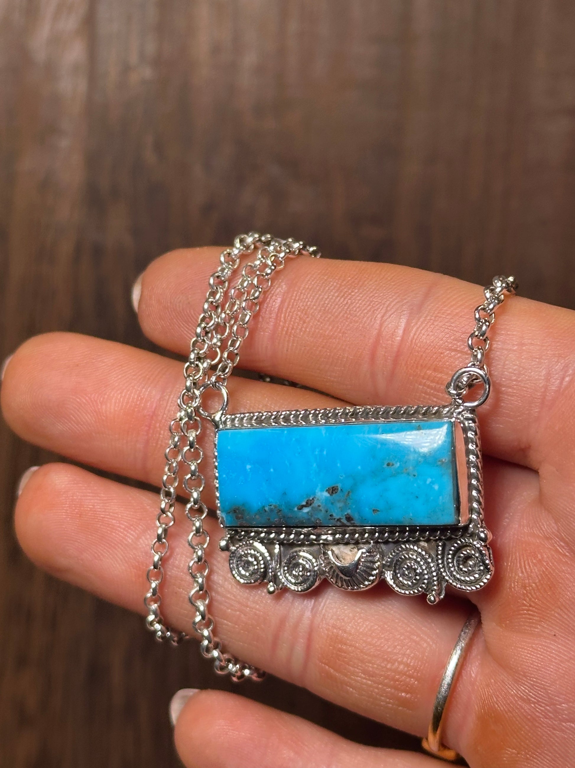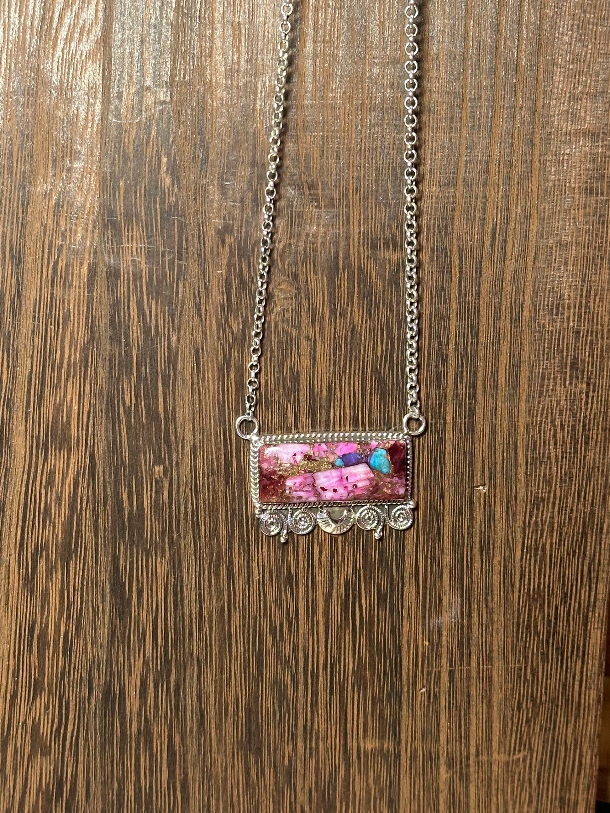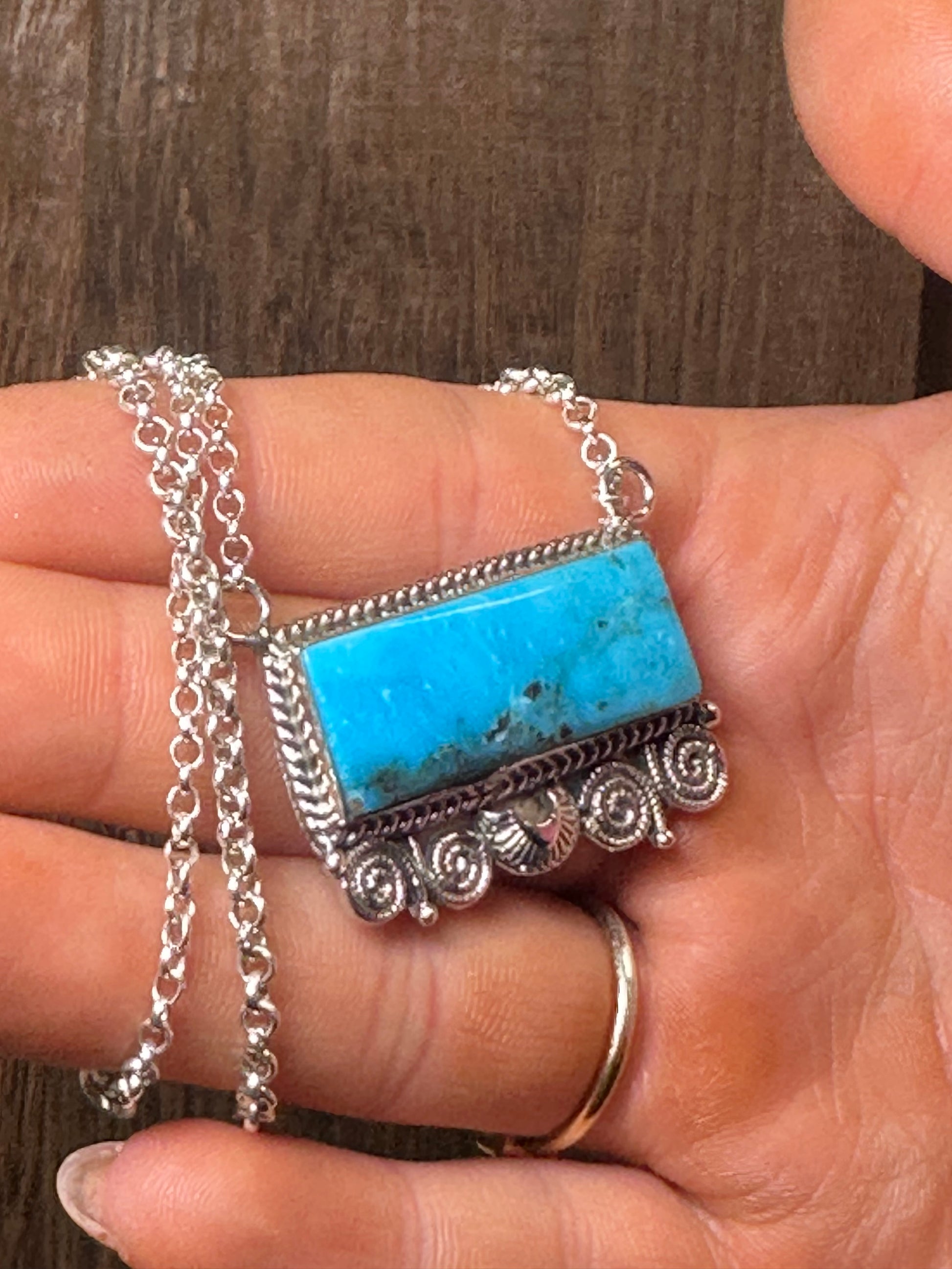 Beautiful Handmade Sterling Silver Bar Necklace. Such gorgeous craftsmanship! Sterling chain measures 16 inches long with a 2 inch extender. Pendant measures 1 inch long and 5/8 of an inch wide. Signed Nizhoni and stamped Sterling. Stones are natural and will vary.