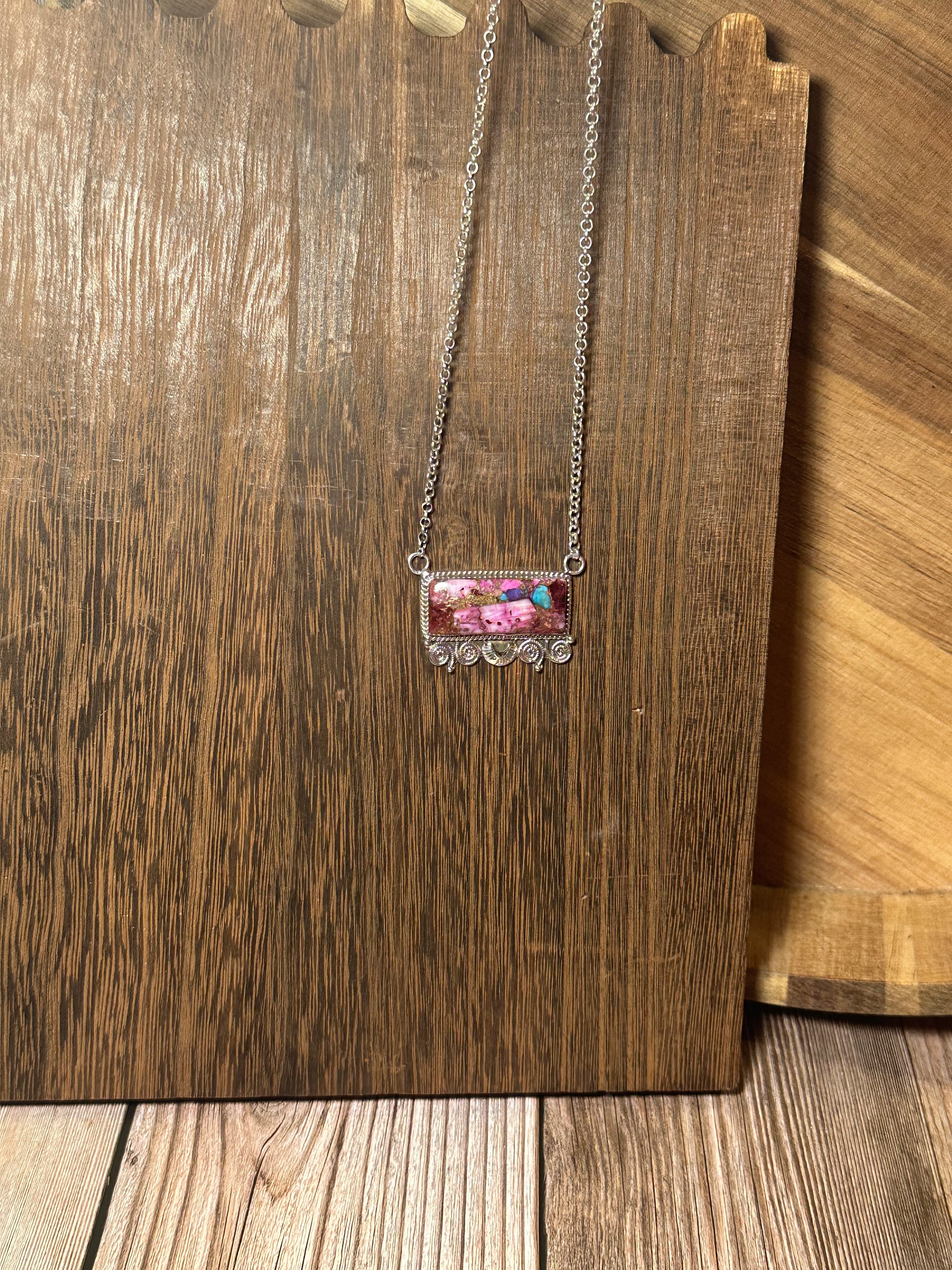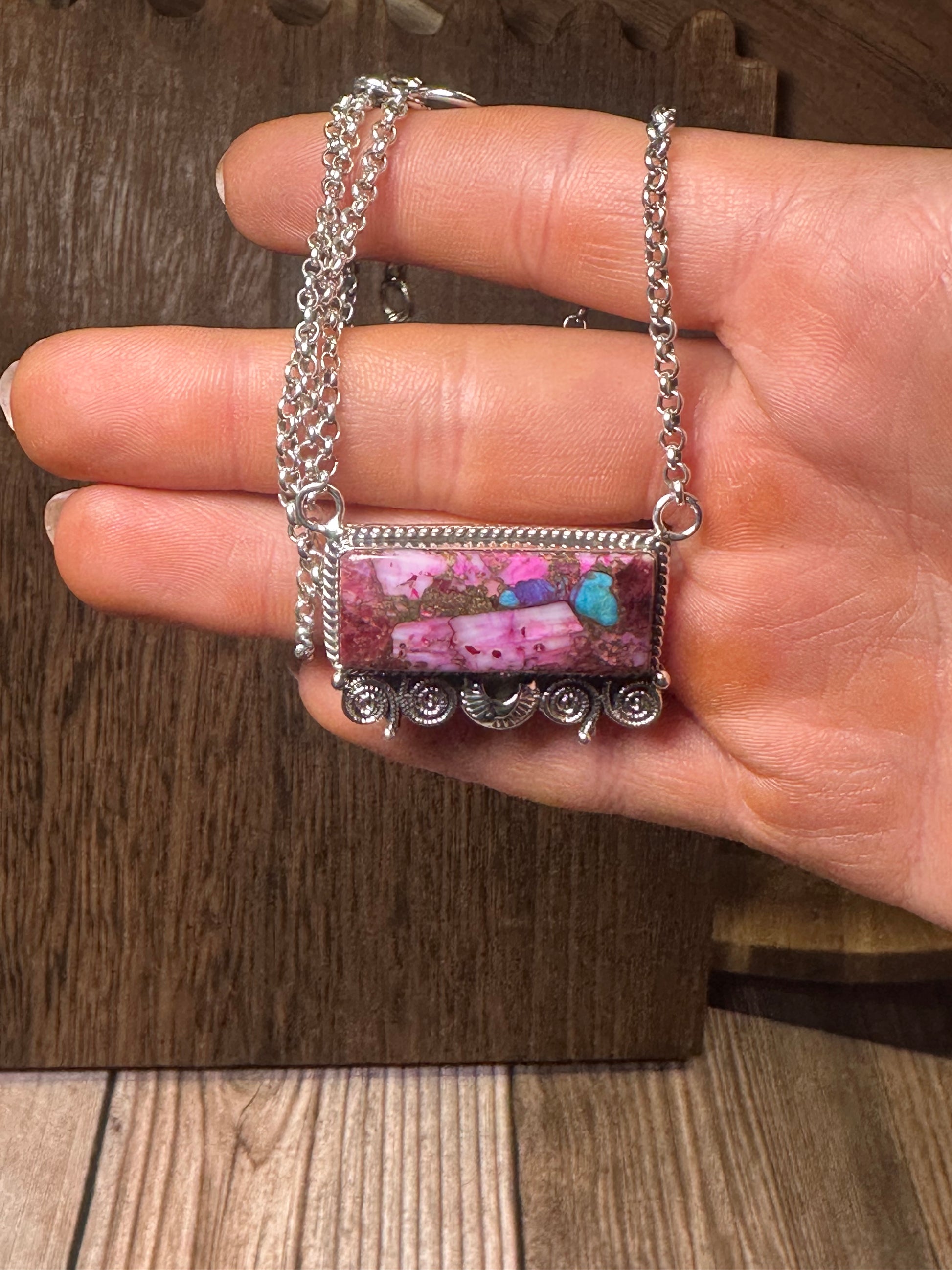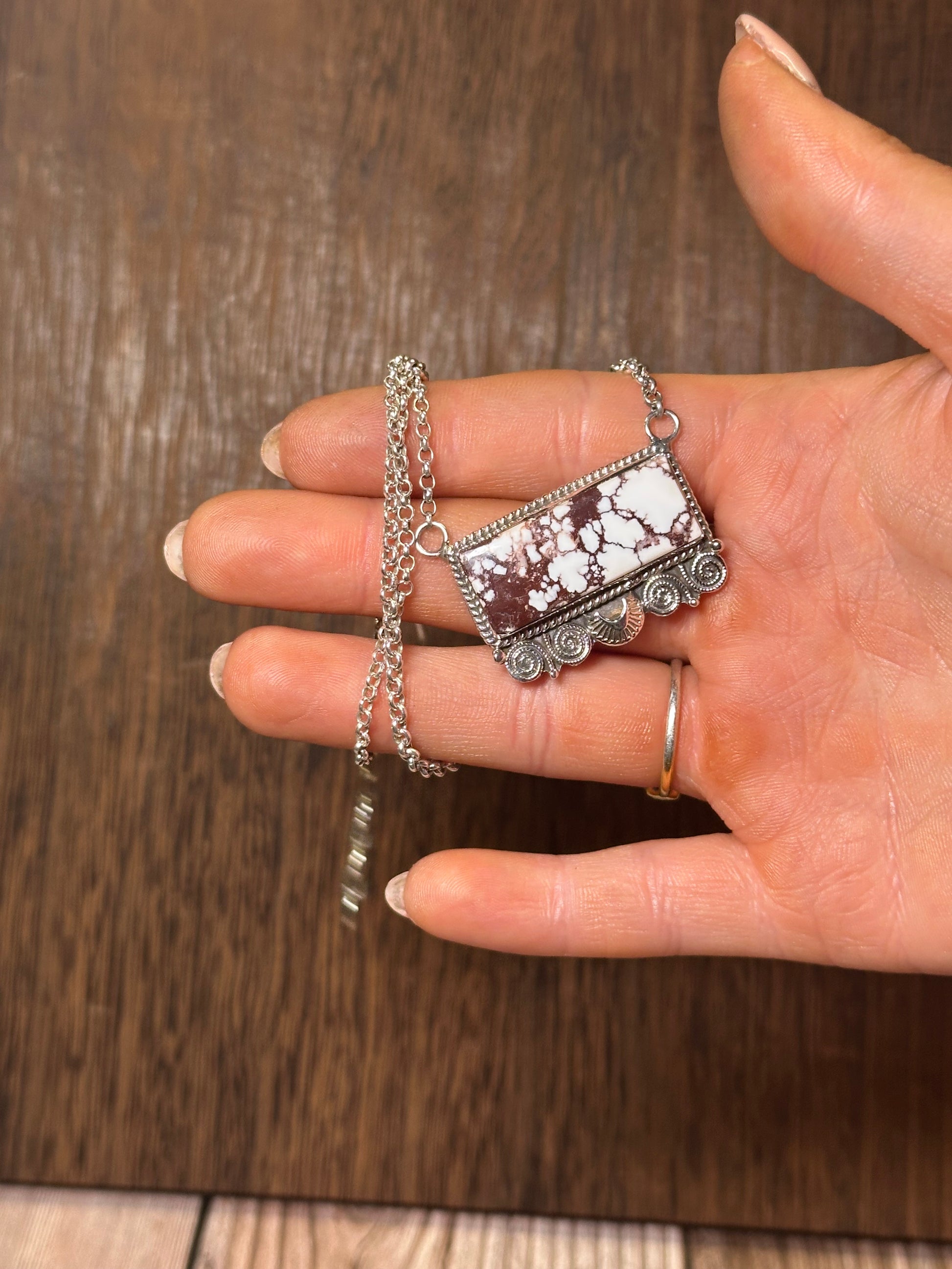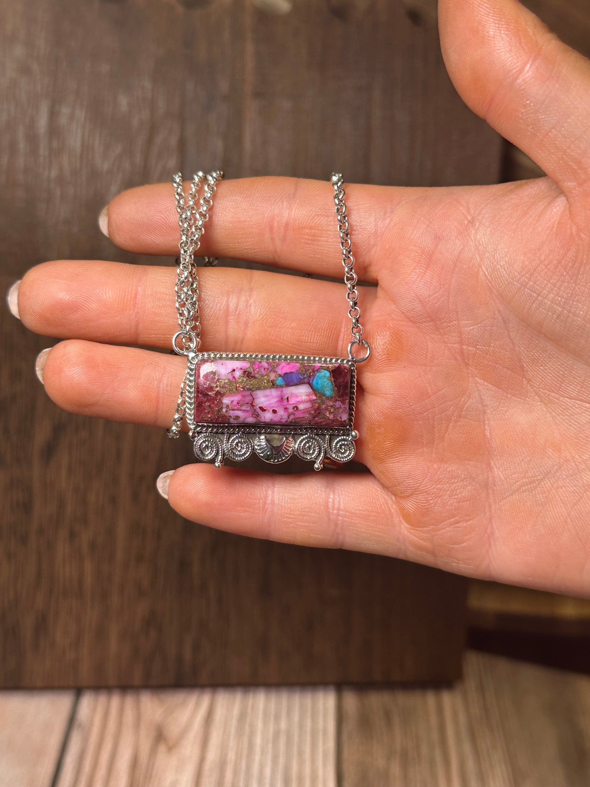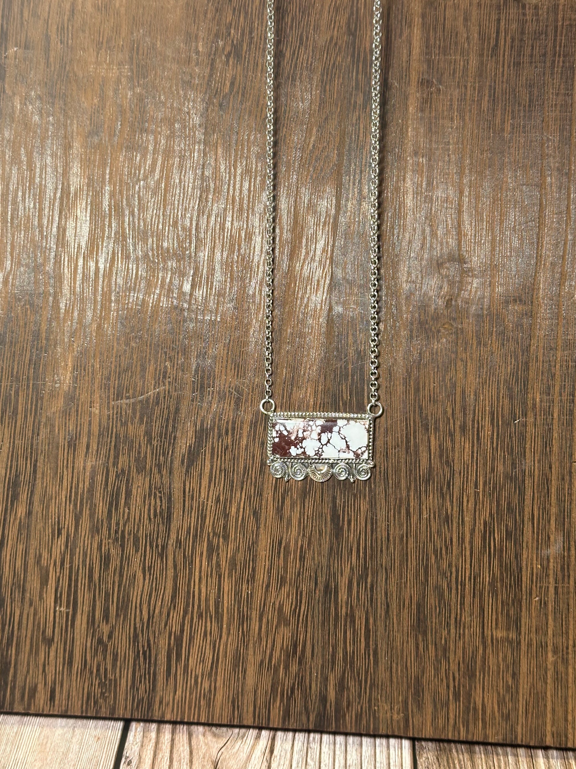 Beautiful Handmade Sterling Silver Bar Necklace. Such gorgeous craftsmanship! Sterling chain measures 16 inches long with a 2 inch extender. Pendant measures 1 inch long and 5/8 of an inch wide. Signed Nizhoni and stamped Sterling. Stones are natural and will vary.