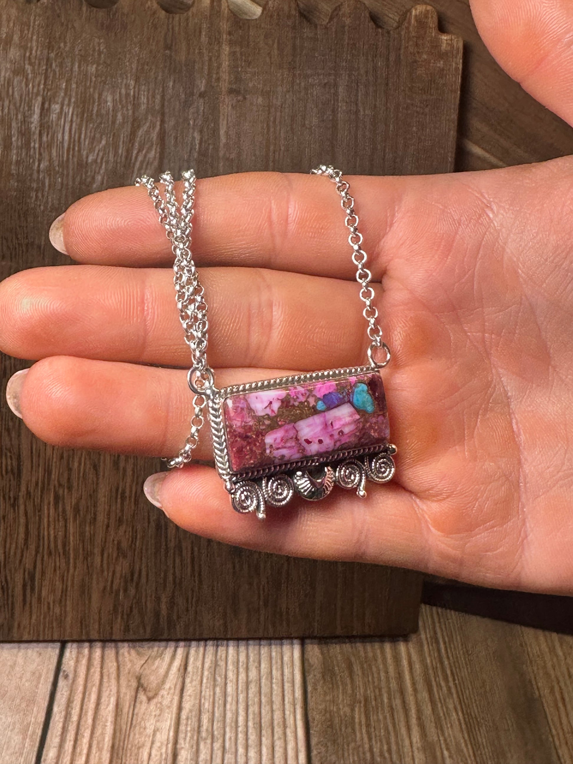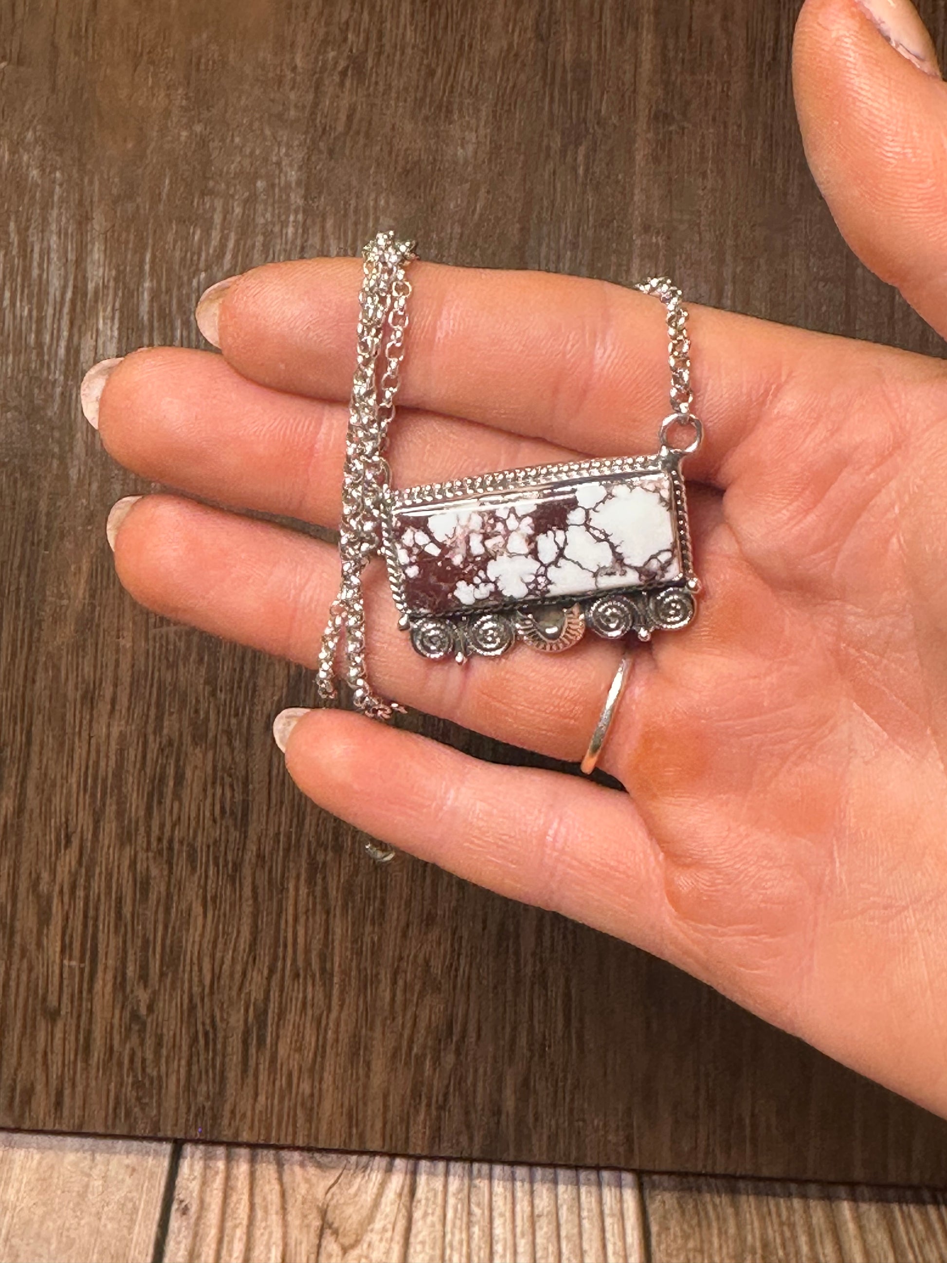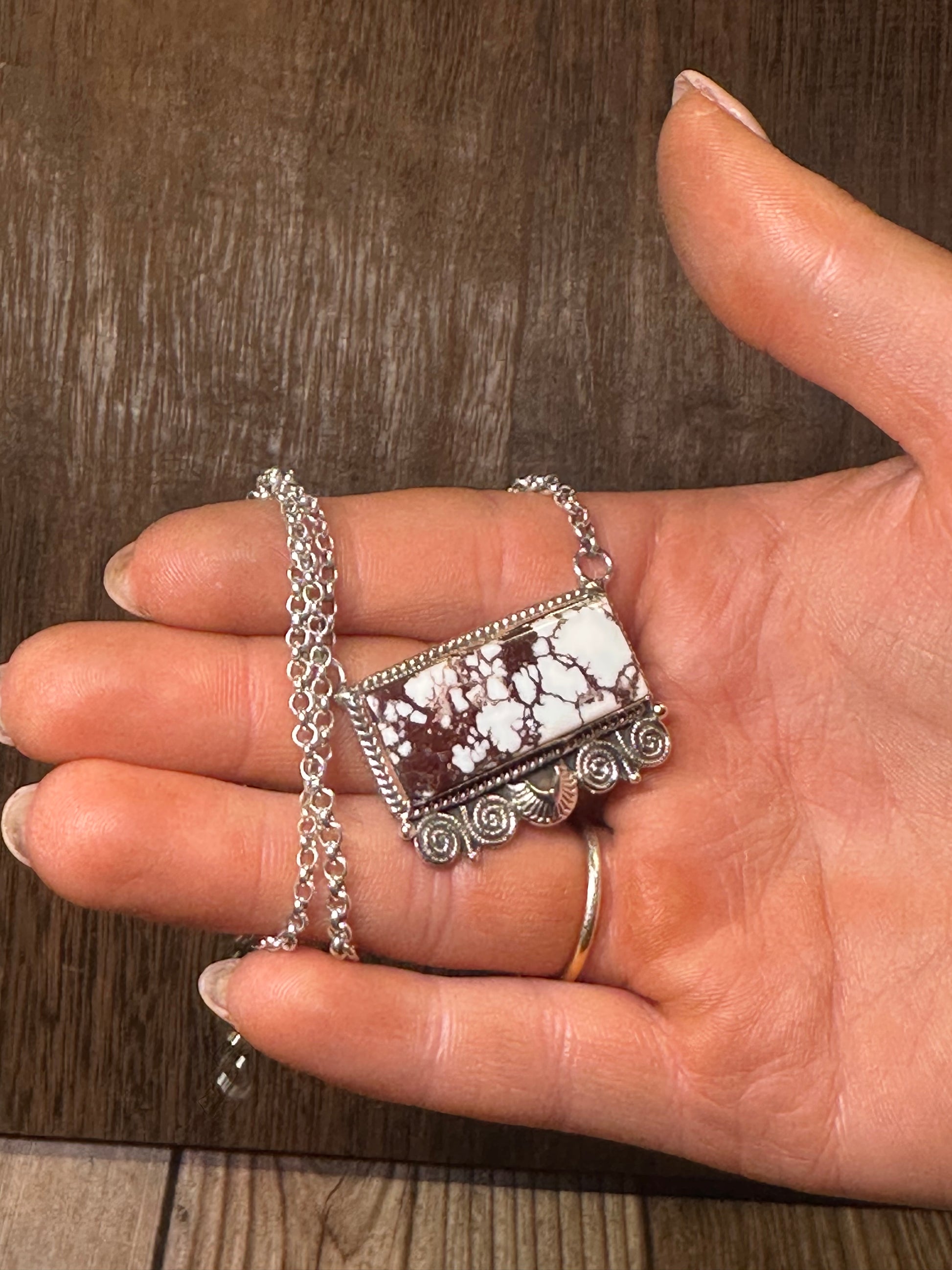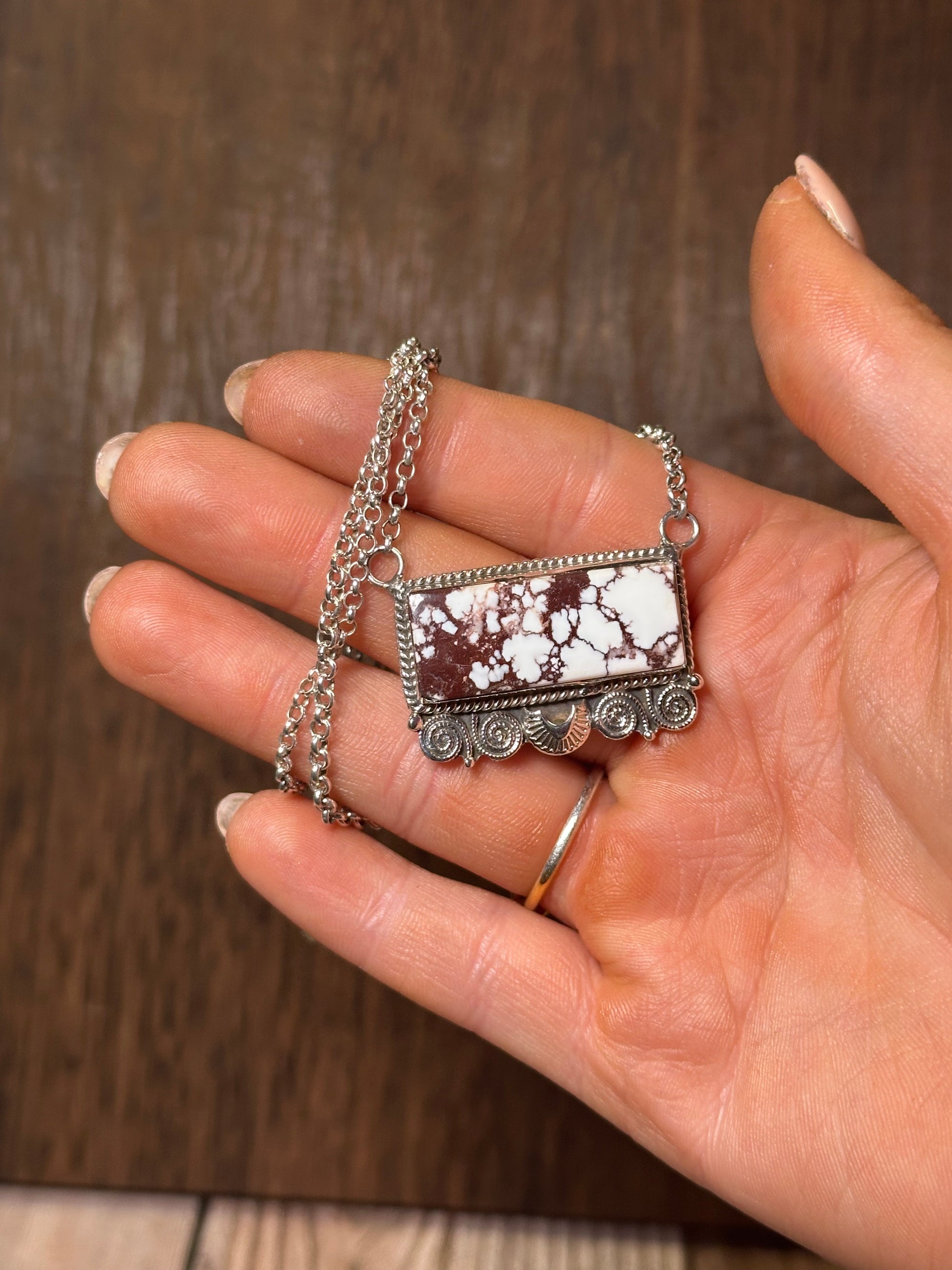 Beautiful Handmade Sterling Silver Bar Necklace. Such gorgeous craftsmanship! Sterling chain measures 16 inches long with a 2 inch extender. Pendant measures 1 inch long and 5/8 of an inch wide. Signed Nizhoni and stamped Sterling. Stones are natural and will vary.