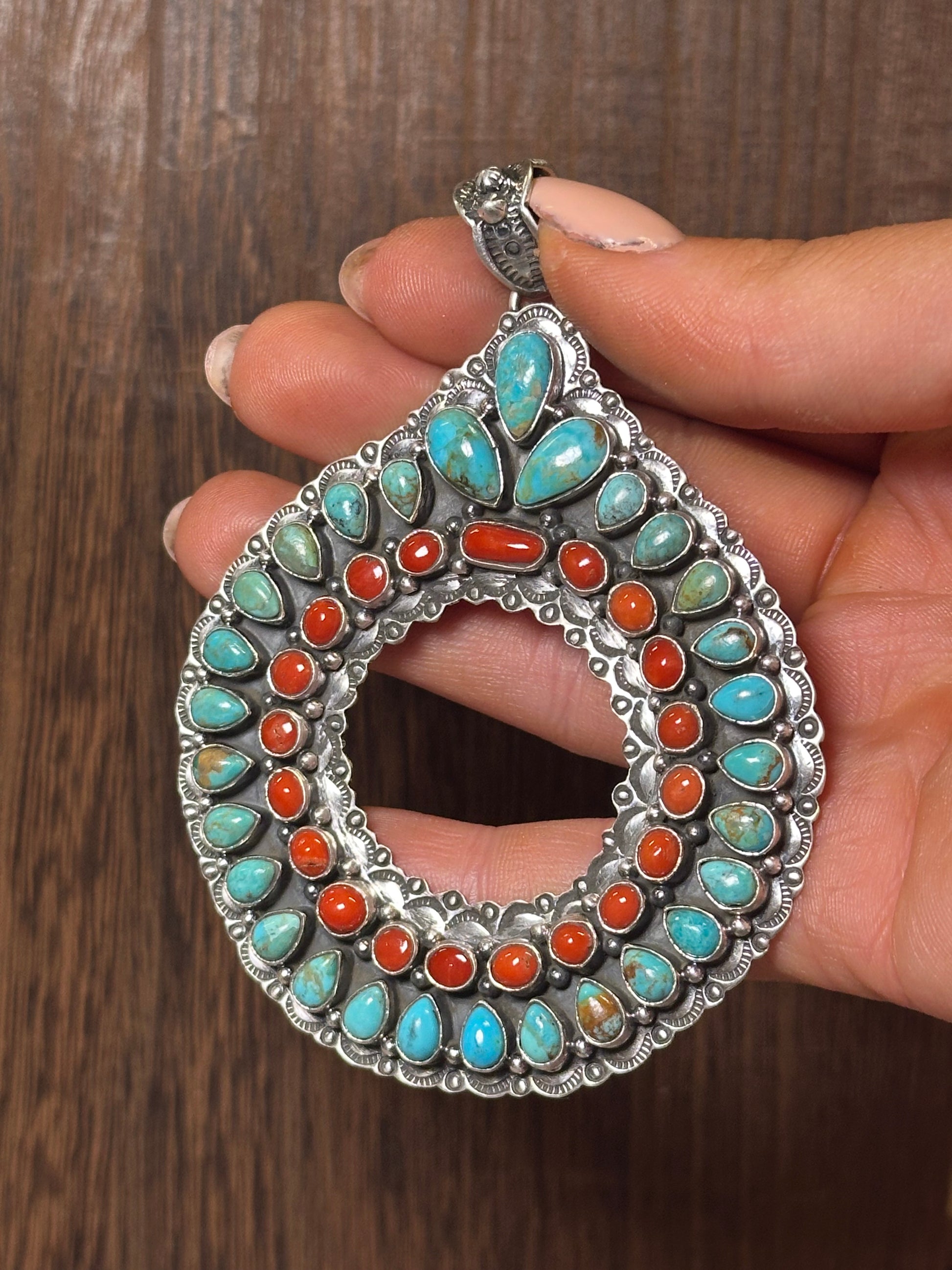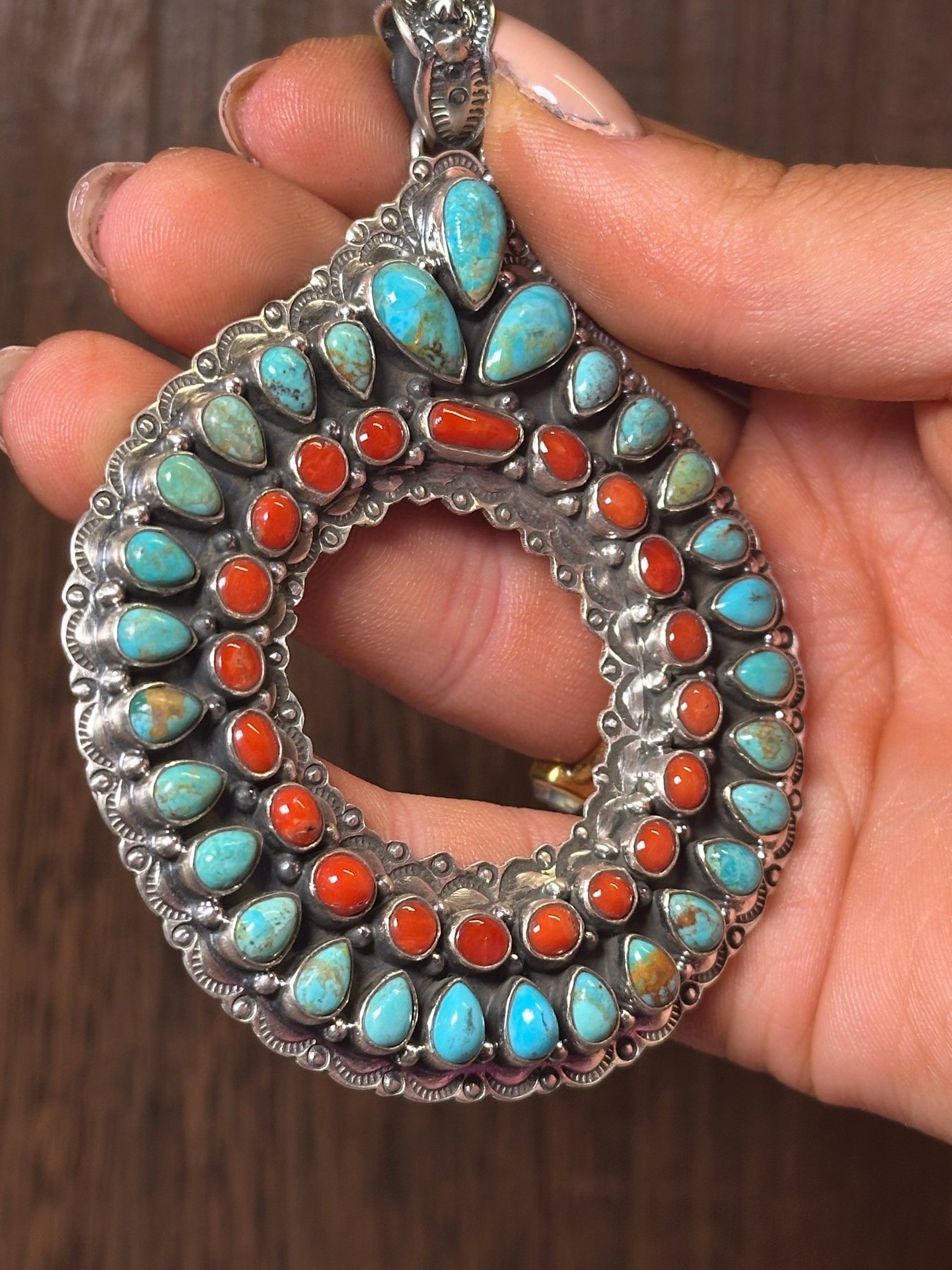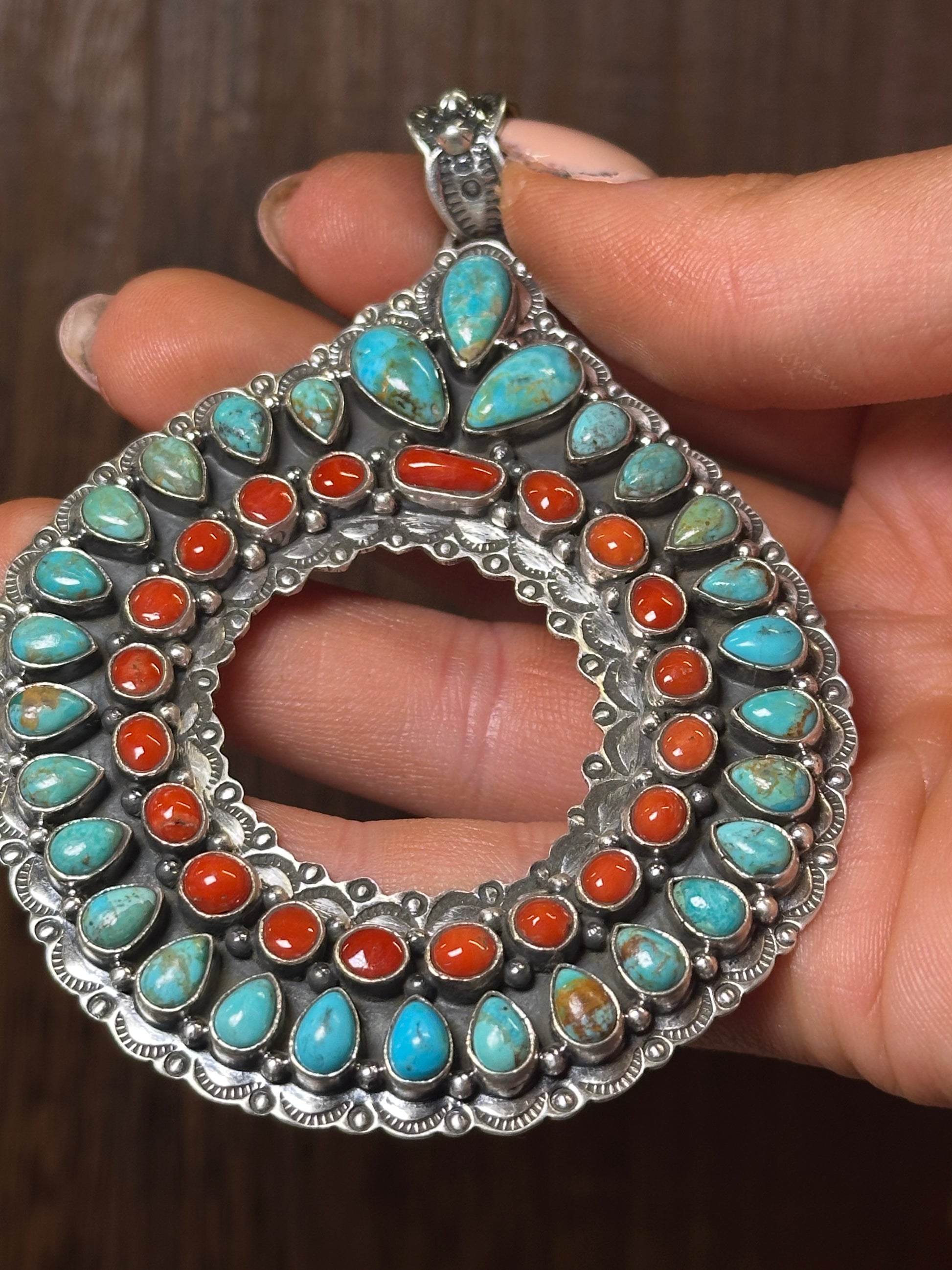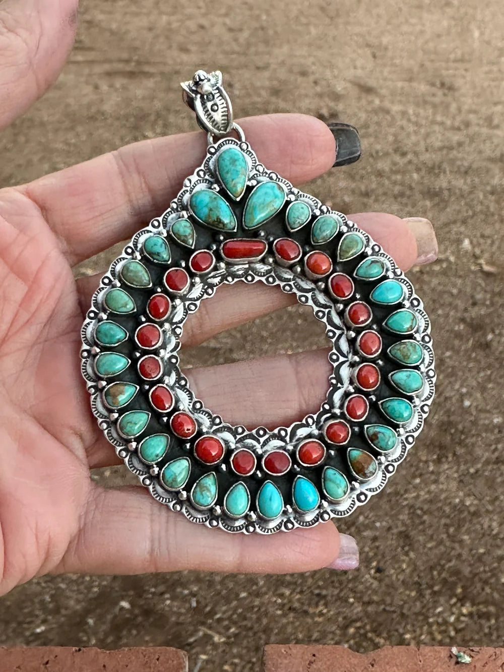 Handmade Sterling Silver, Coral & Kingman Turquoise Christmas Wreath Pendant