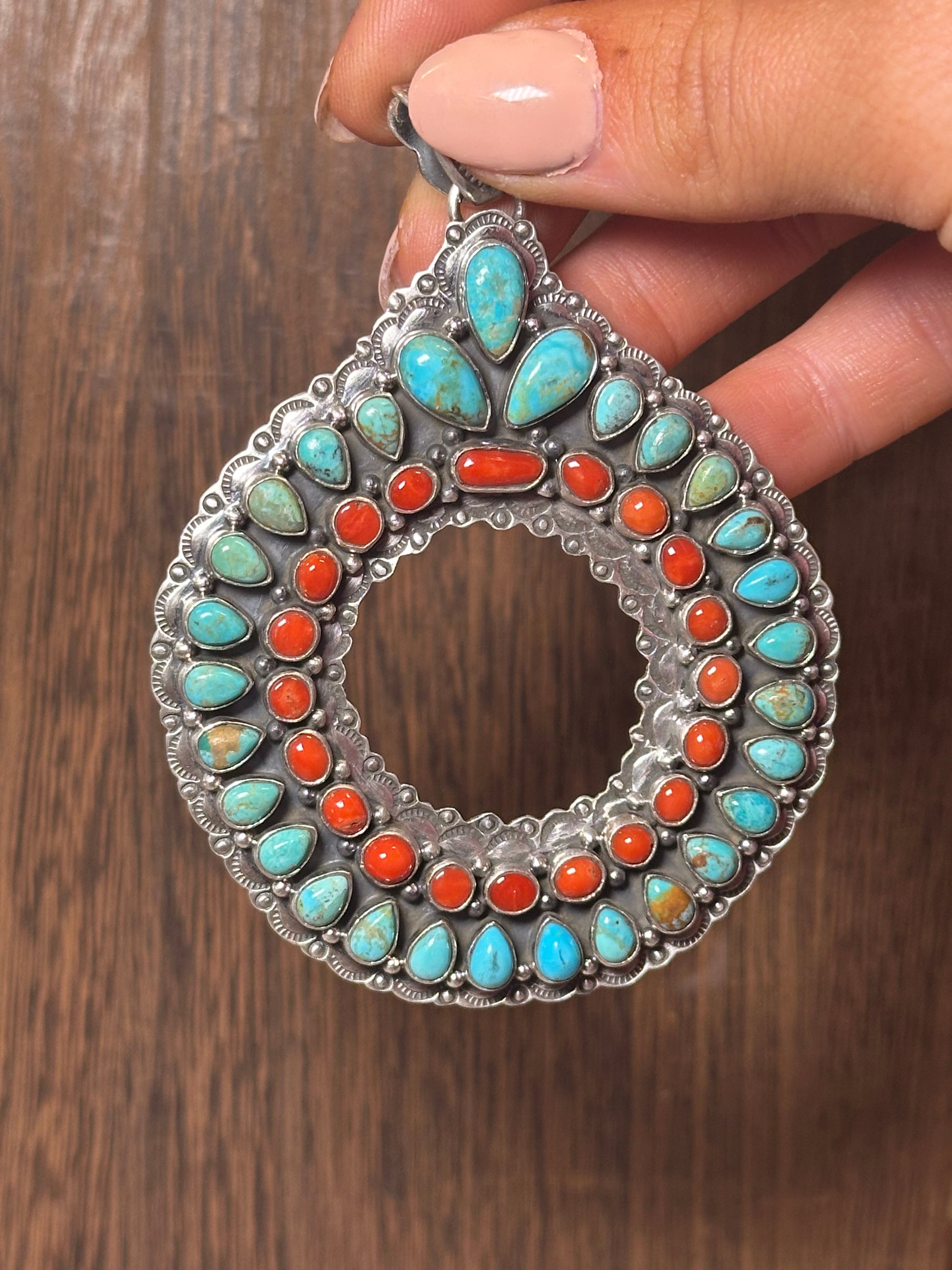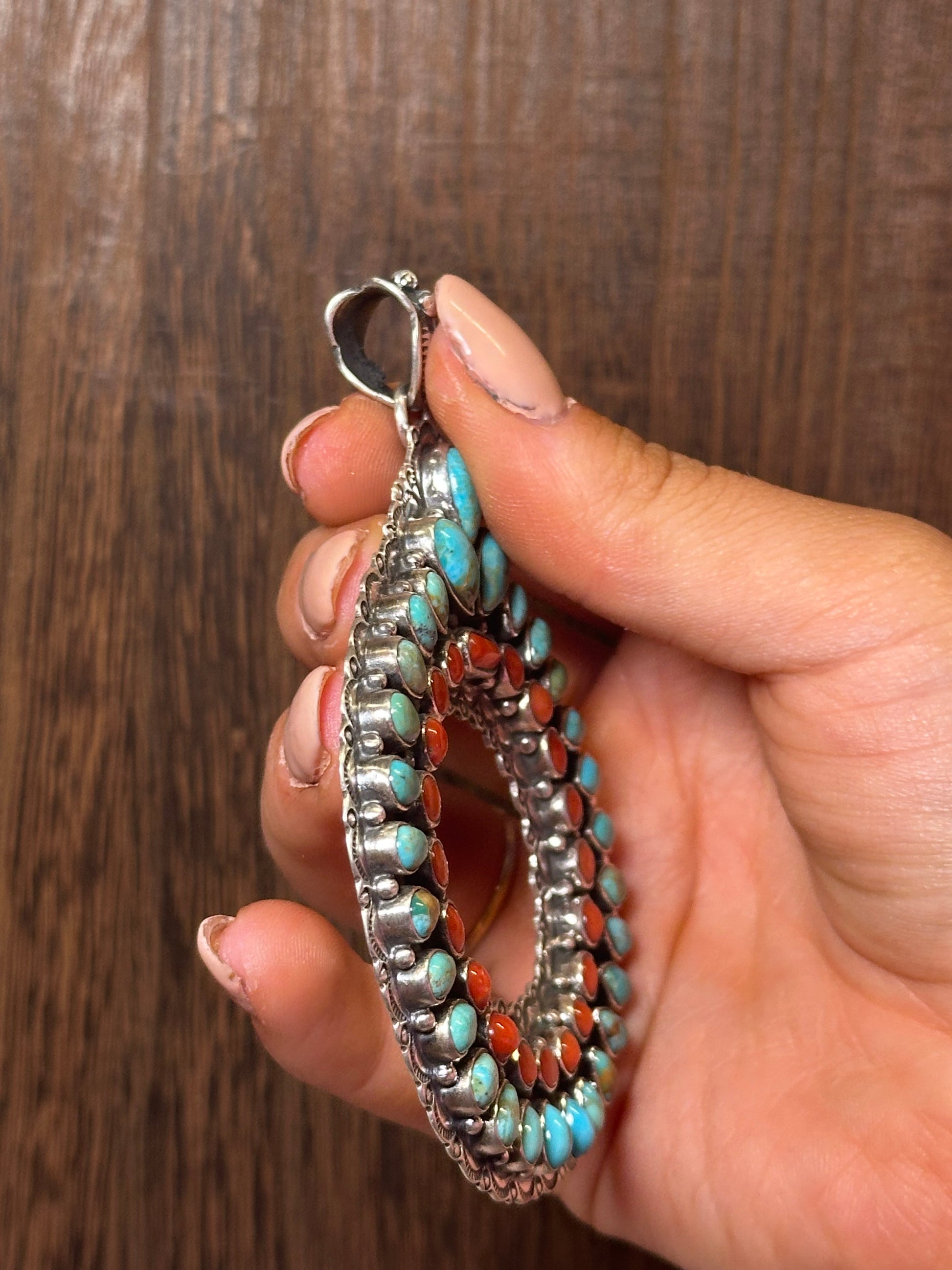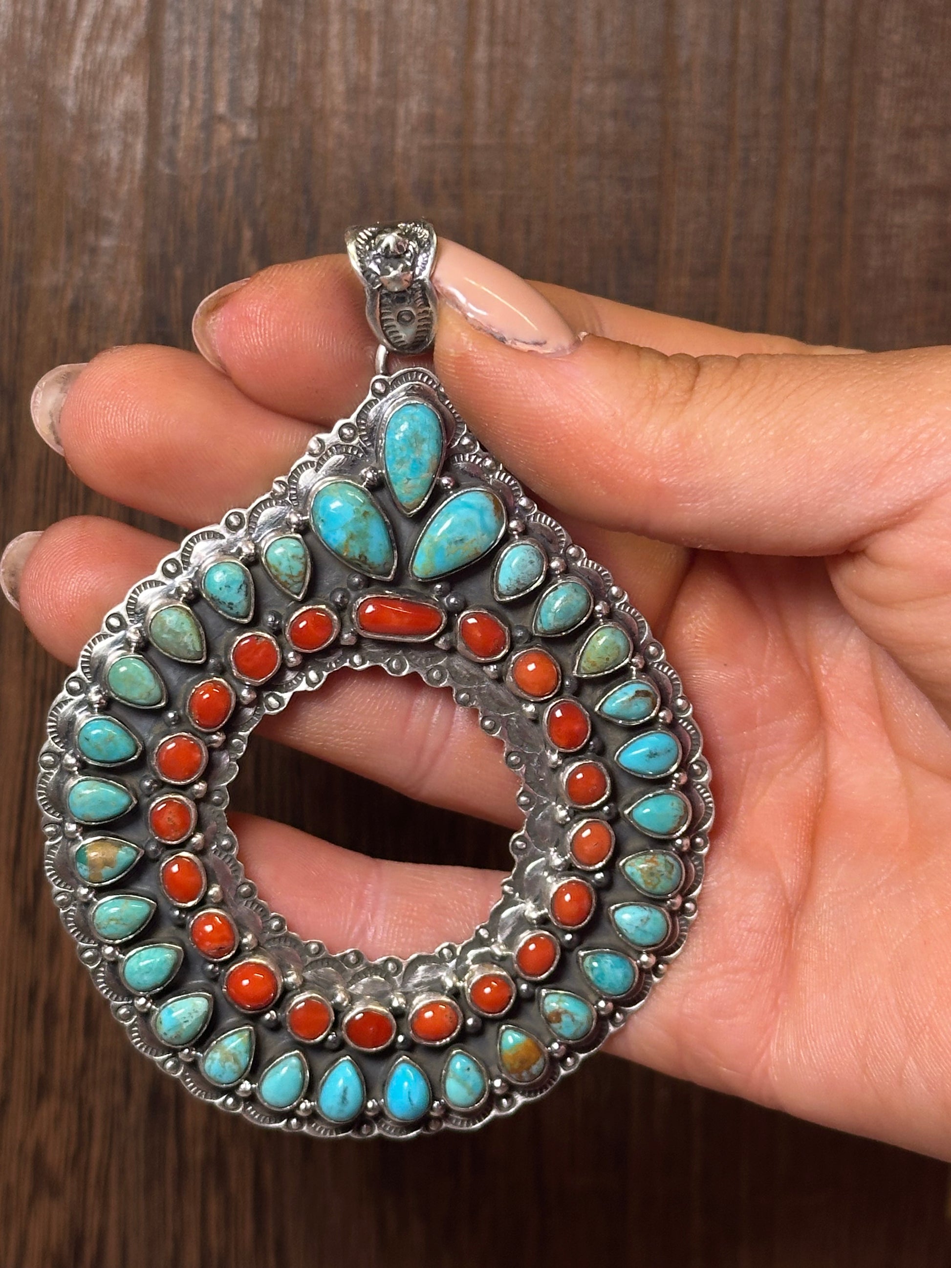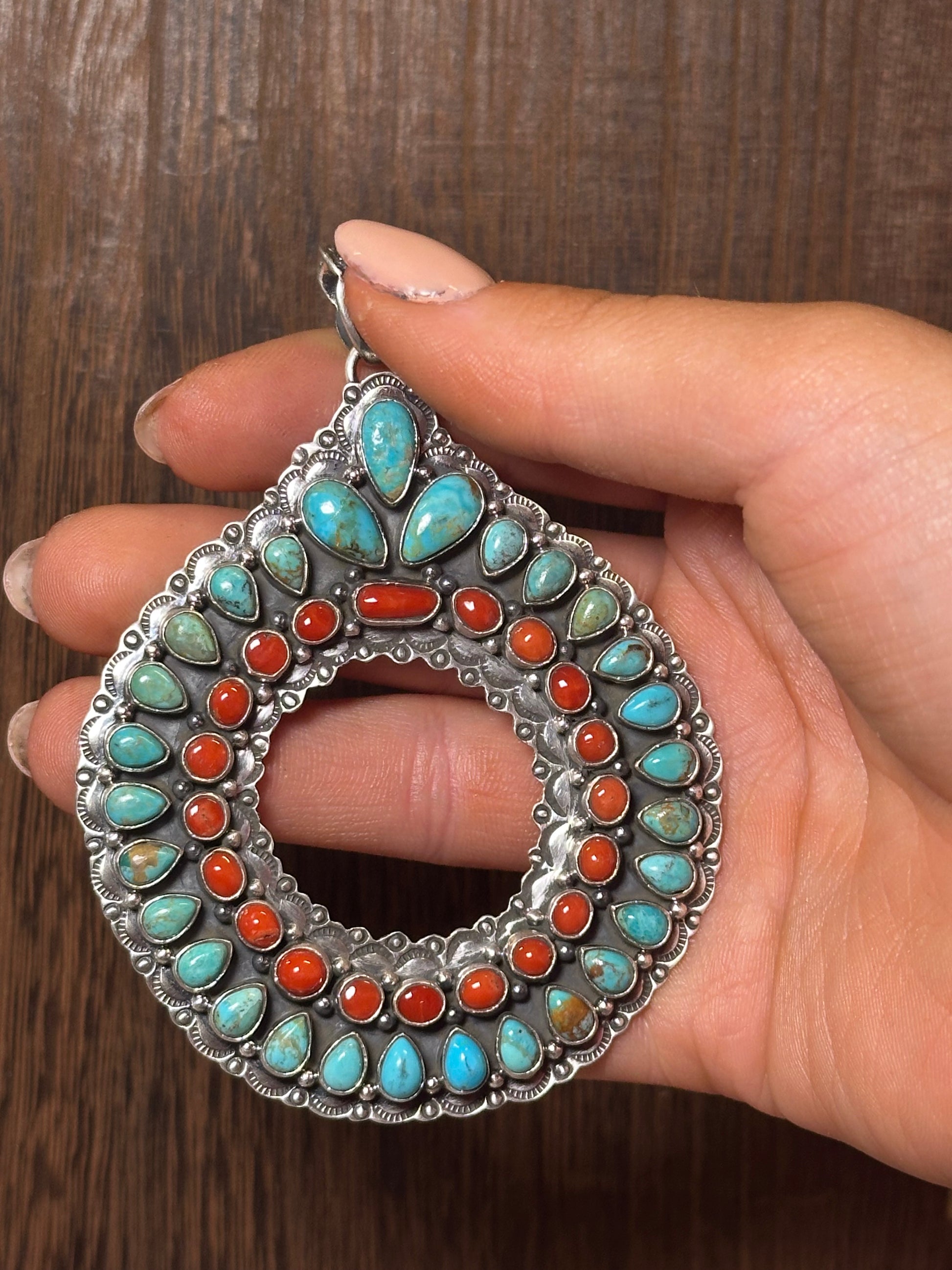 Handmade Sterling Silver, Coral & Kingman Turquoise Christmas Wreath Pendant