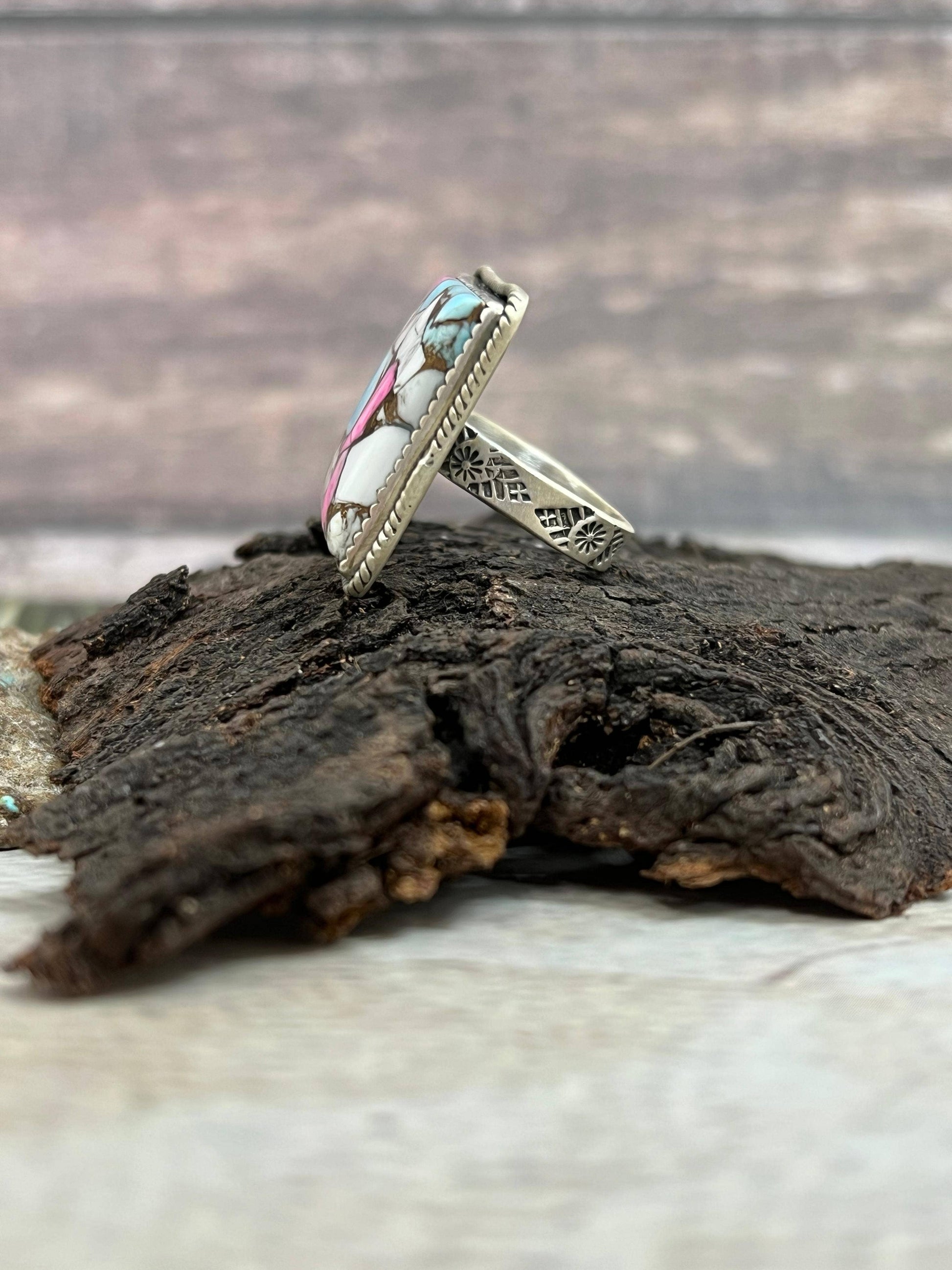 Introducing our latest masterpiece! This stunning Sterling Silver Cotton Candy Turquoise adjustable ring is a true showstopper. With dimensions of 1" in length and 1" in width, it’s designed to make a bold statement.