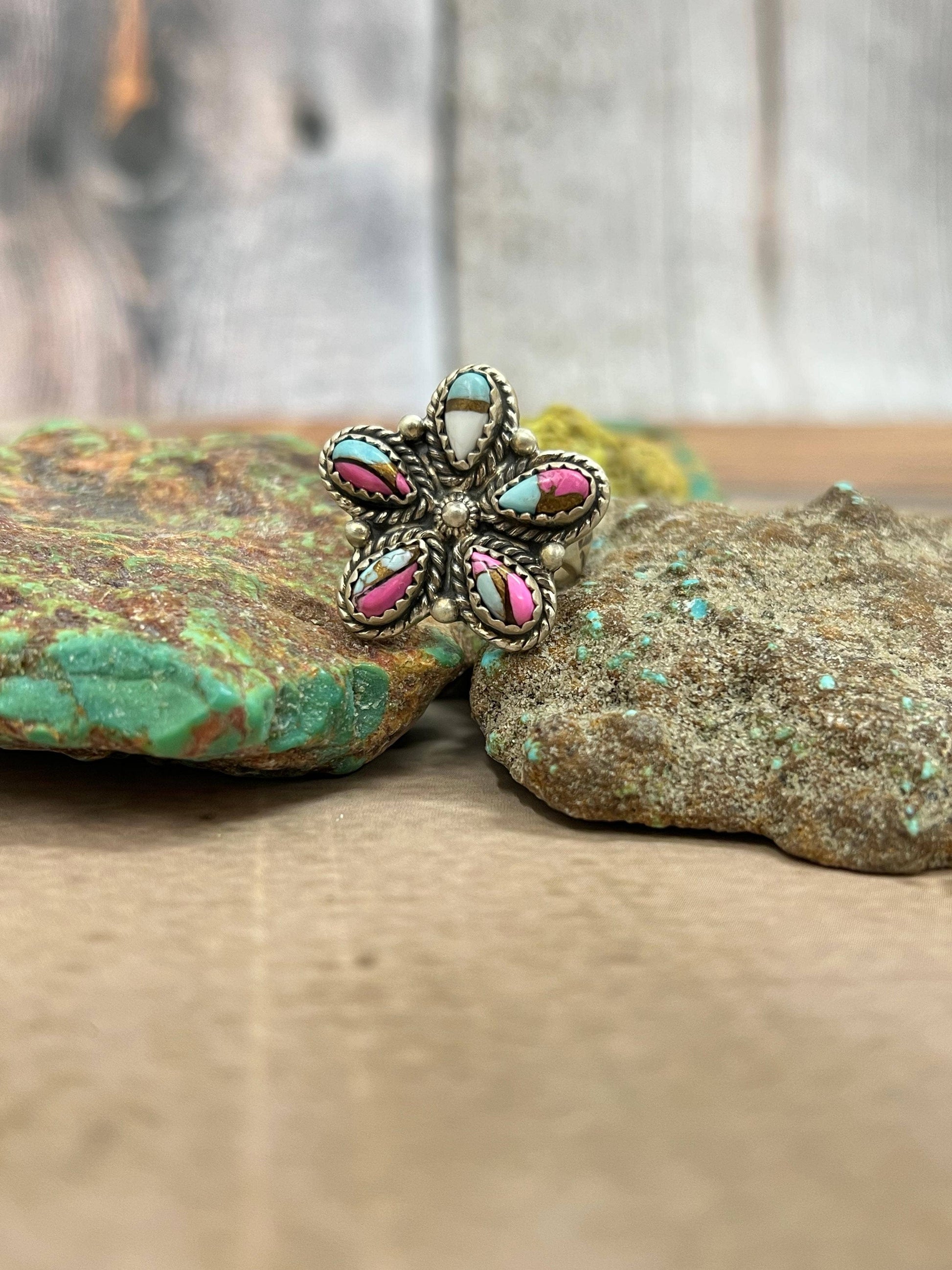 Product Details: * Category: Ring * Main Stone: Cotton Candy Turquoise * Handmade: Yes * Metal Purity: 925 Sterling Silver * Brand: Nizhoni Traders LLC * Each listing is for 1 ring only. Introducing our latest masterpiece! This stunning Sterling Silver Cotton Candy Turquoise adjustable ring is a true showstopper. With dimensions of 1 inch in length and 1 inch in width. Stamped with “Sterling” and signed by Nizhoni. This piece is Non-Native.