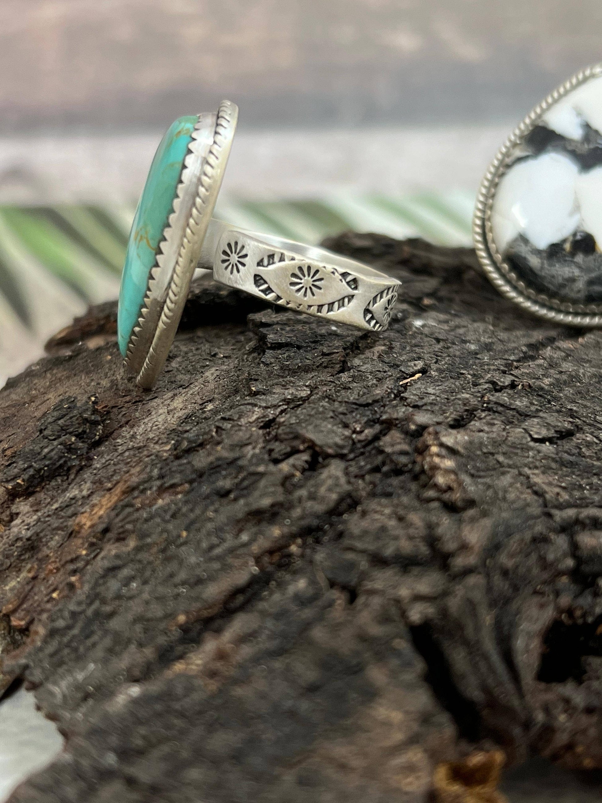 Handmade Sterling Silver White Buffalo, Kingman Turquoise Adjustable Ring, Signed Nizhoni (1)