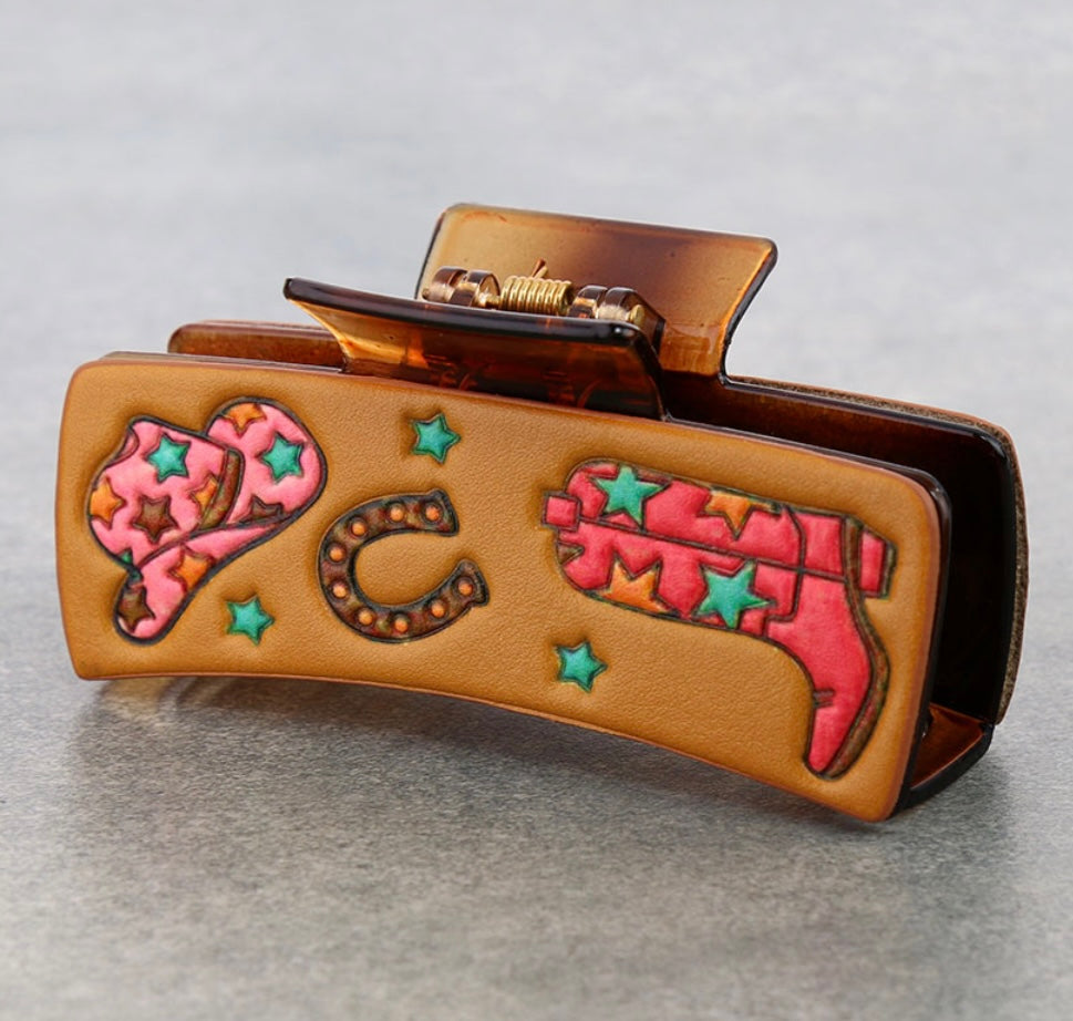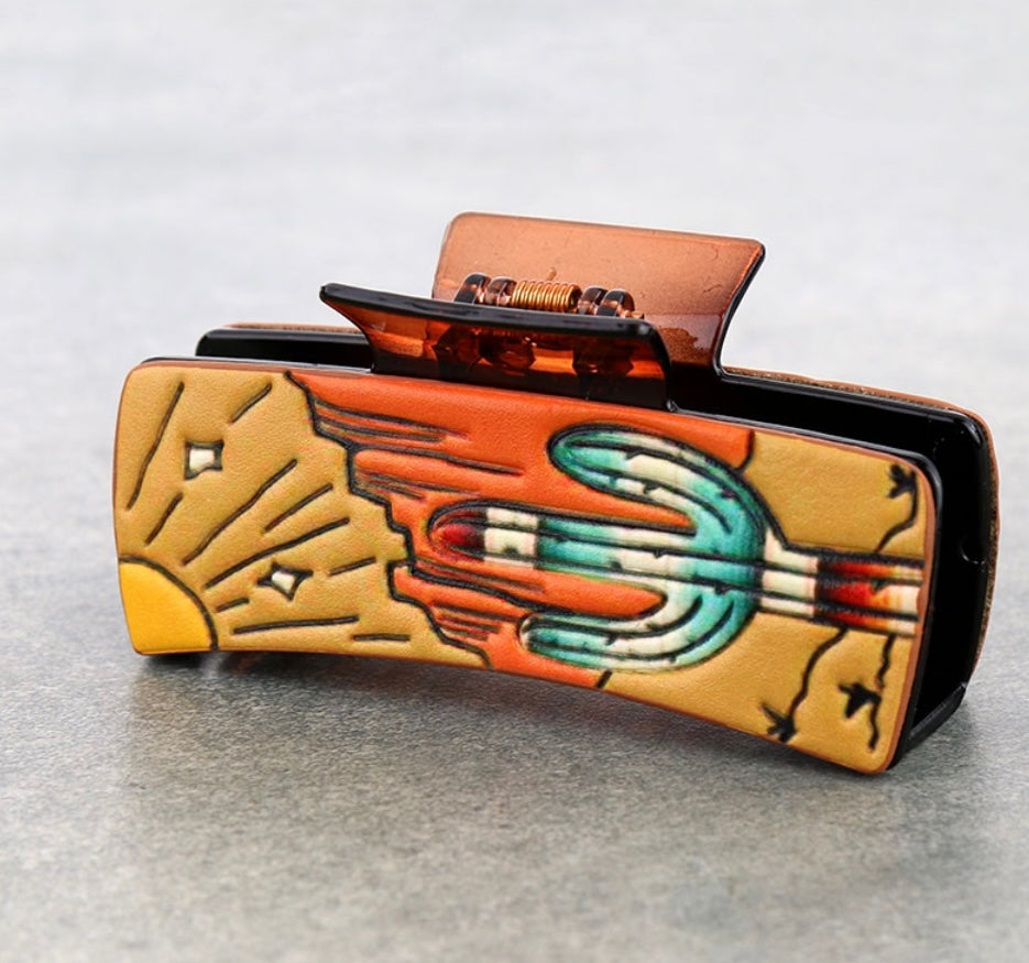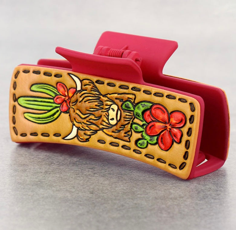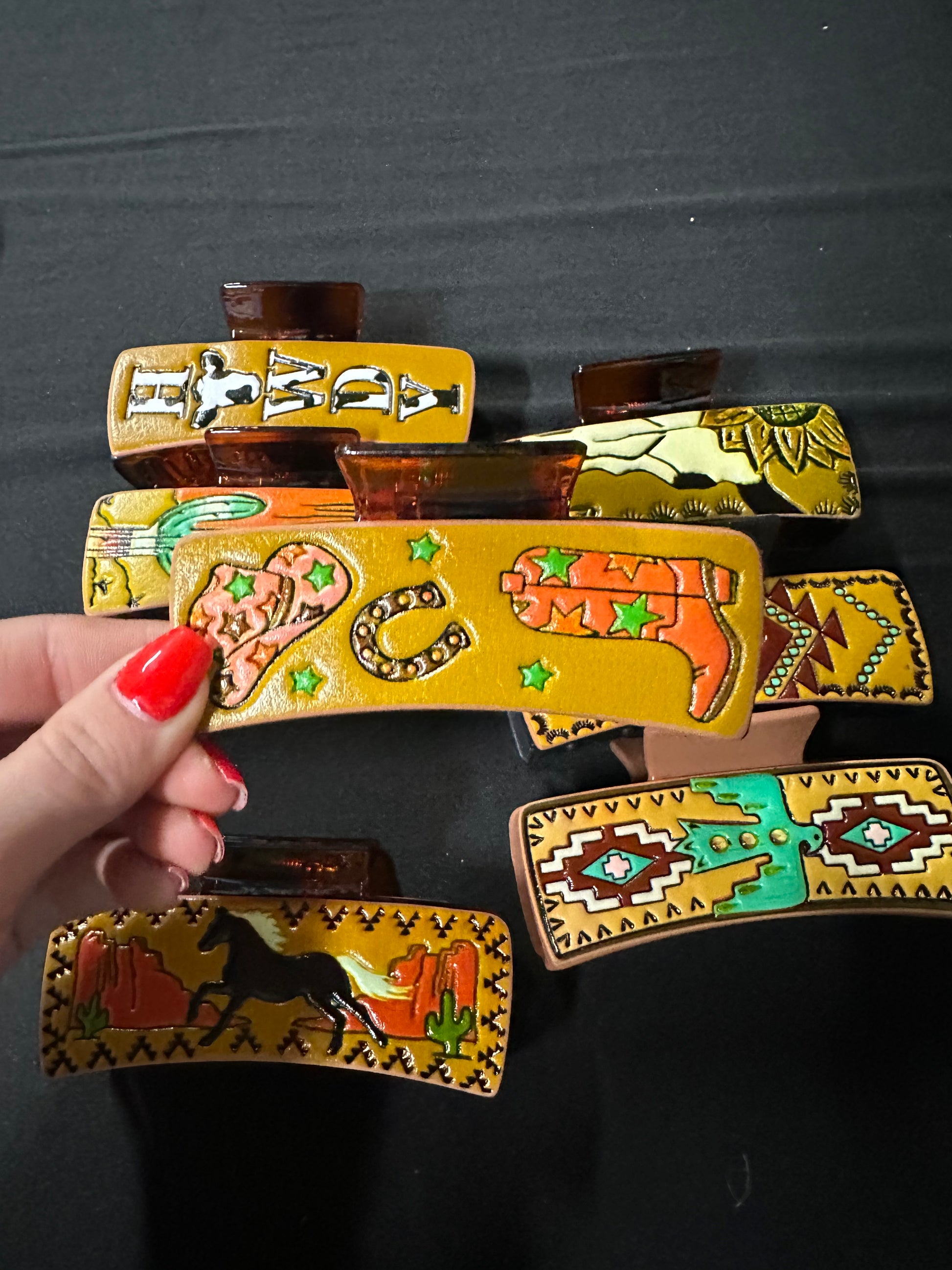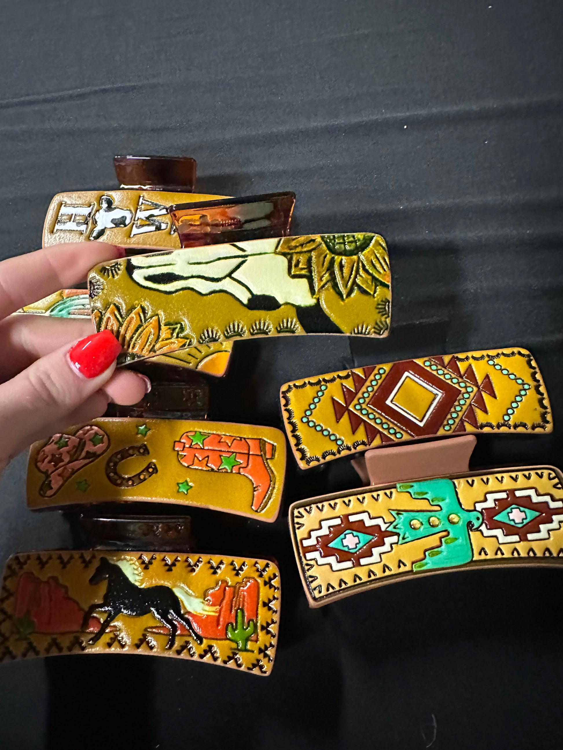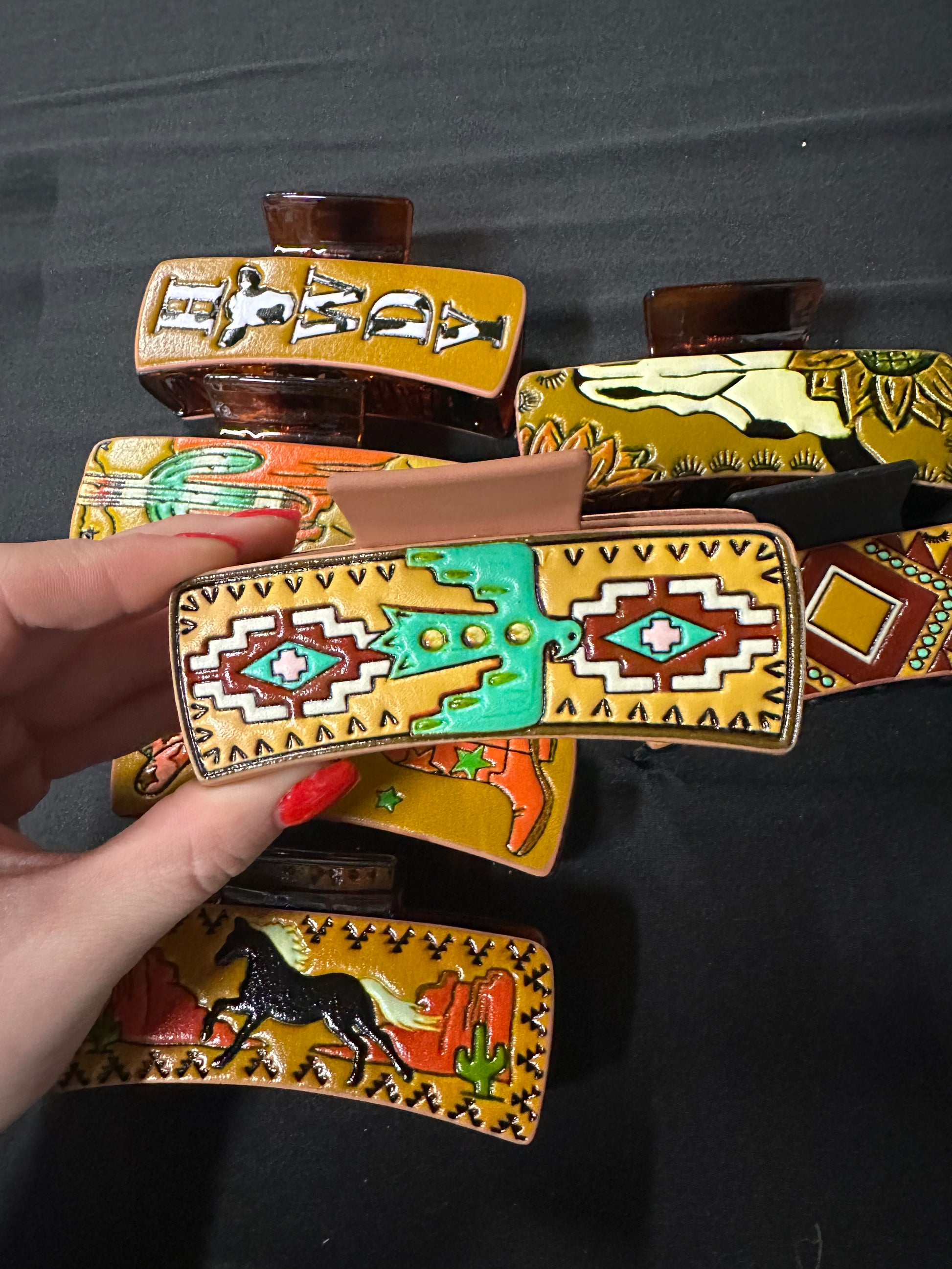 Introducing the Large Tooled Leather Western Claw Clip, the perfect accessory for any western-inspired look. Made with high-quality tooled leather, this claw clip adds a touch of authenticity to any hairstyle. Expertly crafted for durability and style, this claw clip is a must-have for any western enthusiast.