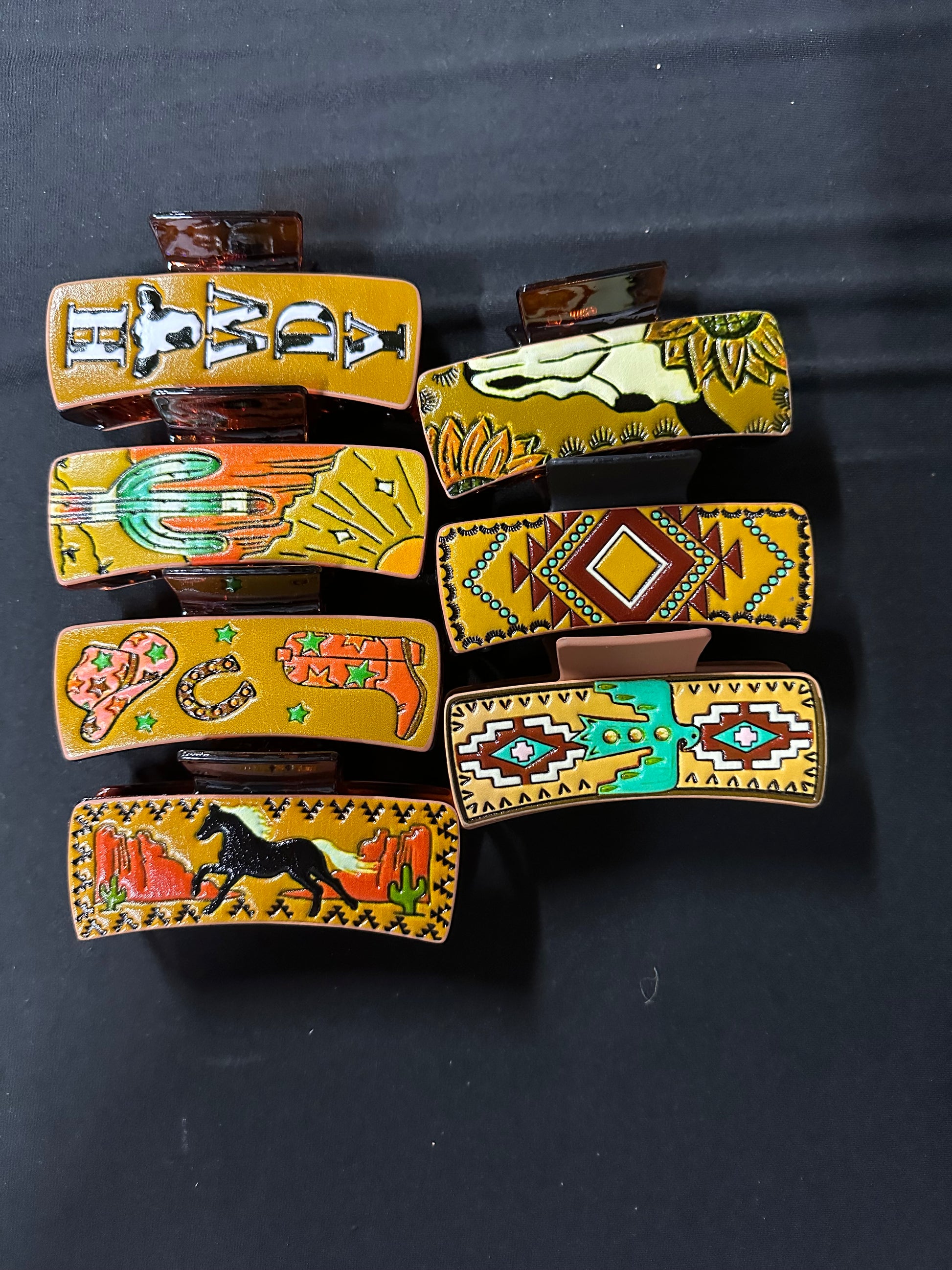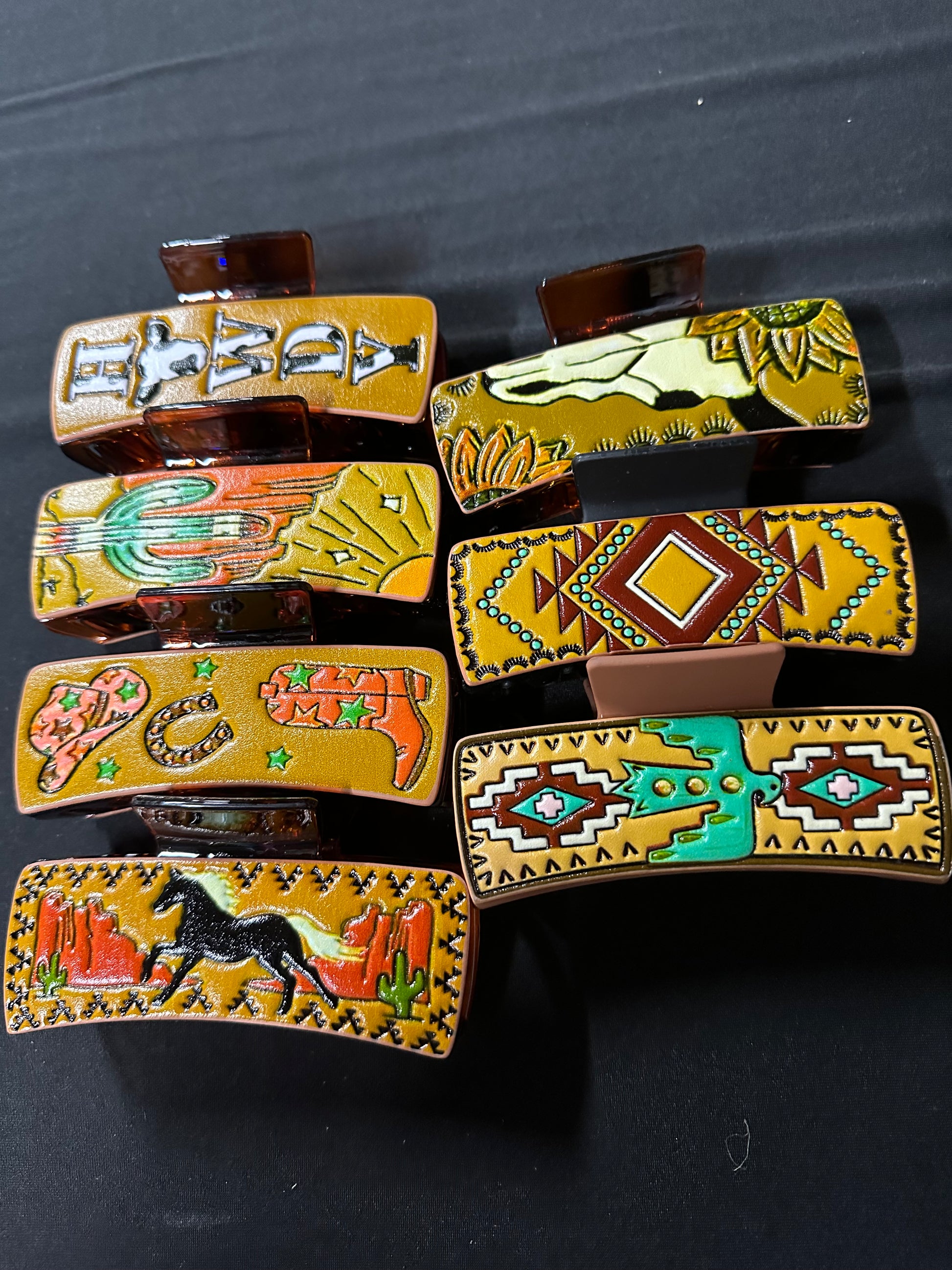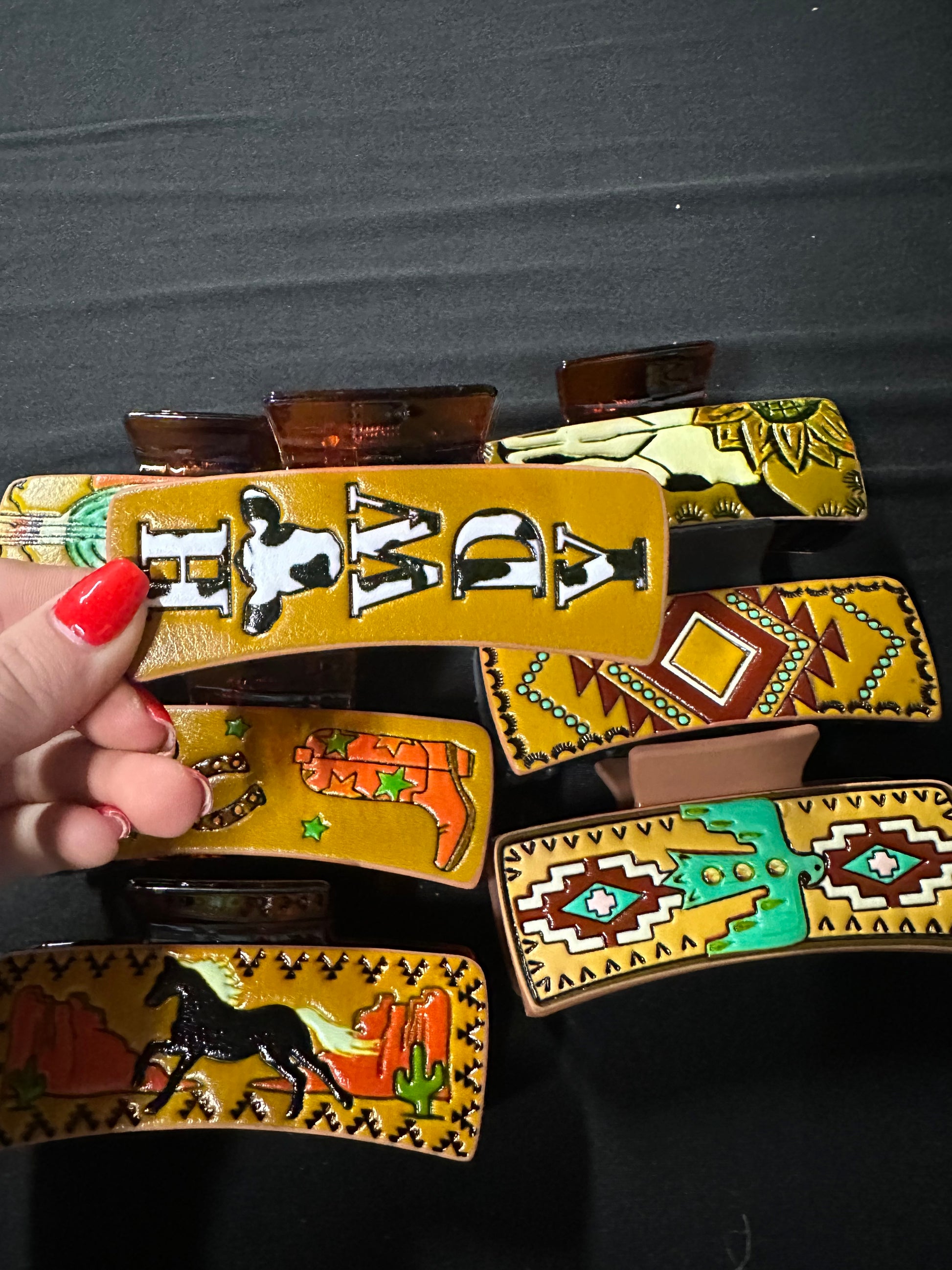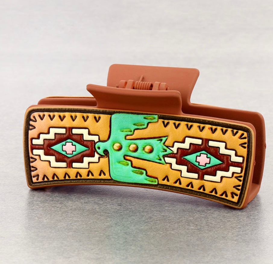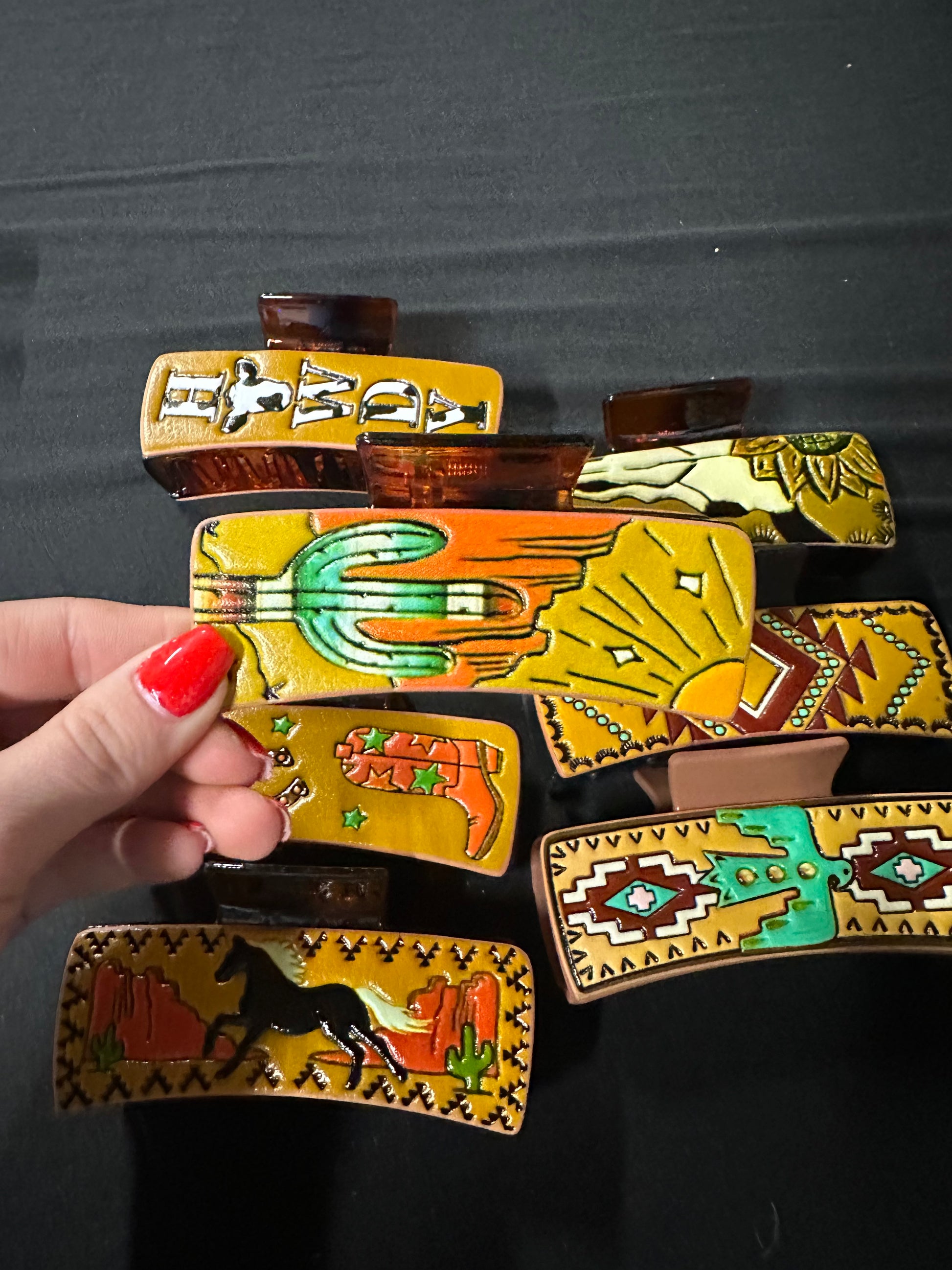 Introducing the Large Tooled Leather Western Claw Clip, the perfect accessory for any western-inspired look. Made with high-quality tooled leather, this claw clip adds a touch of authenticity to any hairstyle. Expertly crafted for durability and style, this claw clip is a must-have for any western enthusiast.