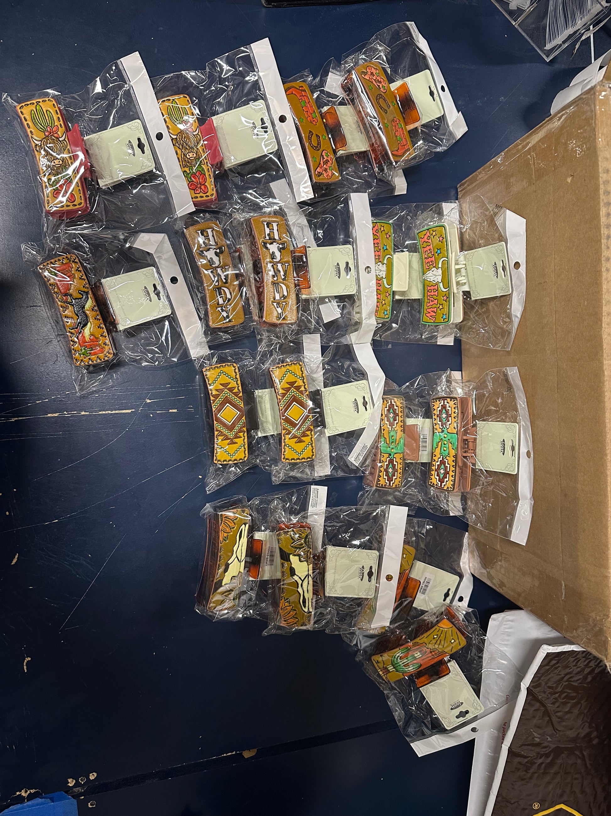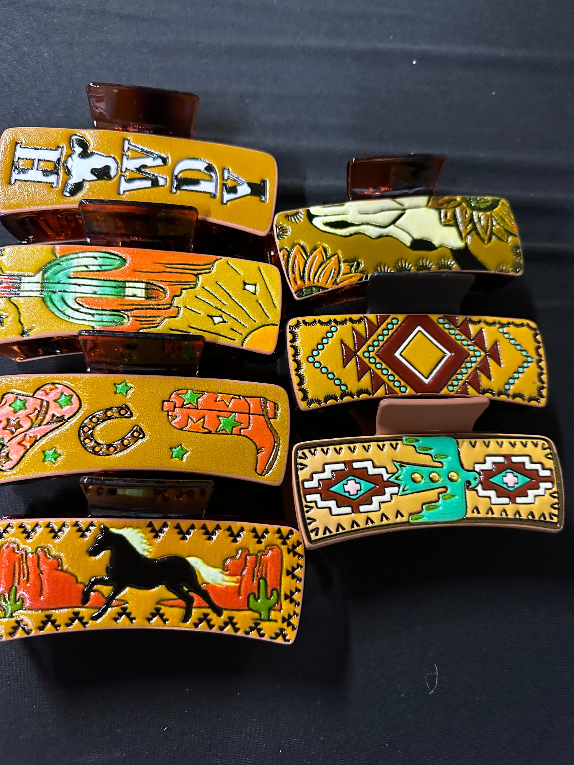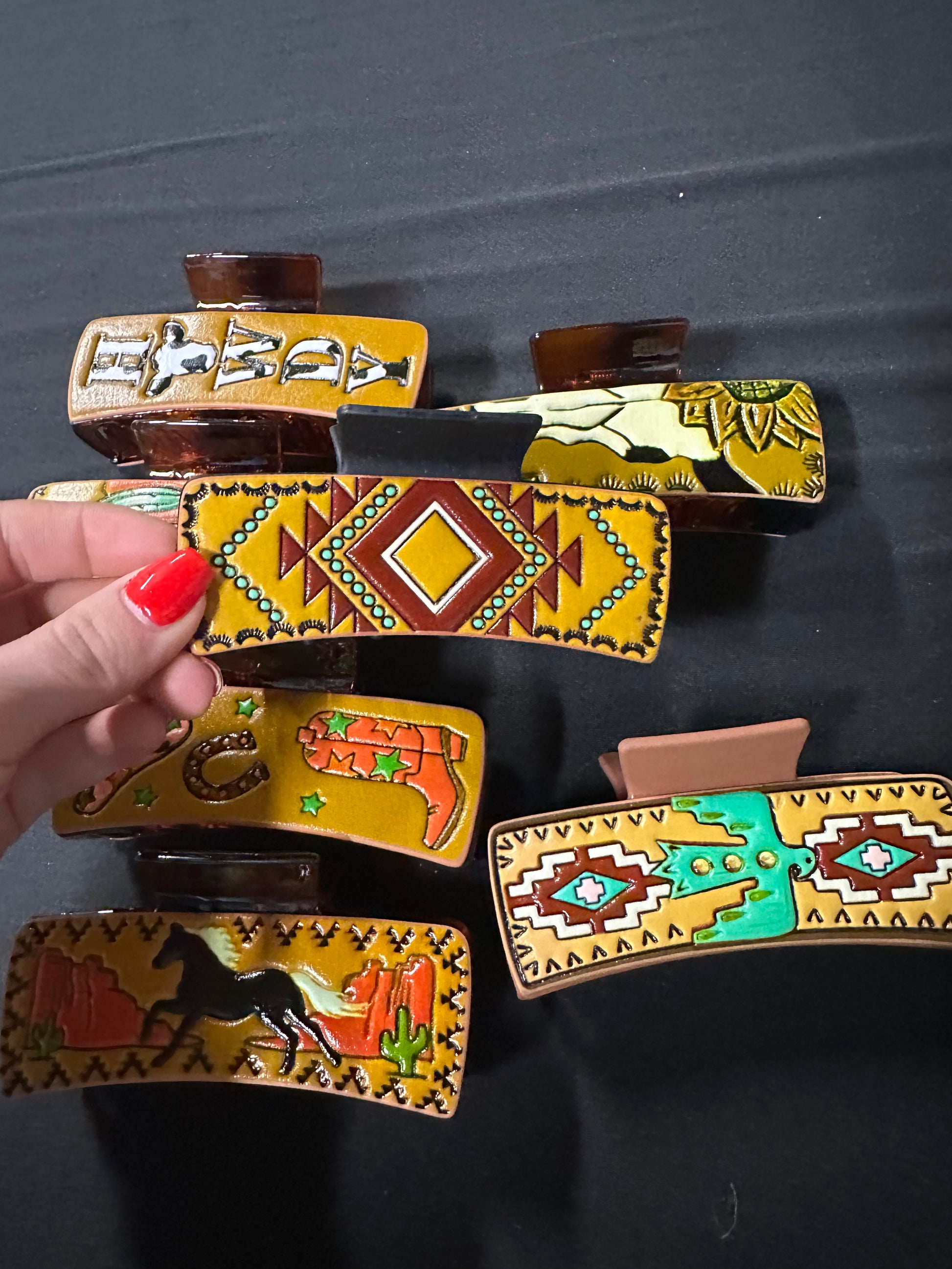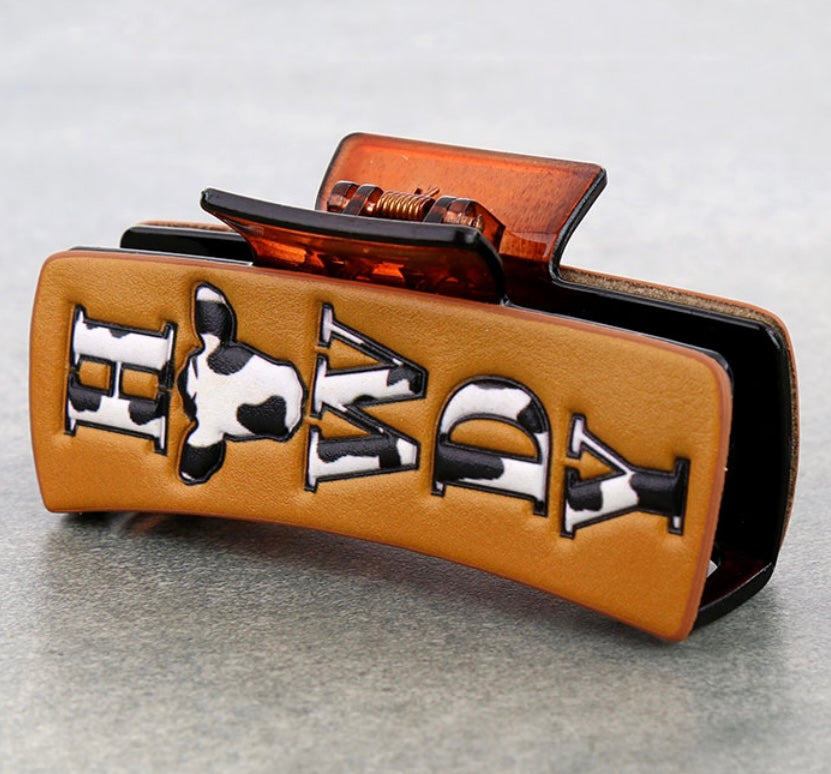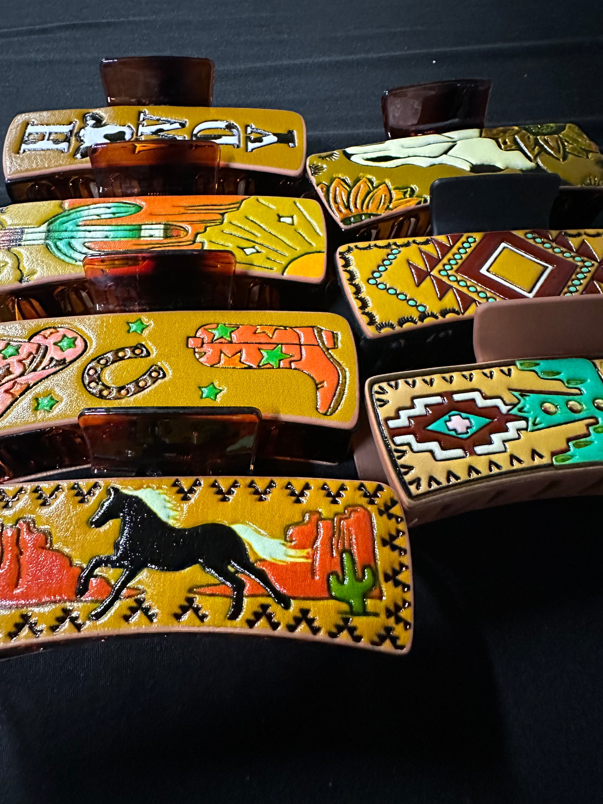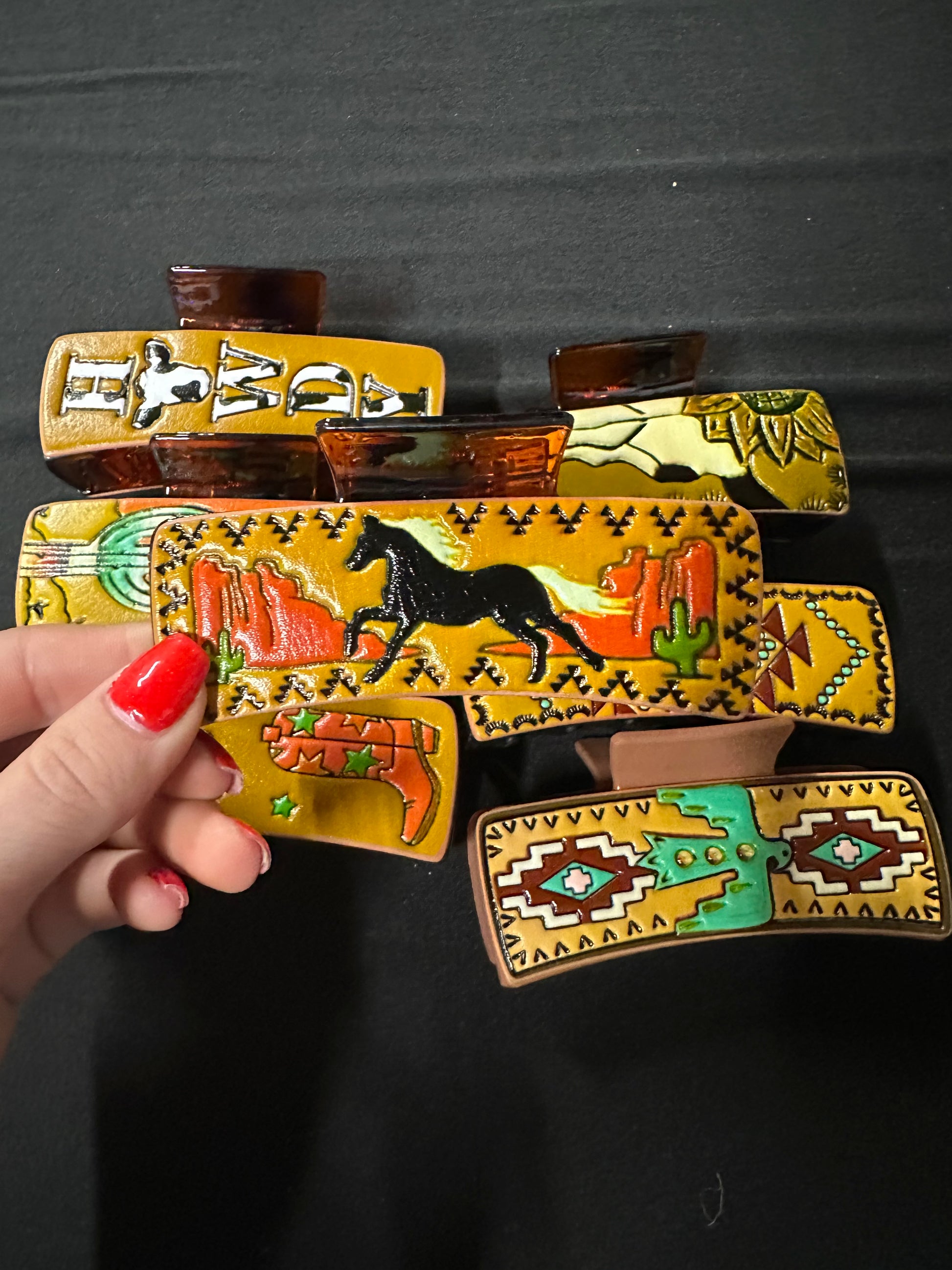Introducing the Large Tooled Leather Western Claw Clip, the perfect accessory for any western-inspired look. Made with high-quality tooled leather, this claw clip adds a touch of authenticity to any hairstyle. Expertly crafted for durability and style, this claw clip is a must-have for any western enthusiast.