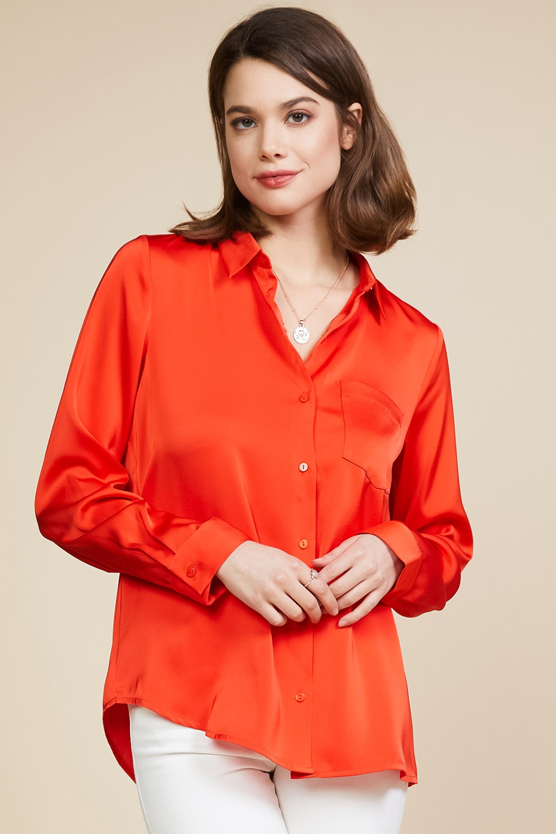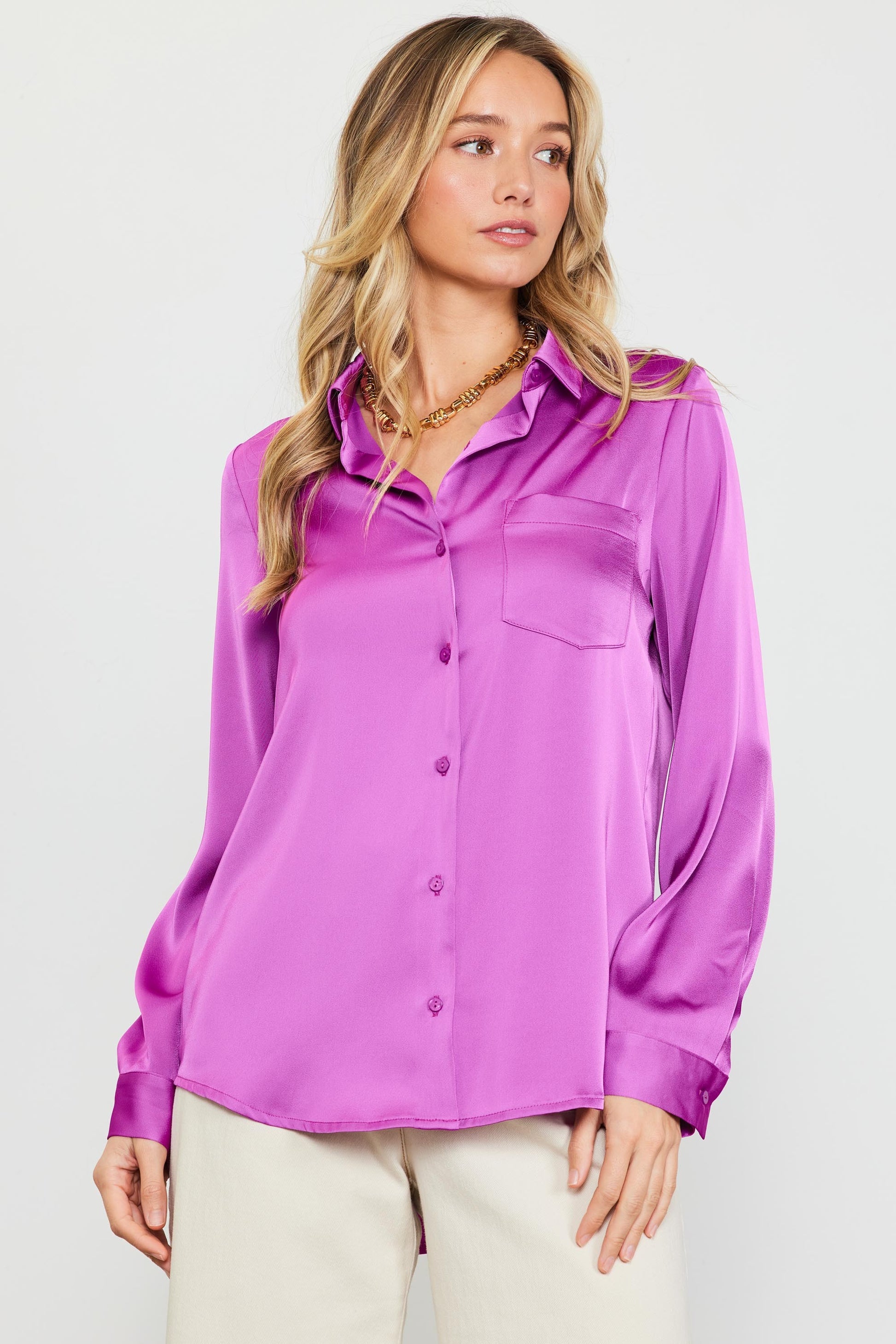 This long-sleeve satin button down shirt features a convenient pocket and is made from 100% polyester, ensuring durability and a luxurious feel.