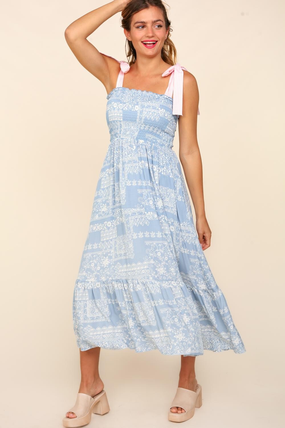 SMOCKING TUBE TOP SHOULDER STRAP BOW TIED SLEEVELESS FIT AND FLARE TIERED MAXI FLORAL PATCHWORK PRINT WOVEN DRESS WITH SIDE POCKETS
