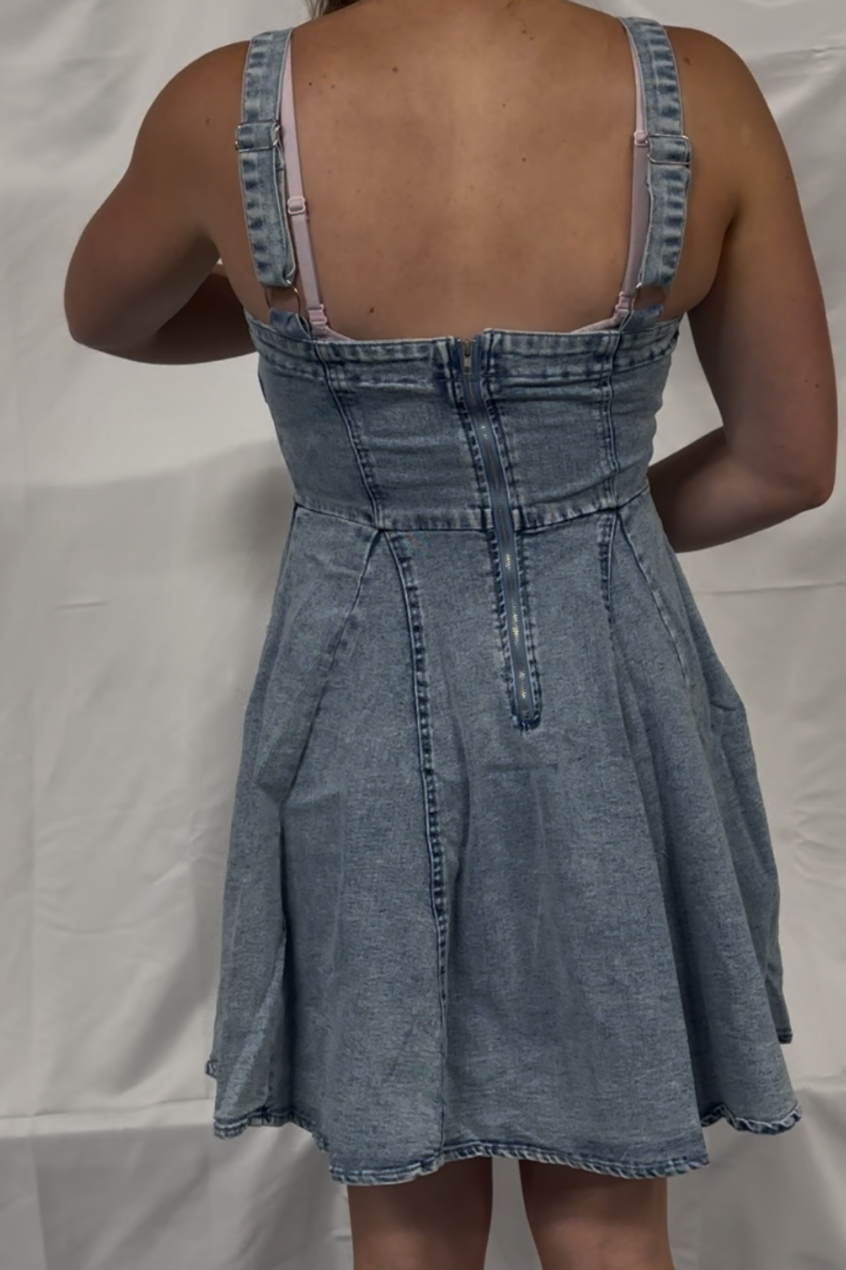 MINERAL WASHED BOW RIBBON DENIM FIT AND FLARE DRESS WITH BACK ZIPPER