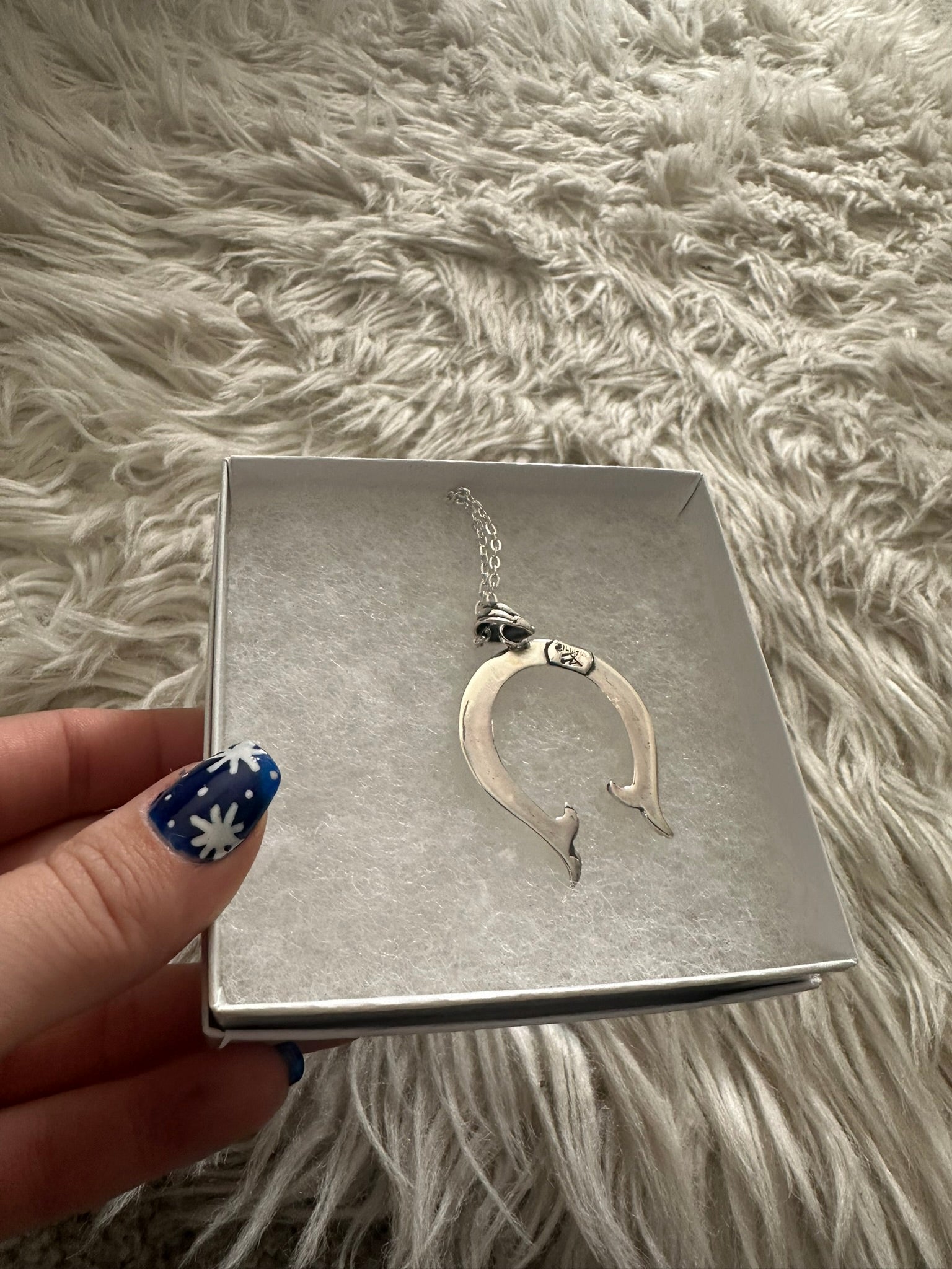 This striking naja pendant showcases authentic Native American craftsmanship in sterling silver. The crescent-shaped naja, a traditional symbol of protection and prosperity, features intricate detailing characteristic of Southwestern artistry. Suspended from a complementary silver chain, this piece combines cultural significance with timeless elegance. Perfect for collectors of indigenous jewelry or anyone seeking a meaningful accessory with historical depth. Each pendant carries the heritage and skilled artistry of Native American silversmithing traditions.