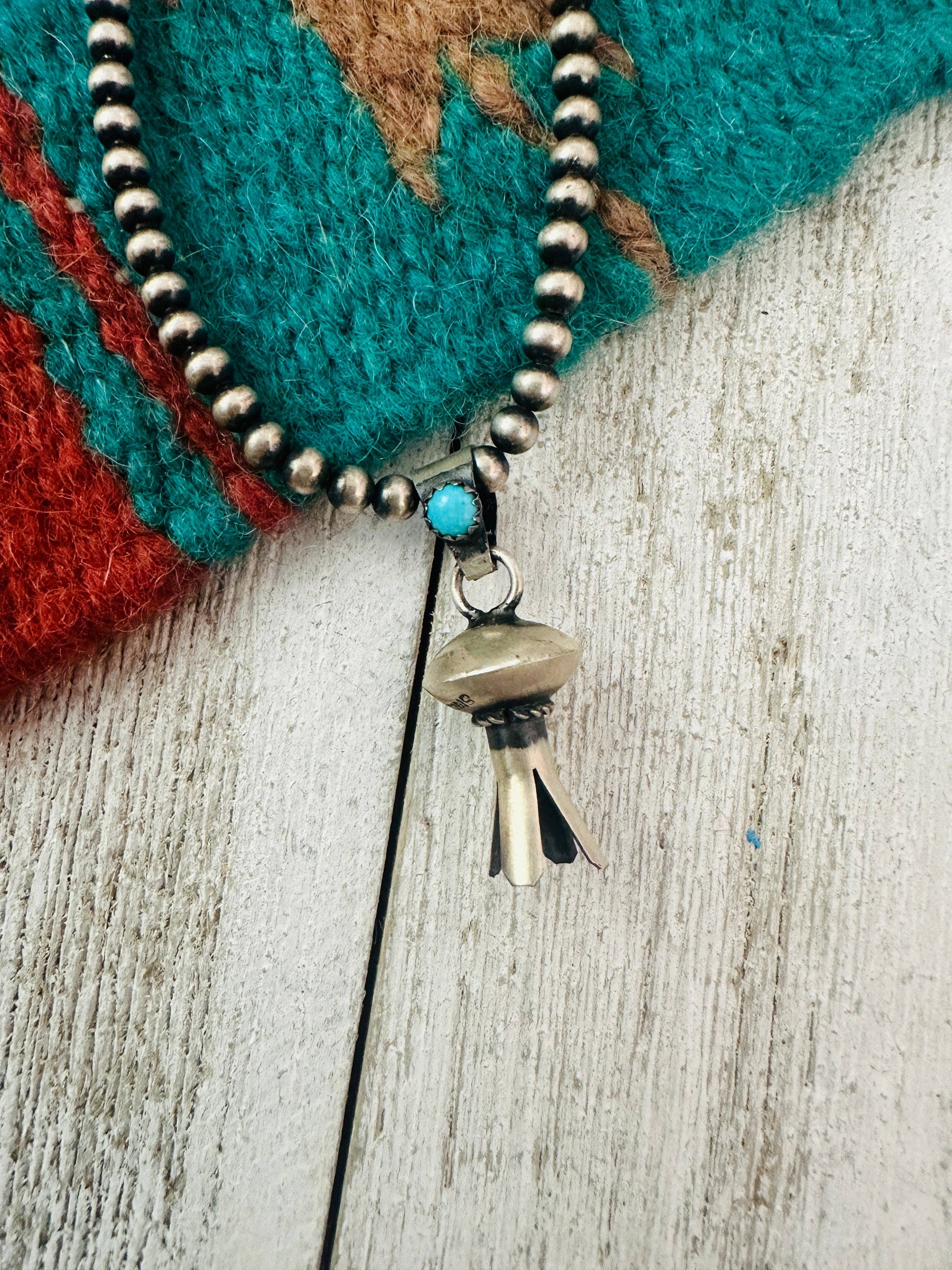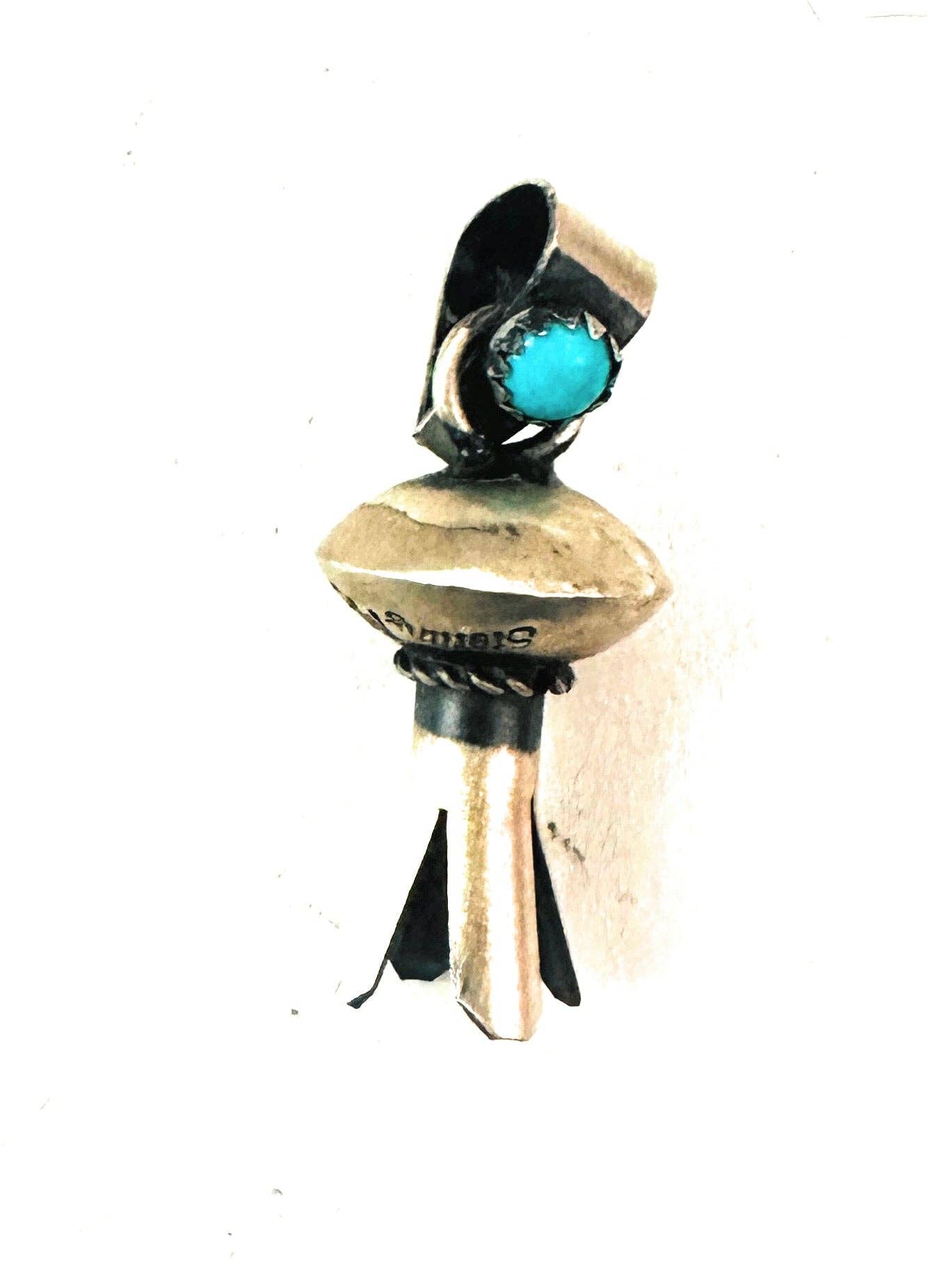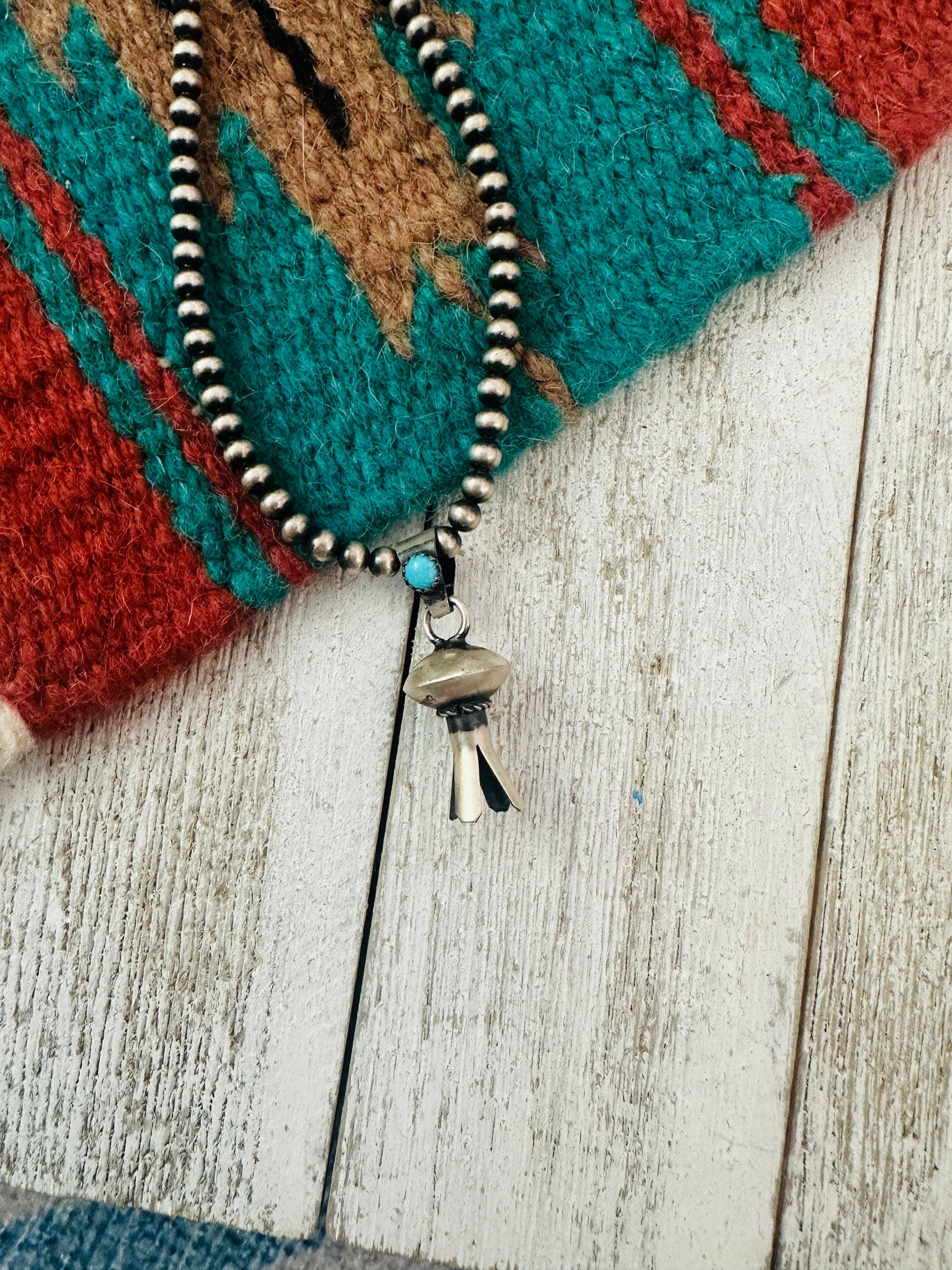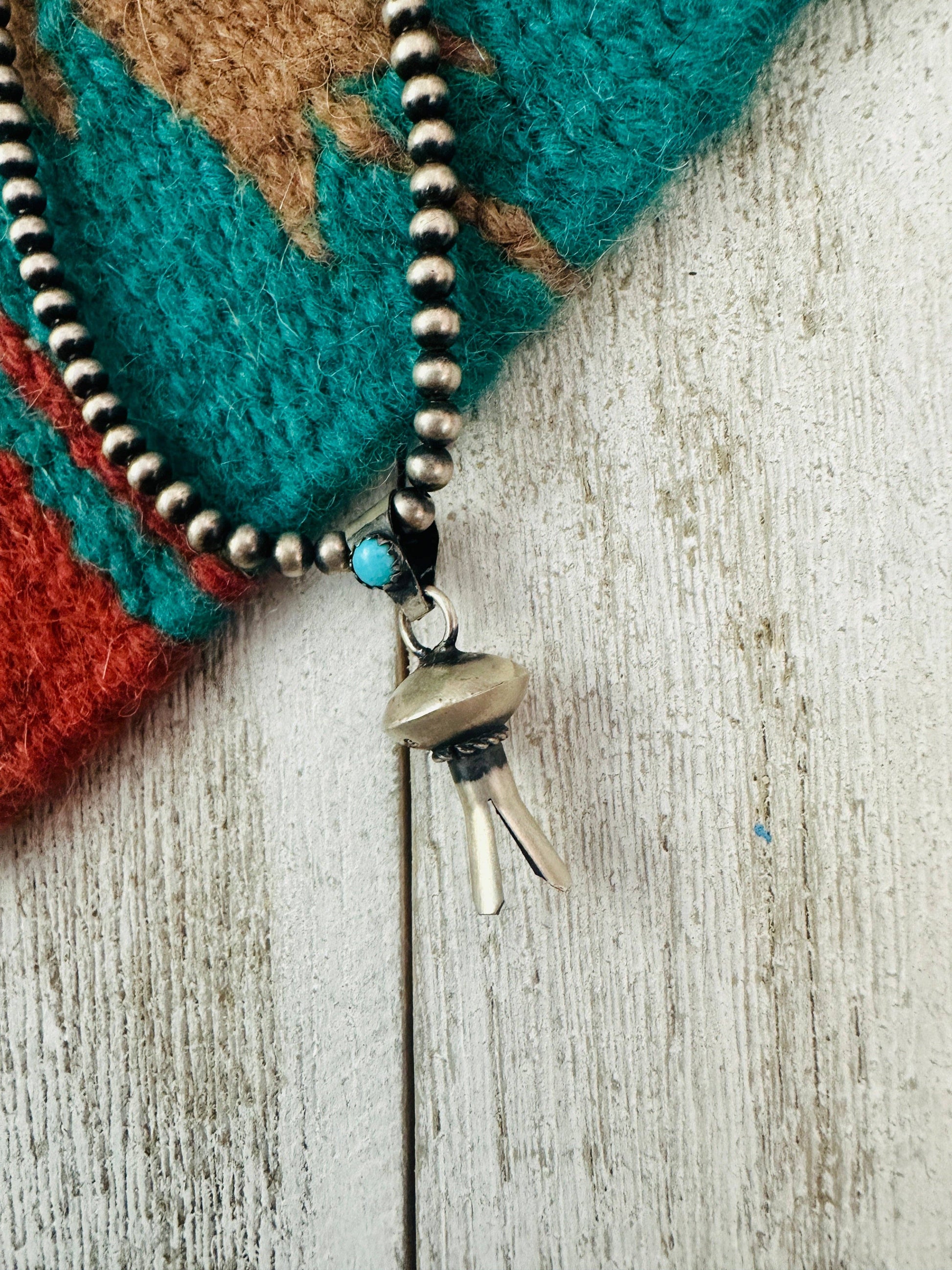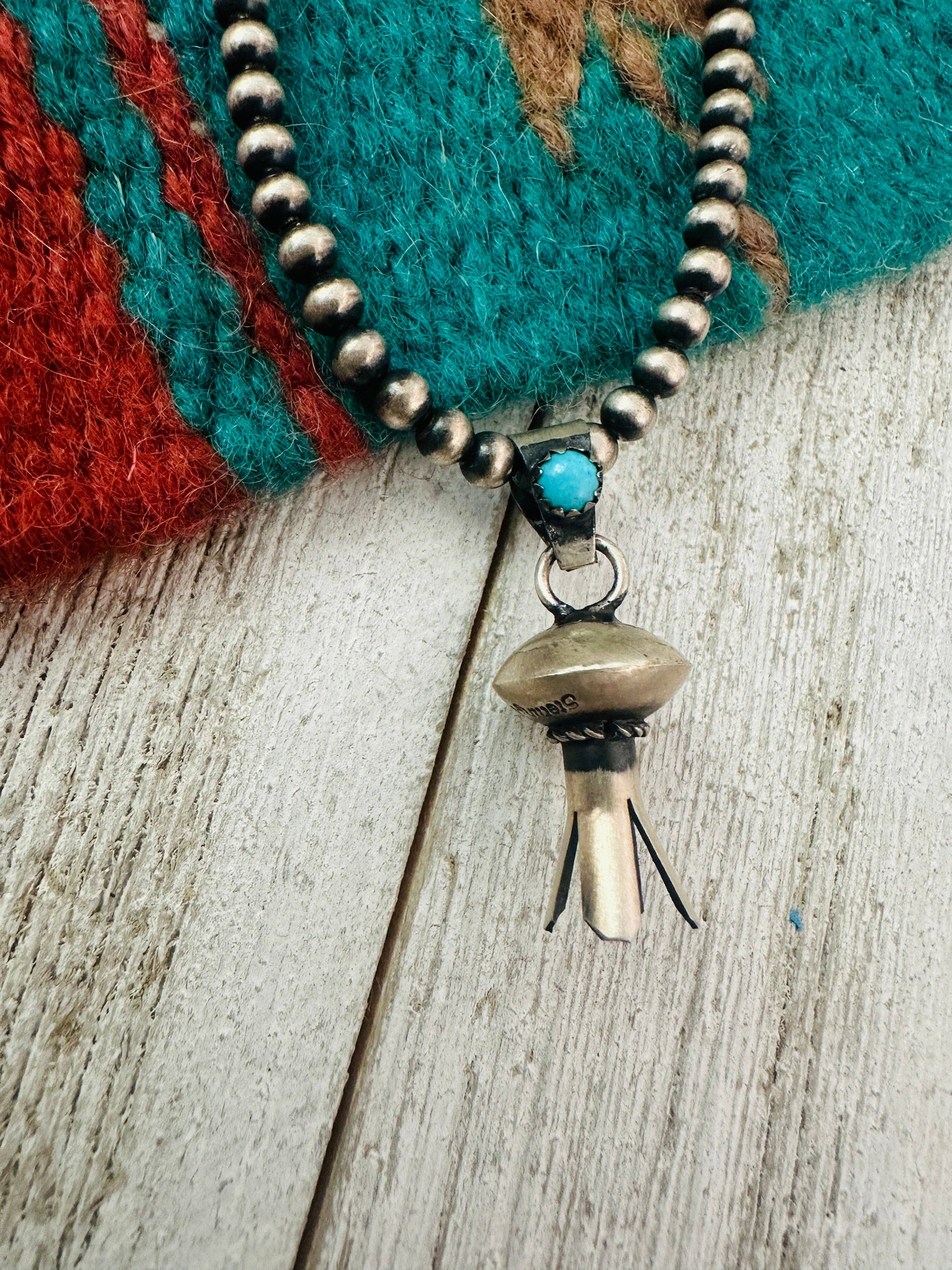 Navajo Handmade Turquoise and Sterling Silver Blossom Pendant. Such beautiful craftsmanship on this pendant! Pendant measures 1 1/4 inches long and 1/2 of an inch wide. Bale measures just over 1/8 of an inch across. Stamped Sterling and signed by the artist.