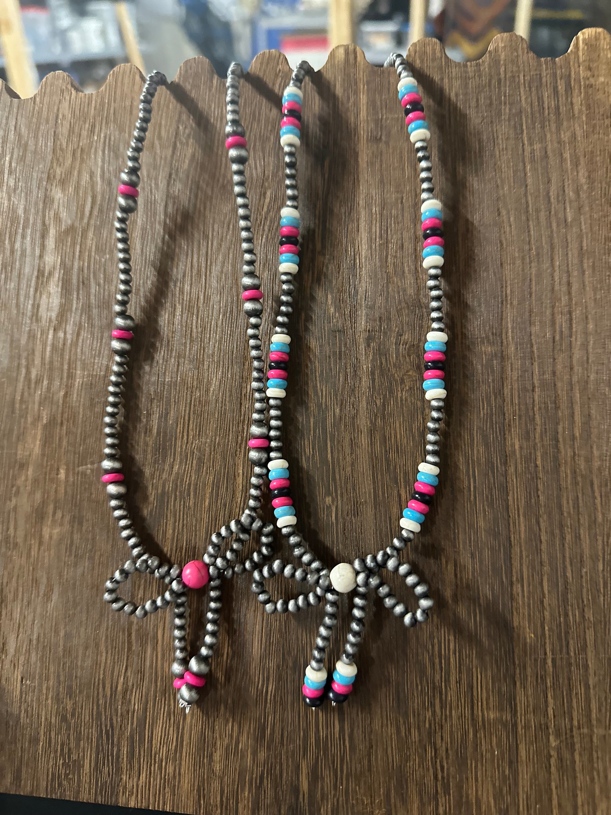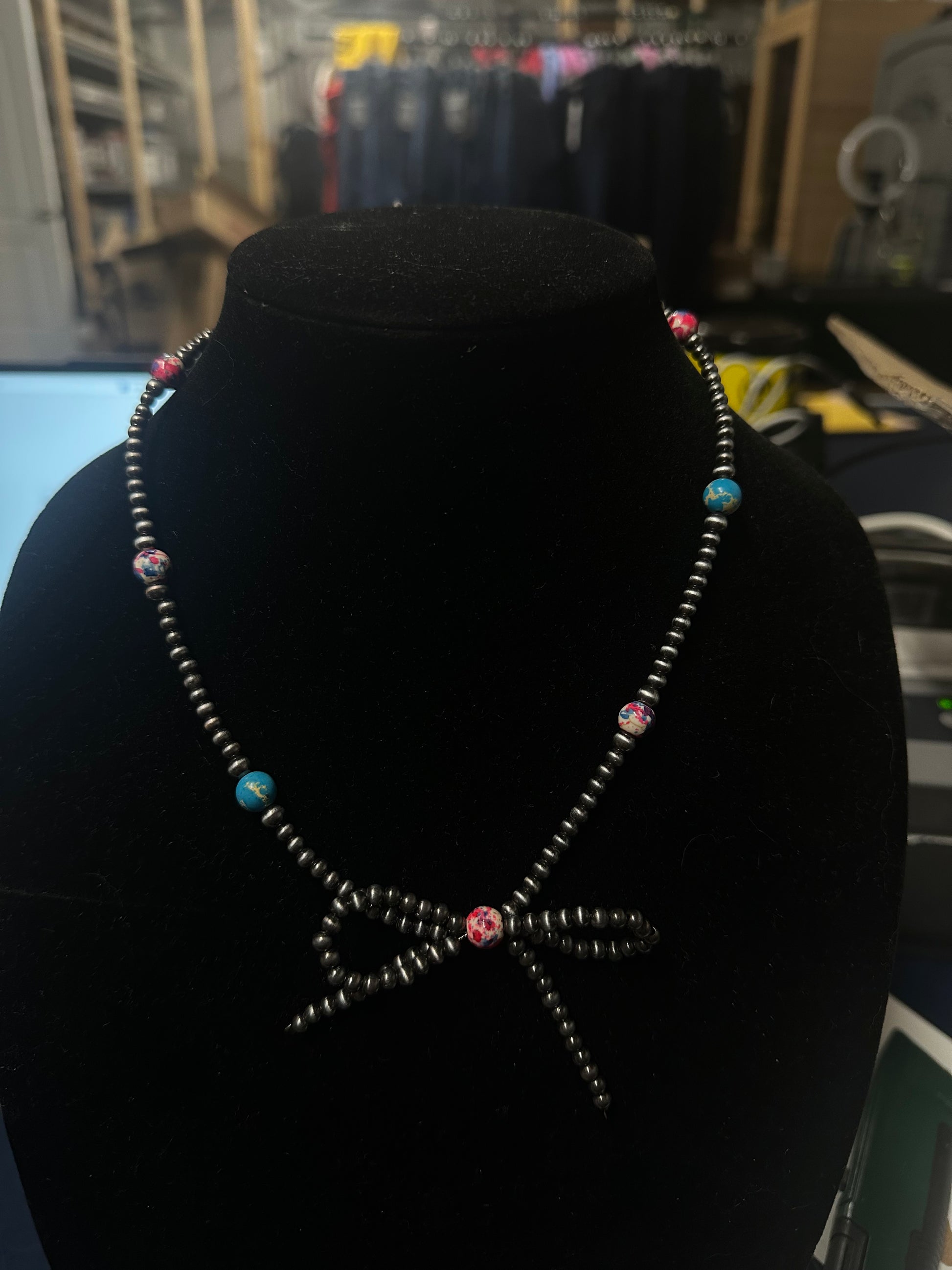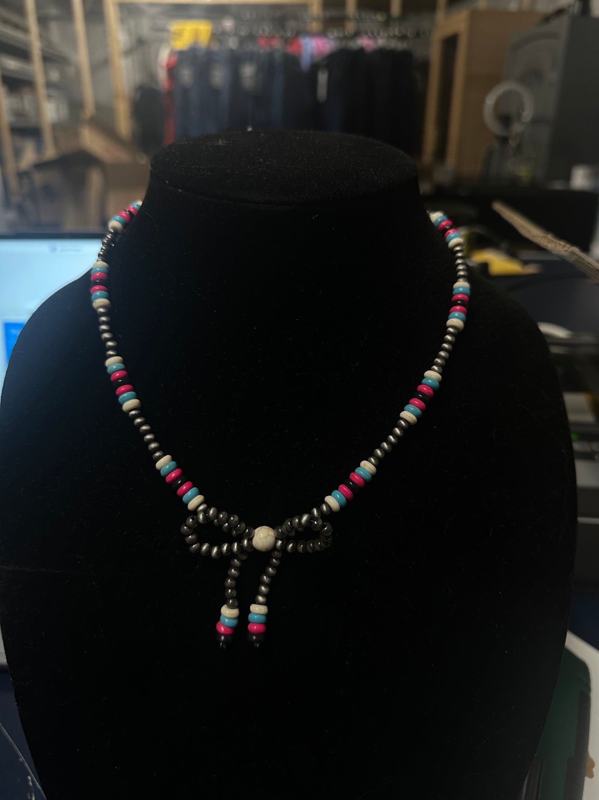 Highlight your unique style with a beautifully handcrafted Navajo Style Pearl & Bead Bow Necklace. The burnished silver and multi-colored beads add a touch of elegance to any outfit, making this necklace a must-have accessory for any occasion. With an adjustable length of 18 inches plus an additional 3 inches extension, you'll have the perfect fit every time you wear it. Elevate your fashion game with this stunning piece that showcases expert craftsmanship and timeless beauty.