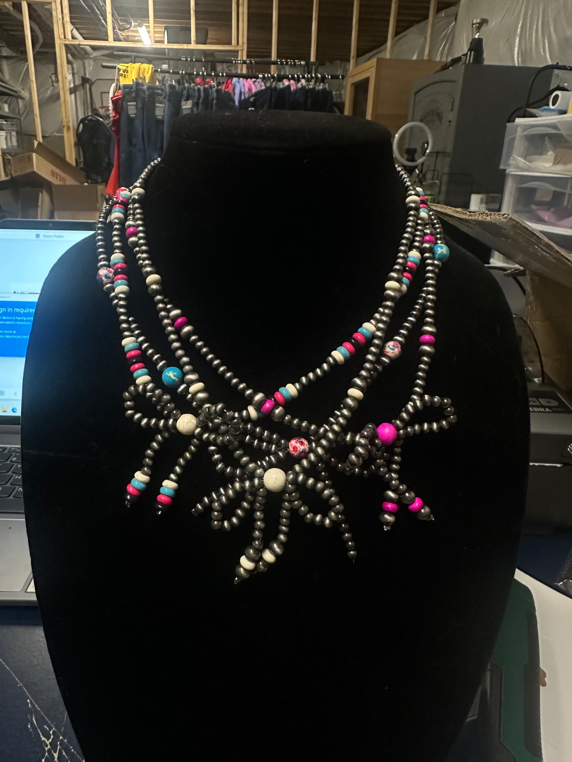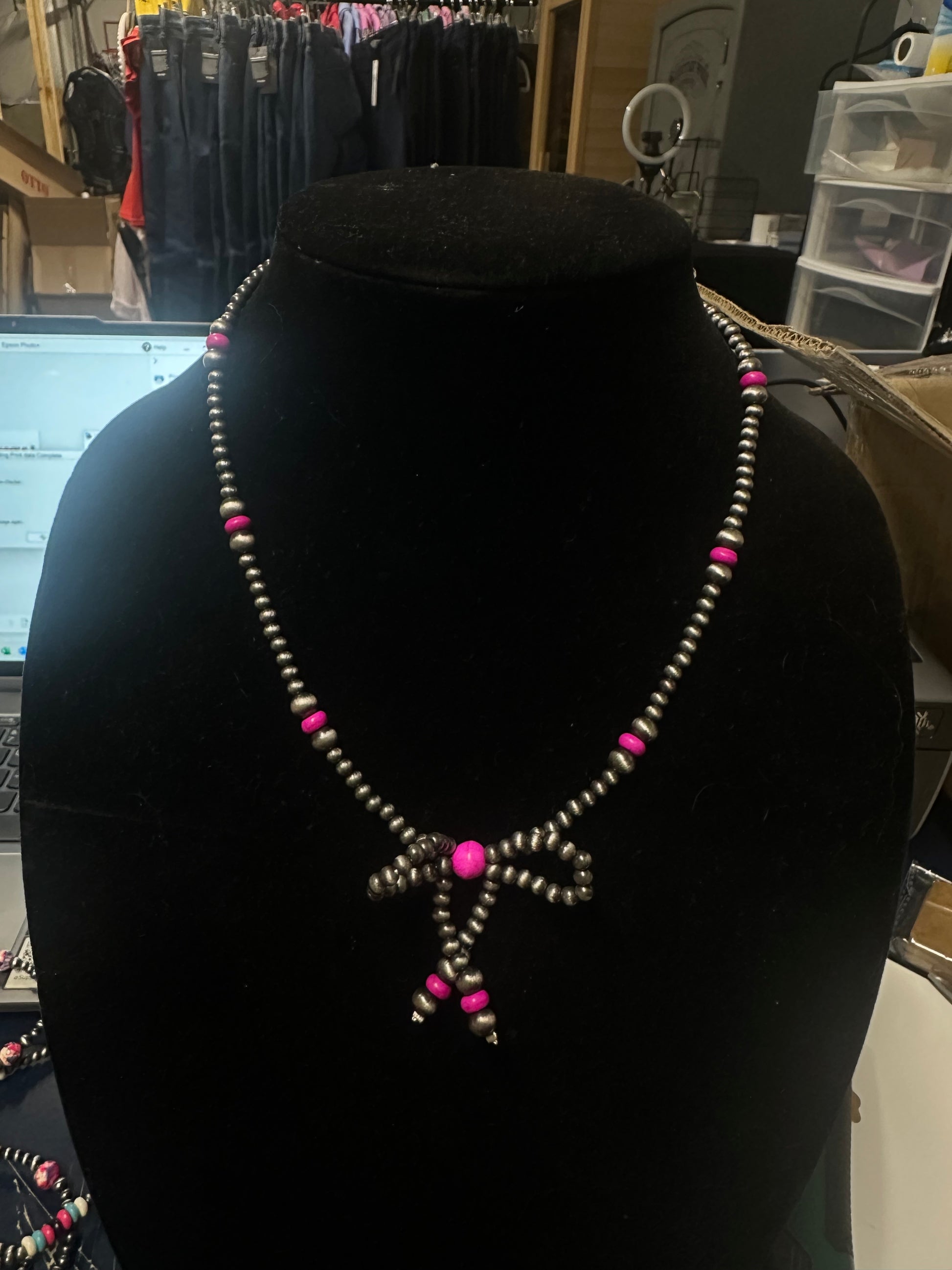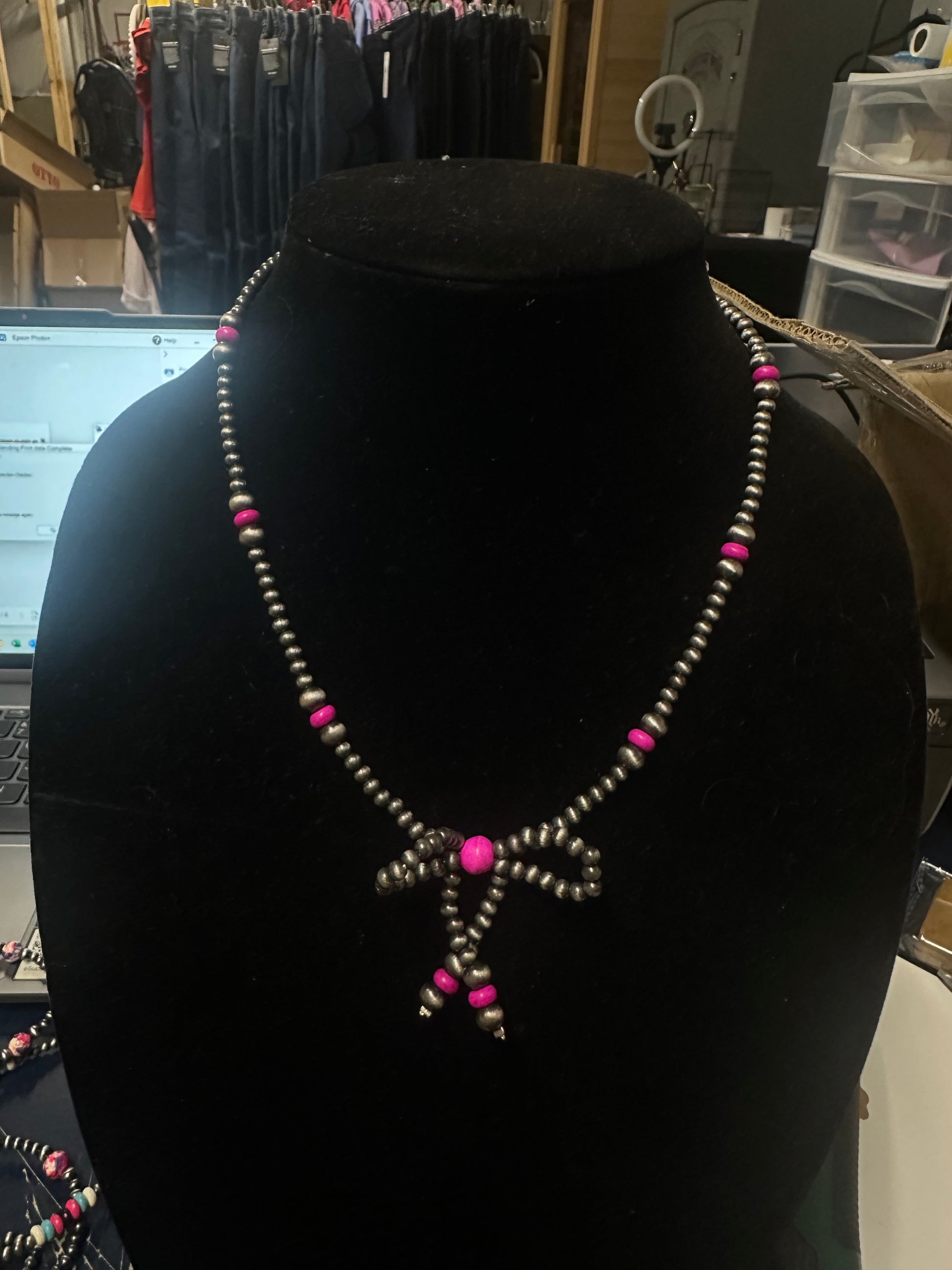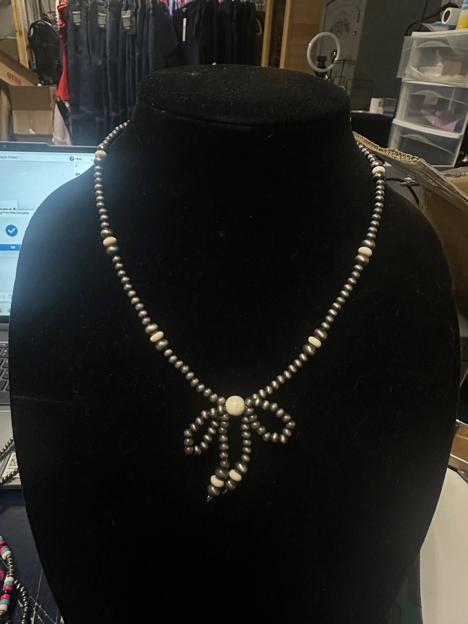 Highlight your unique style with a beautifully handcrafted Navajo Style Pearl & Bead Bow Necklace. The burnished silver and multi-colored beads add a touch of elegance to any outfit, making this necklace a must-have accessory for any occasion. With an adjustable length of 18 inches plus an additional 3 inches extension, you'll have the perfect fit every time you wear it. Elevate your fashion game with this stunning piece that showcases expert craftsmanship and timeless beauty.