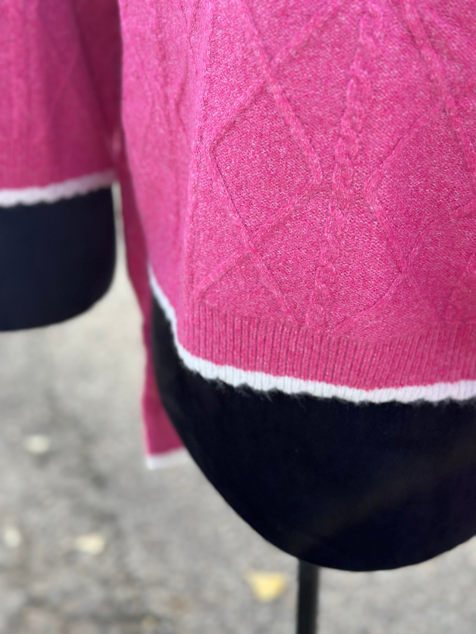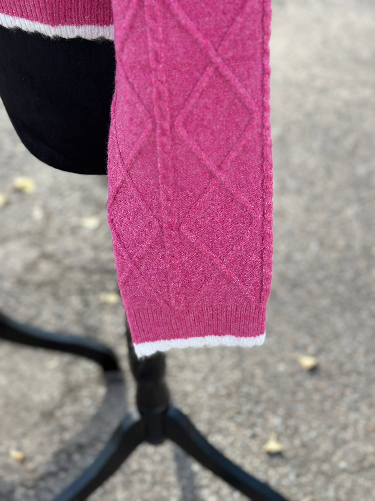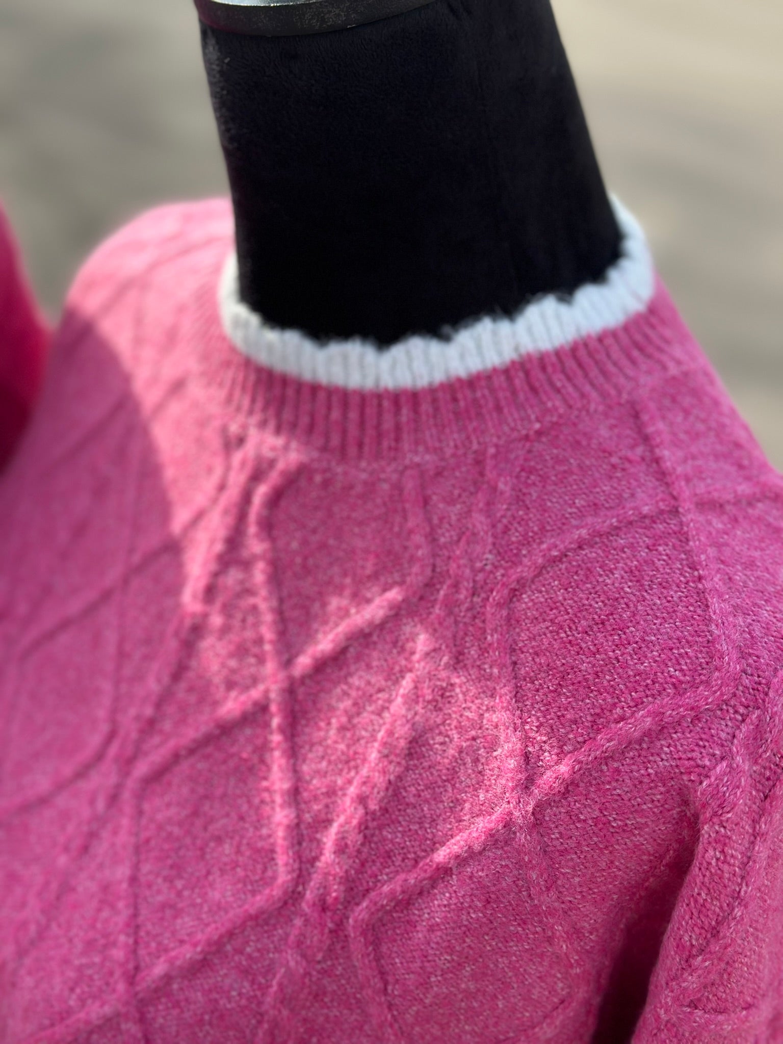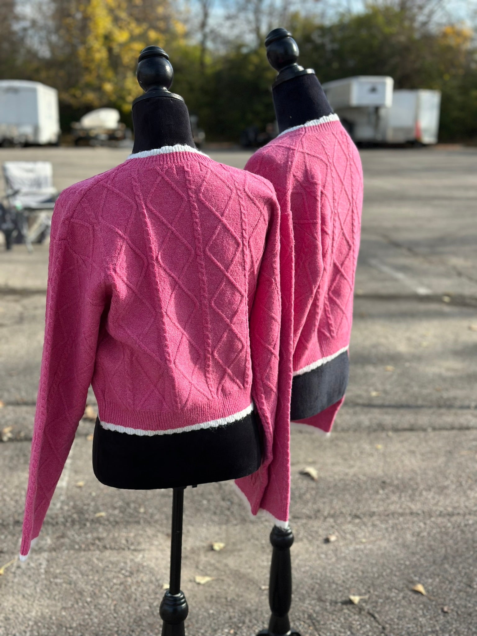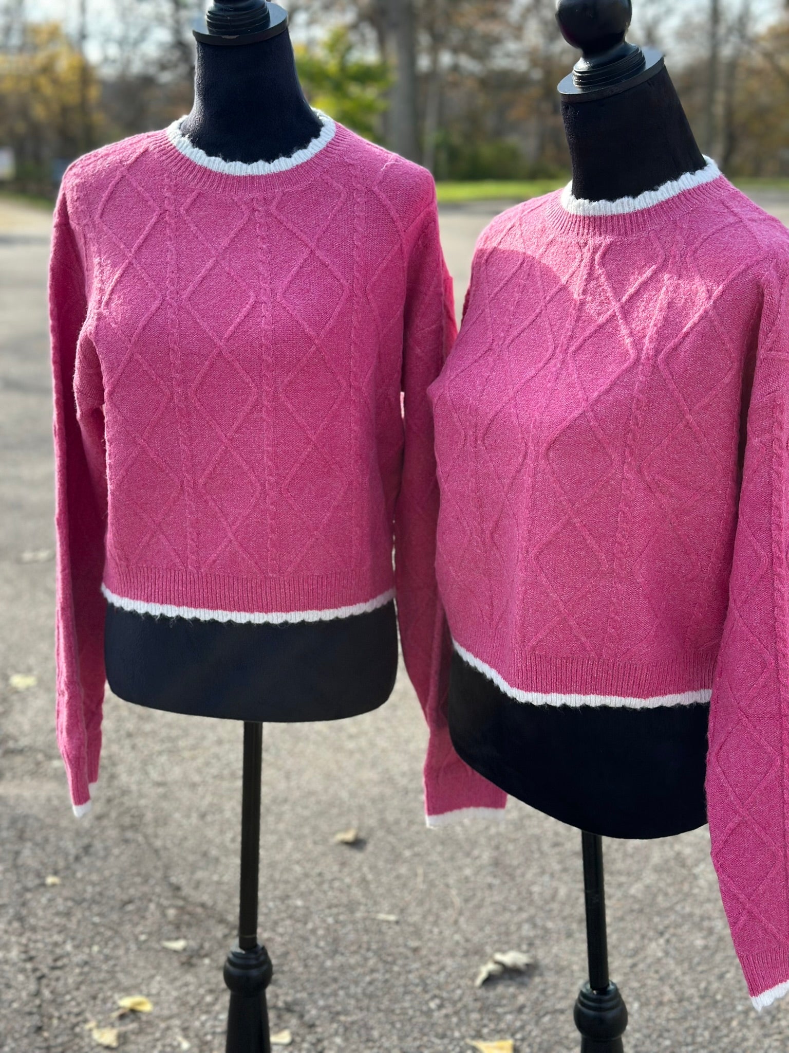 + Cable knit cropped sweater + Super soft + Contrast scalloped trim on neckline, cuffs, and hem + Round neckline + Drop shoulder long sleeves + Cropped length + Cable knit pattern