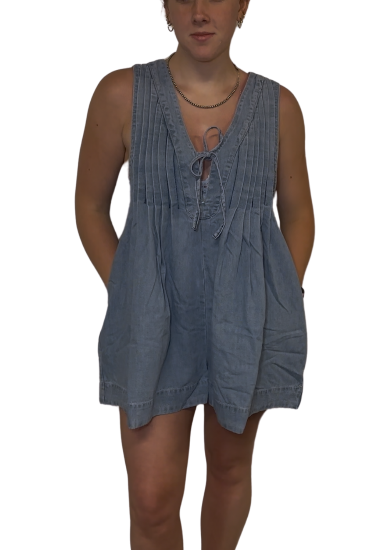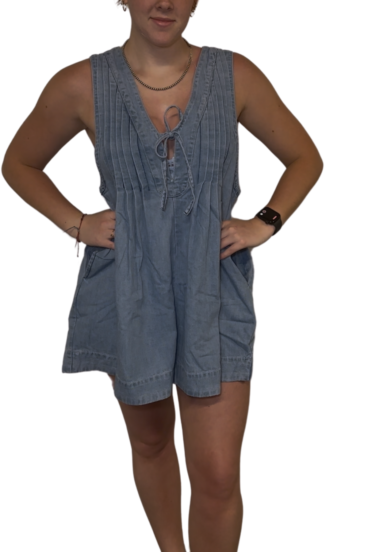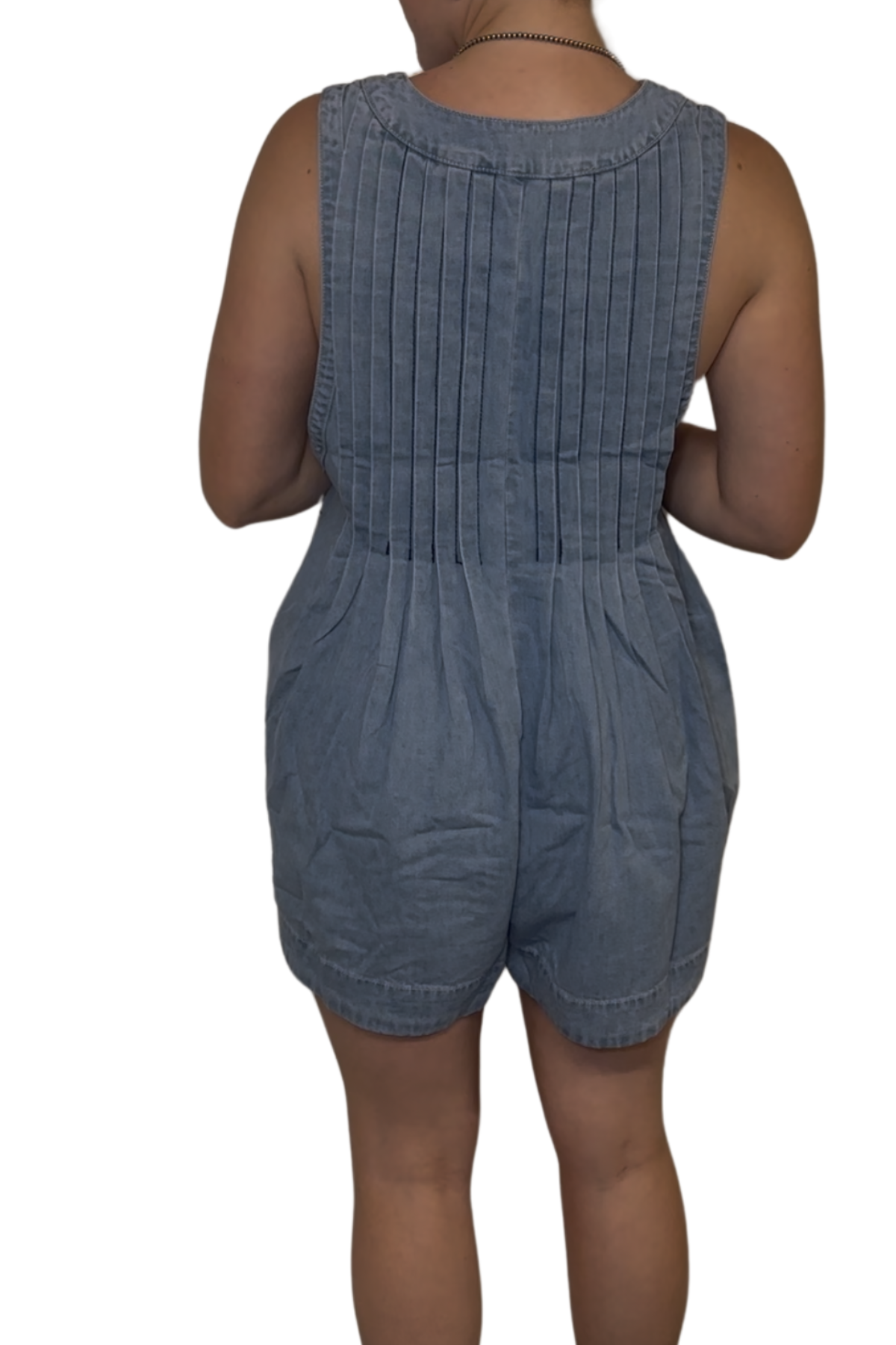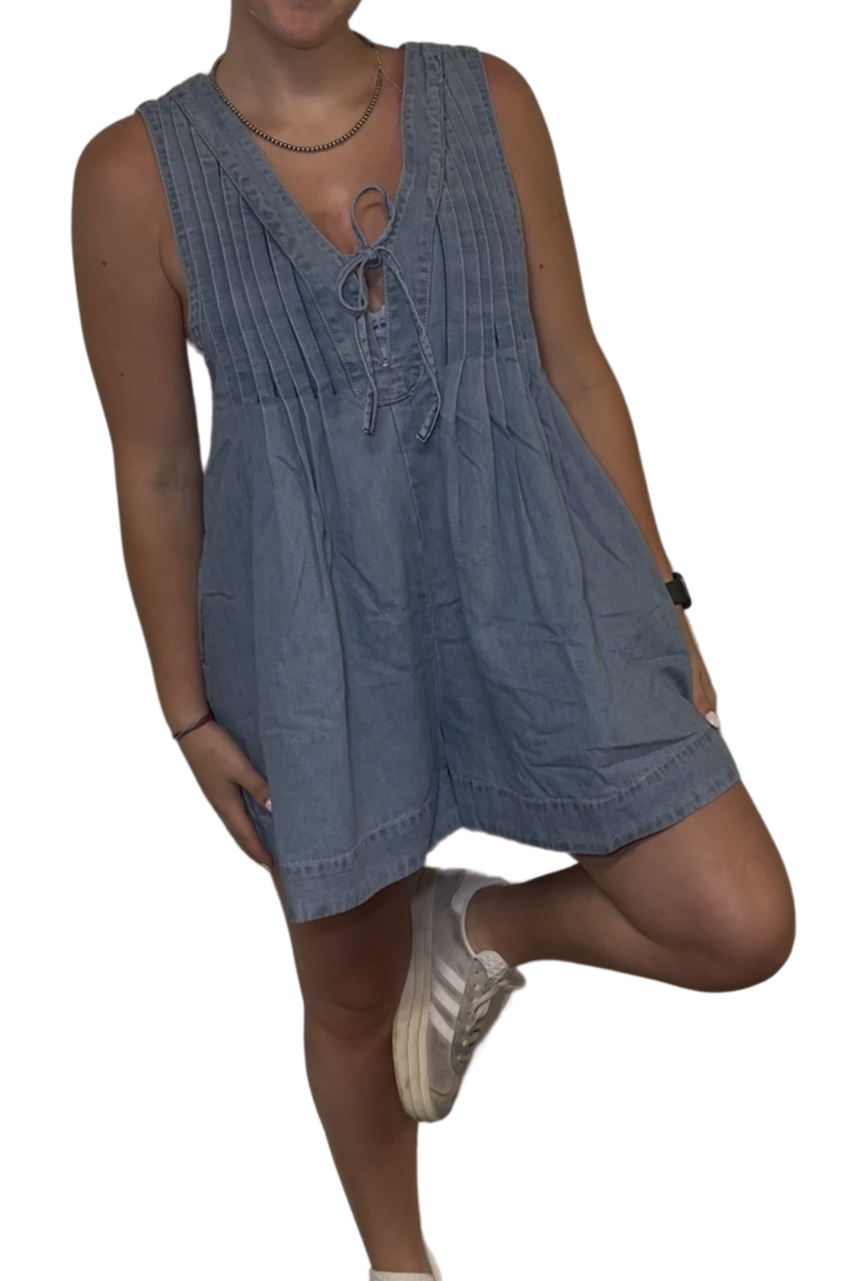Featuring a trendy denim wash, this romper combines a relaxed,
