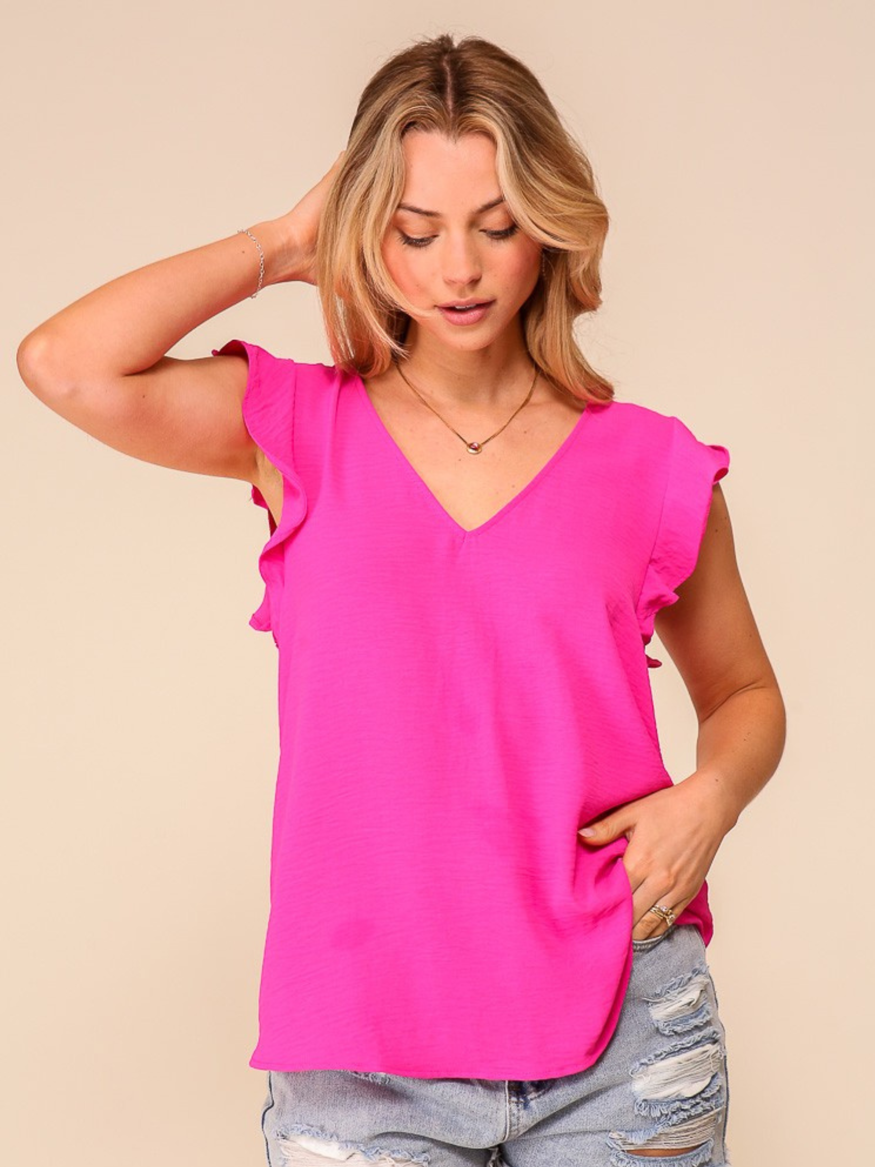 Ruffle up your style with this airy fabric top featuring cap sleeves and a chic V-neck. Embrace the loose fit for an effortlessly stylish look. Great for game day, mother's day, fourth of July, lake life, summer, spring, bbq, festival, fairs, prom, graduation, weddings, bride, bridal, memorial day, labor day, back to school.