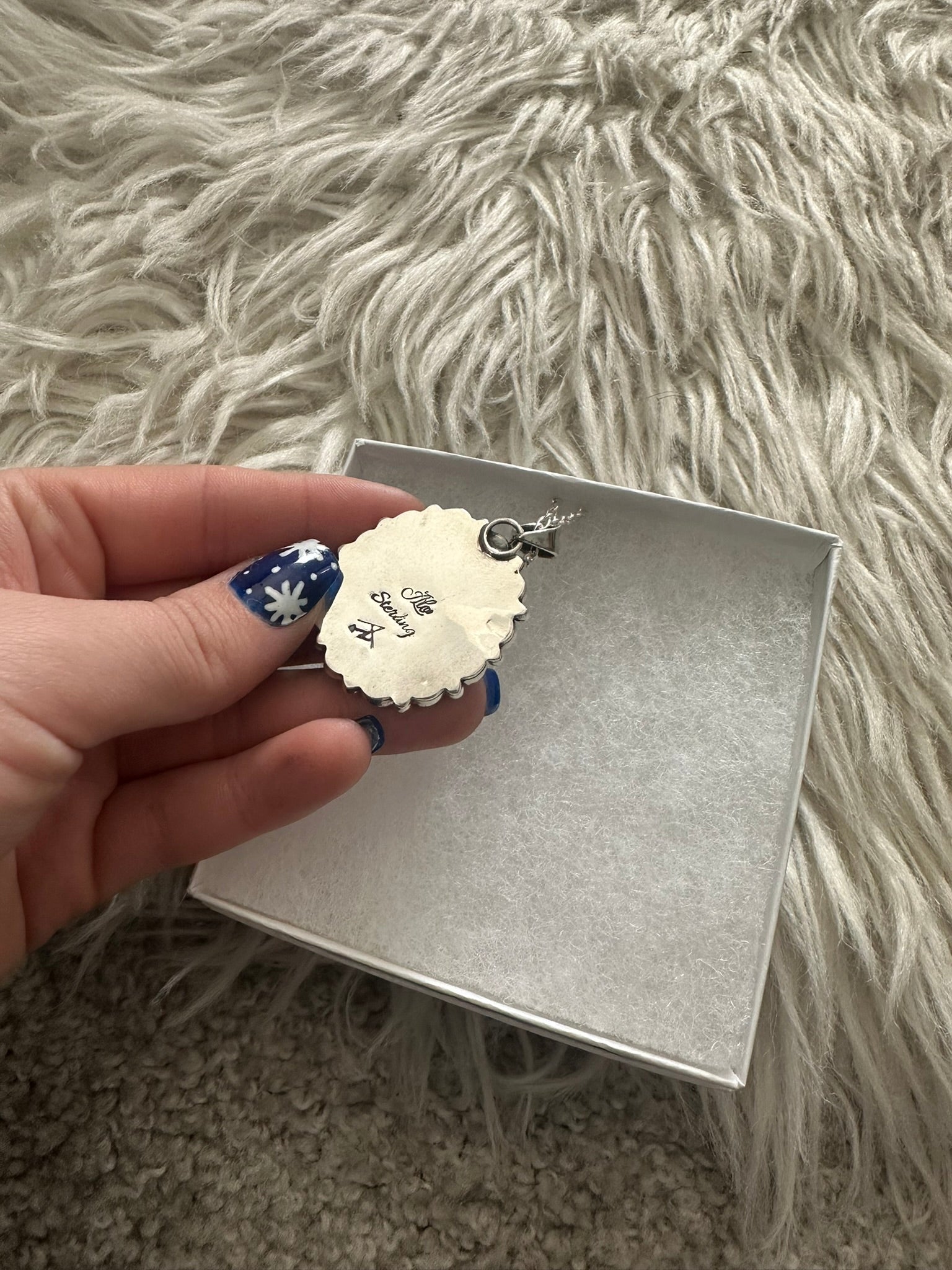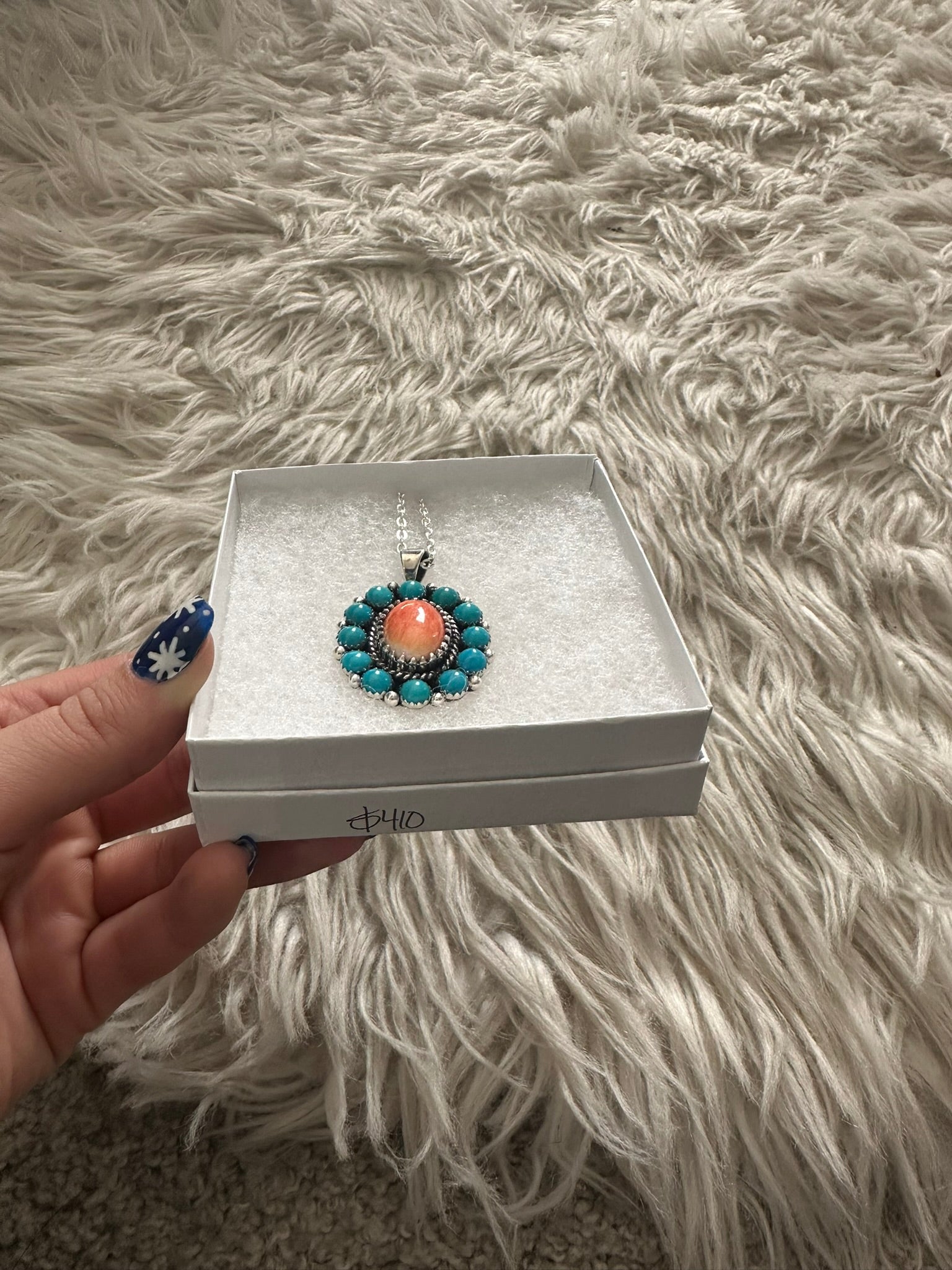 Handcrafted Navajo sterling silver pendant featuring a striking cluster of spiny oyster turquoise stones arranged in a traditional flower motif. This artisan piece showcases the distinctive characteristics of spiny oyster turquoise—vibrant color variations and natural matrix patterns—set within meticulously worked silver. The intricate floral design demonstrates authentic Southwestern craftsmanship, making it a distinctive addition to any jewelry collection. Perfect for those who appreciate genuine Native American artistry and the unique beauty of natural gemstones.