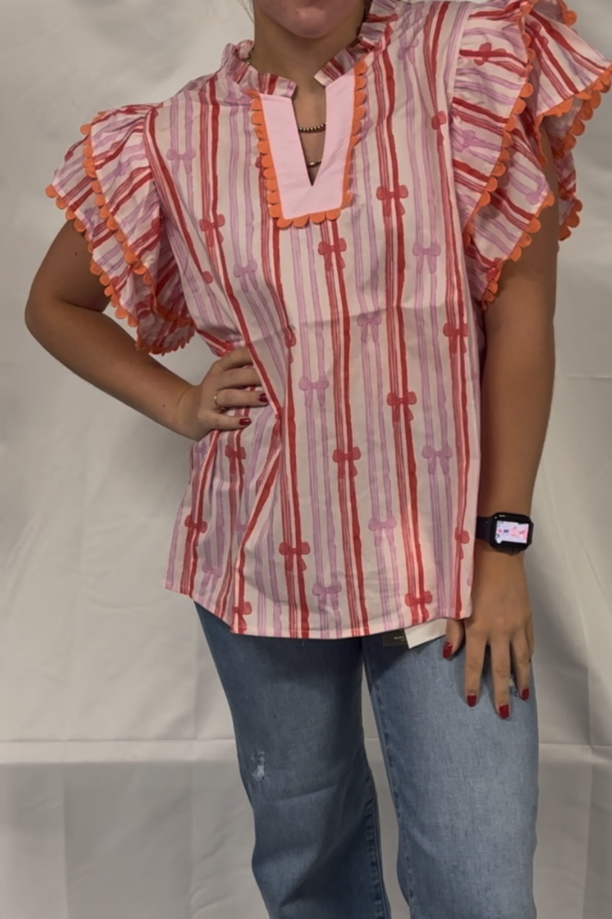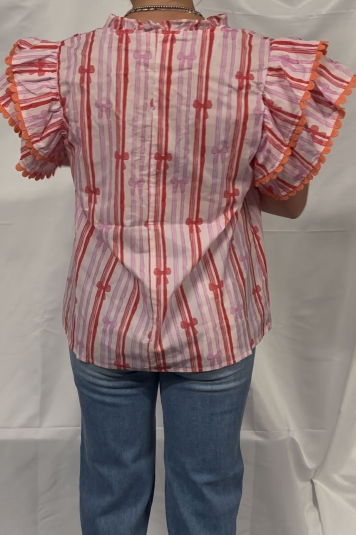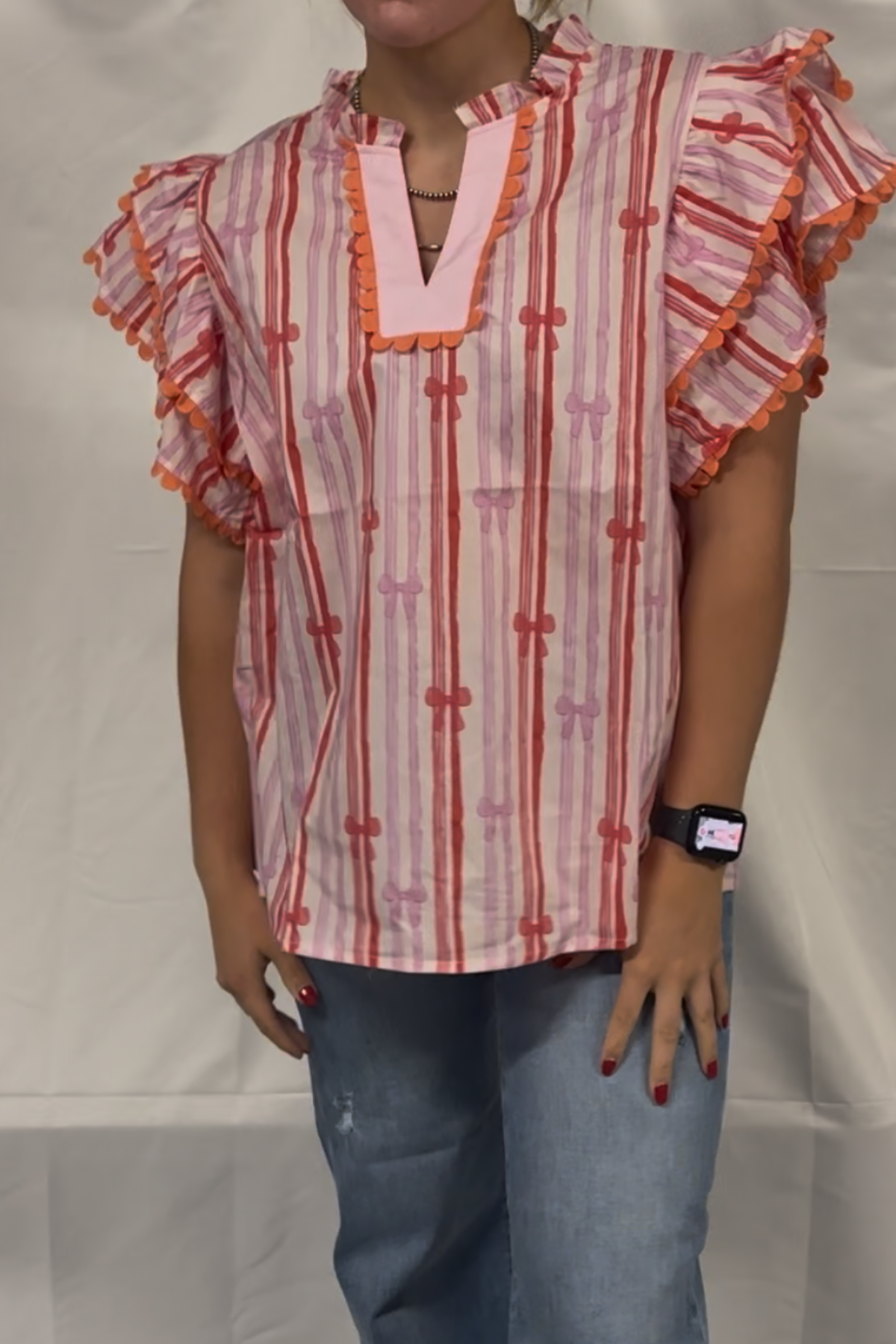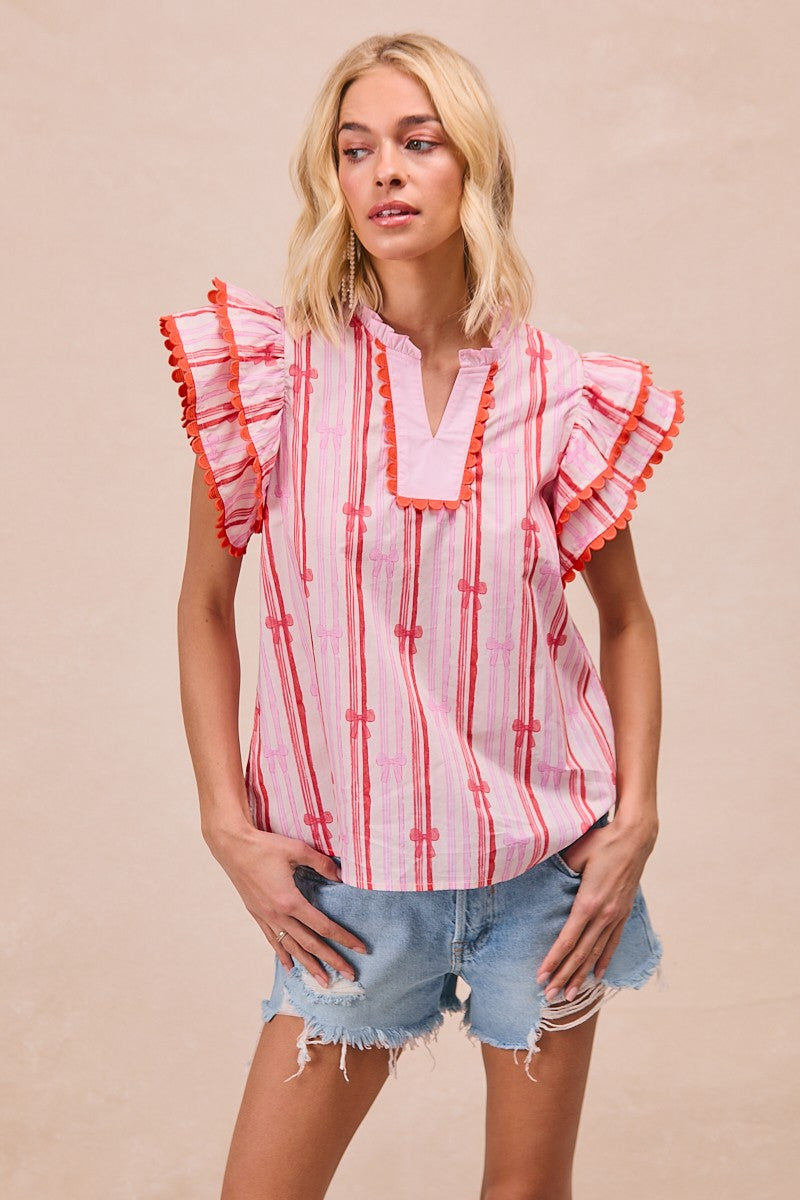 STRIPED BOW PRINTED WOVEN SCALLOPED EDGE DETAIL V NECK TOP 100%COTTON