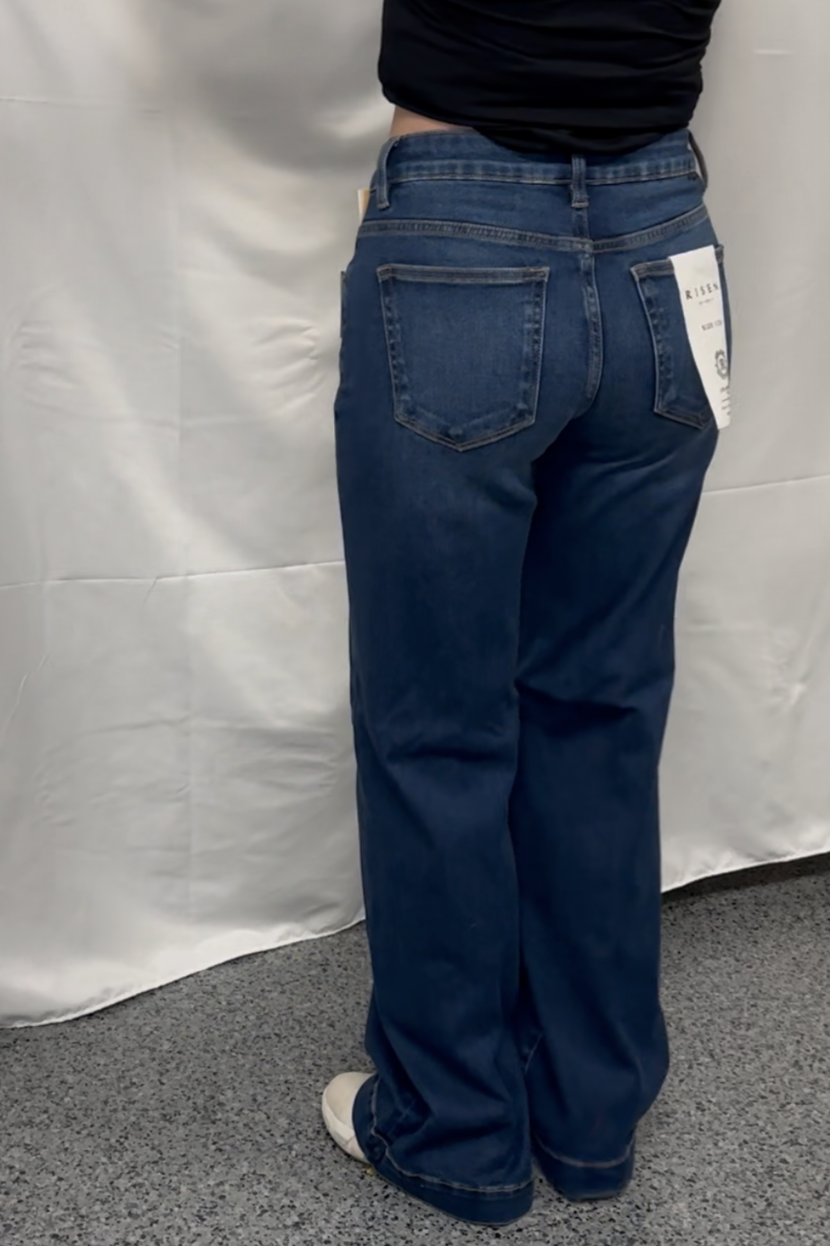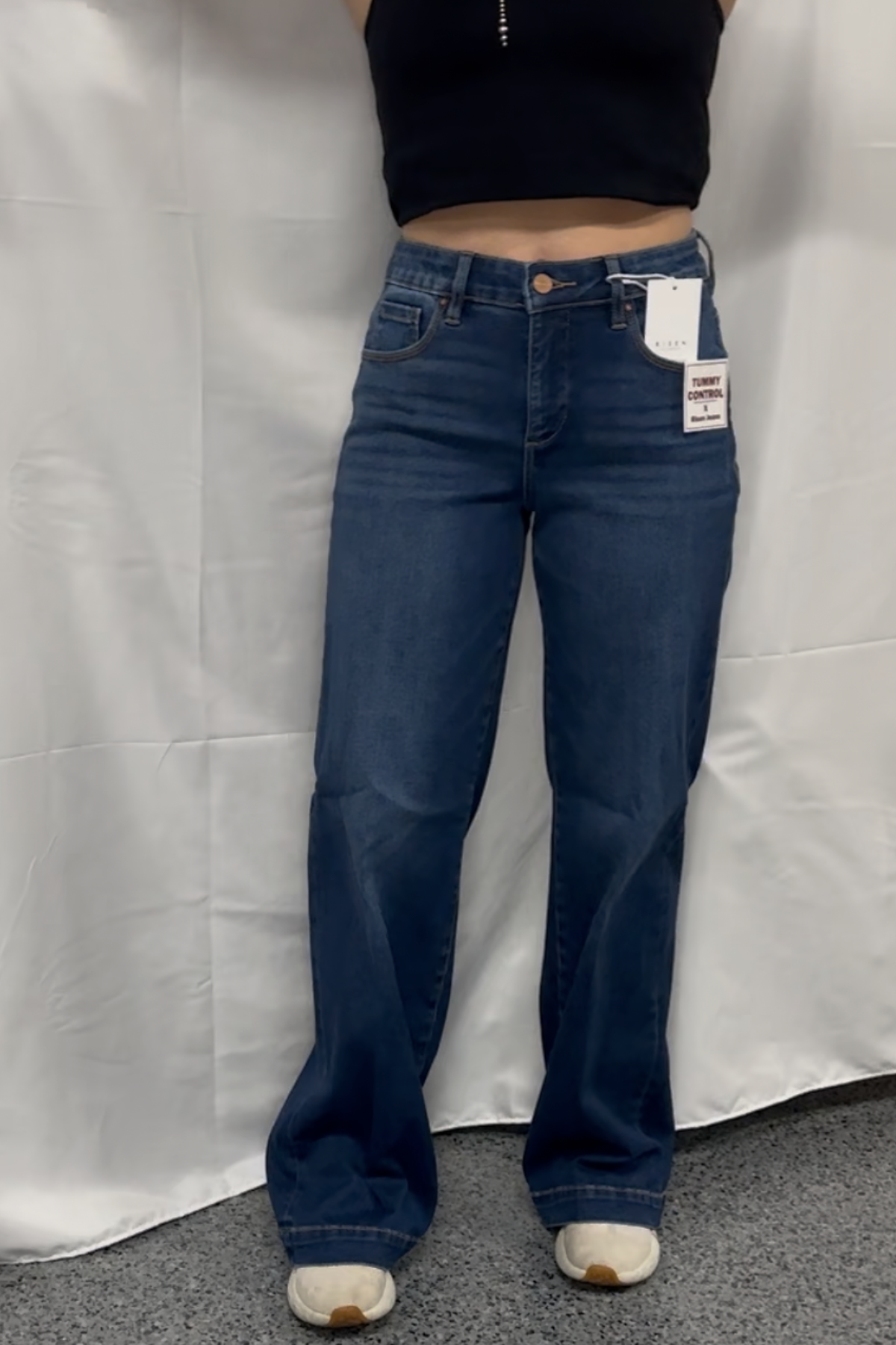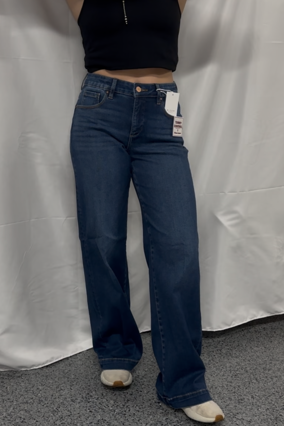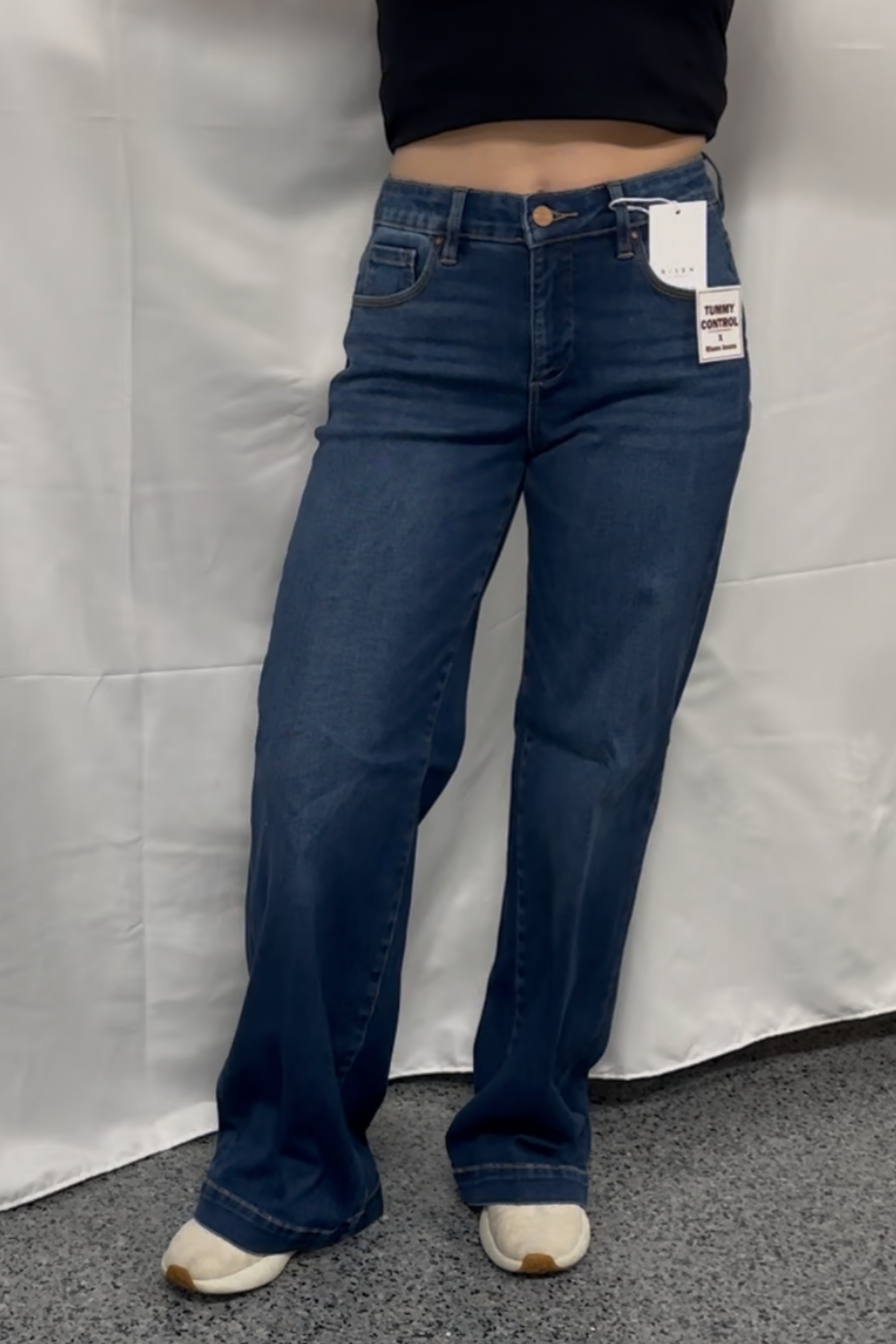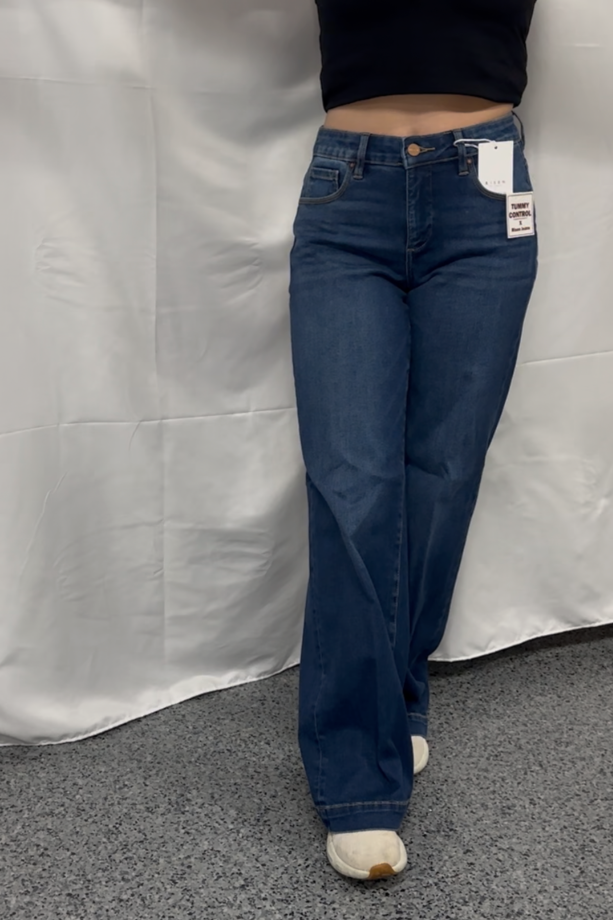 TUMMY CONTROL MID RISE WIDE LEG FRONT & BACK IRON PRESS LINE DETAILED JEANS - Rise 9 1/2" | Inseam 32 1/2" in size 3/26 - Model Info: Height 5'8" | Waist 24" | Hips 34" - Model is wearing size 1