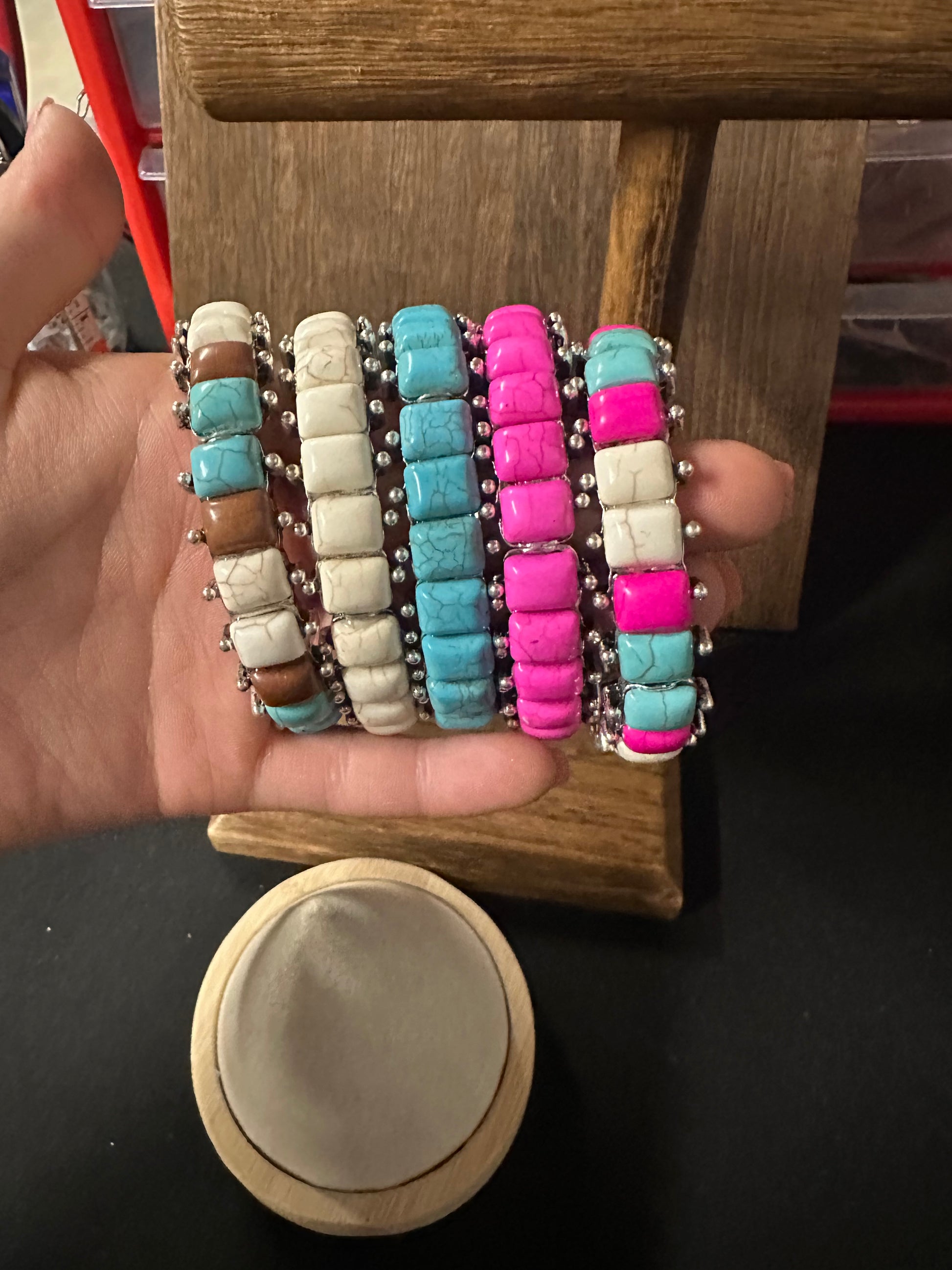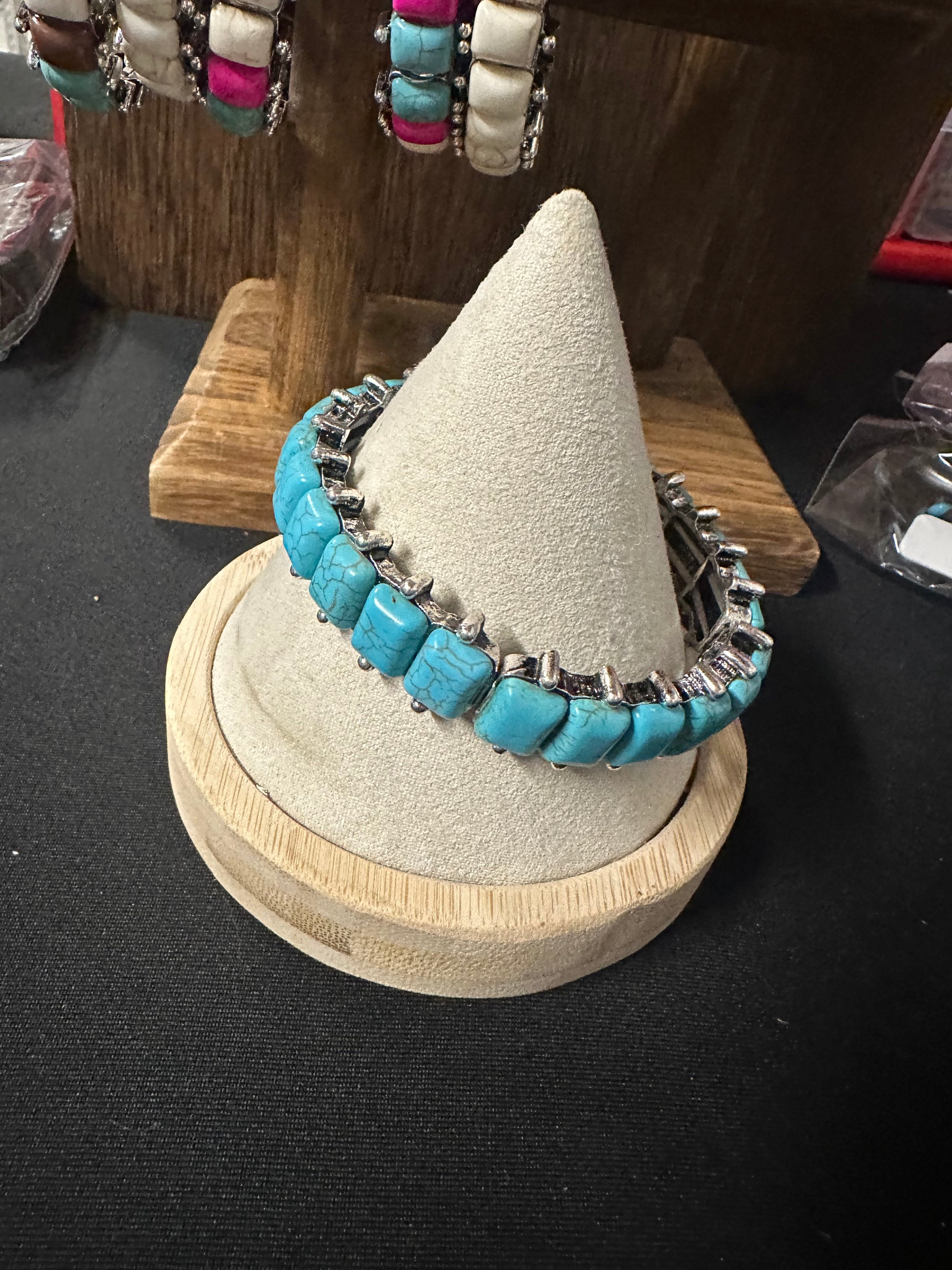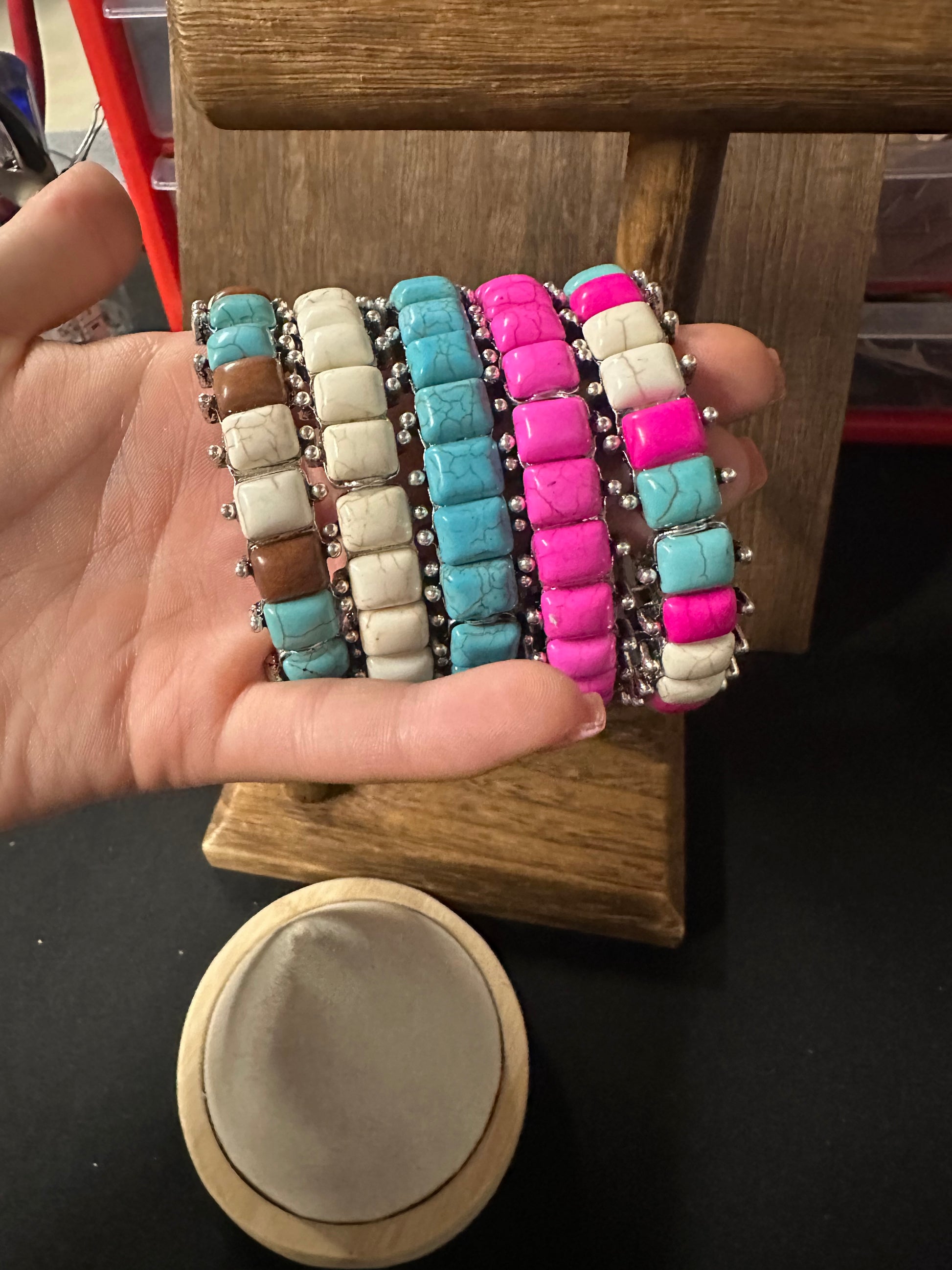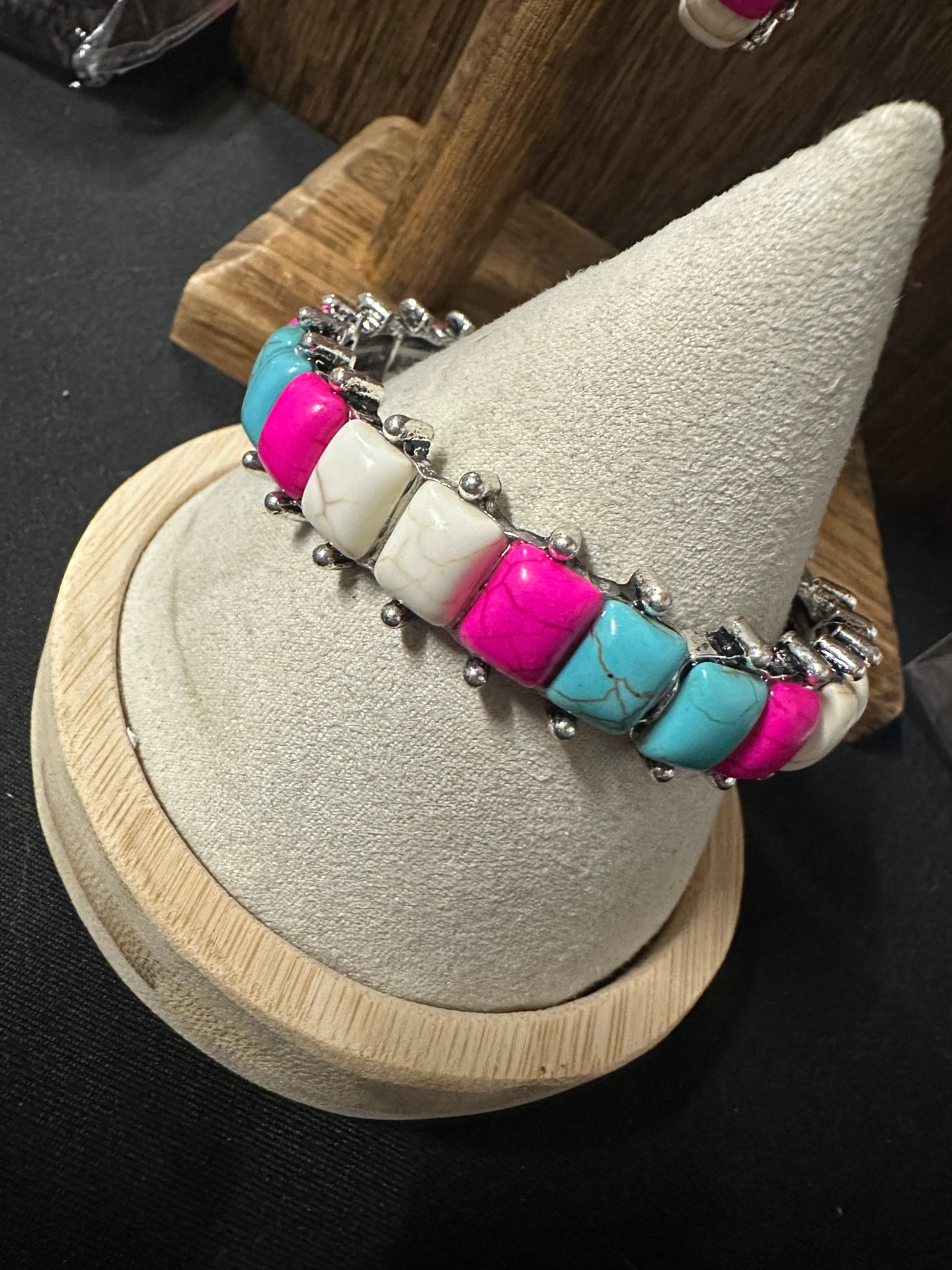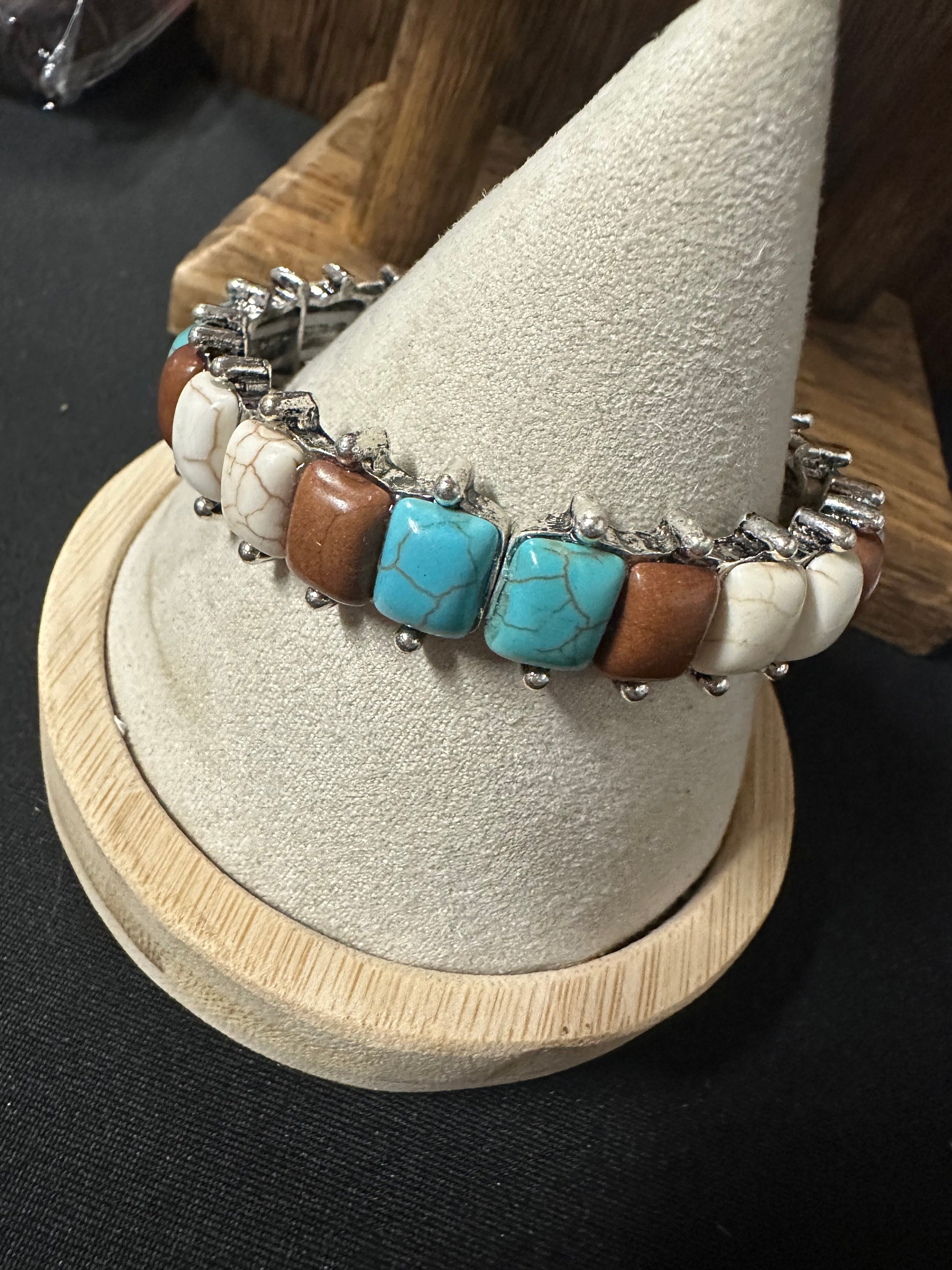 Expertly designed with a rustic burnished silver finish and intricate colored accents, this Western Ball TXR Square Stone Stretch Bracelet adds a touch of elegance to any outfit. Crafted with high-quality materials, this stretch bracelet is not only visually appealing, but also durable and long-lasting. Elevate your style and make a statement with this unique piece.