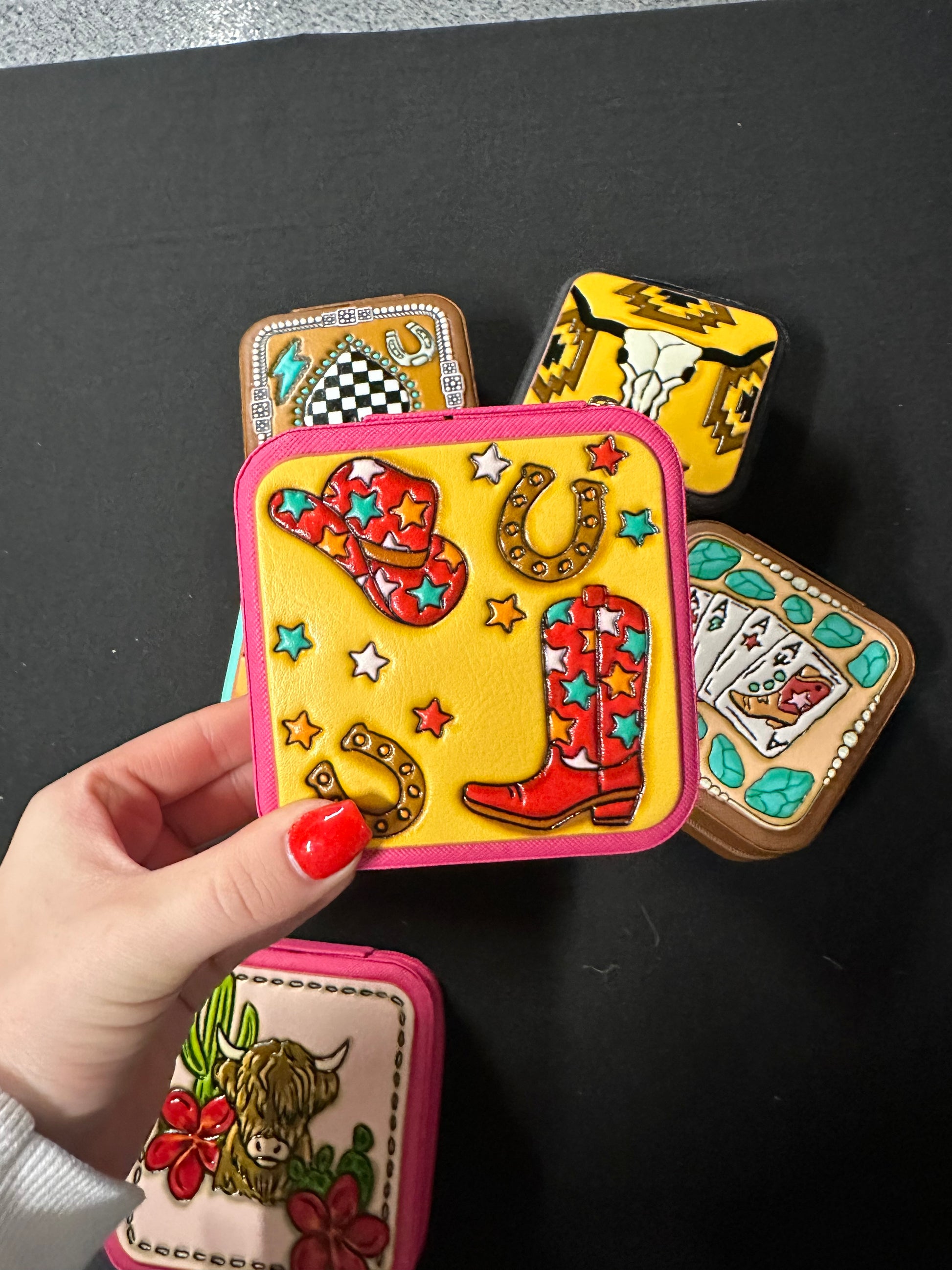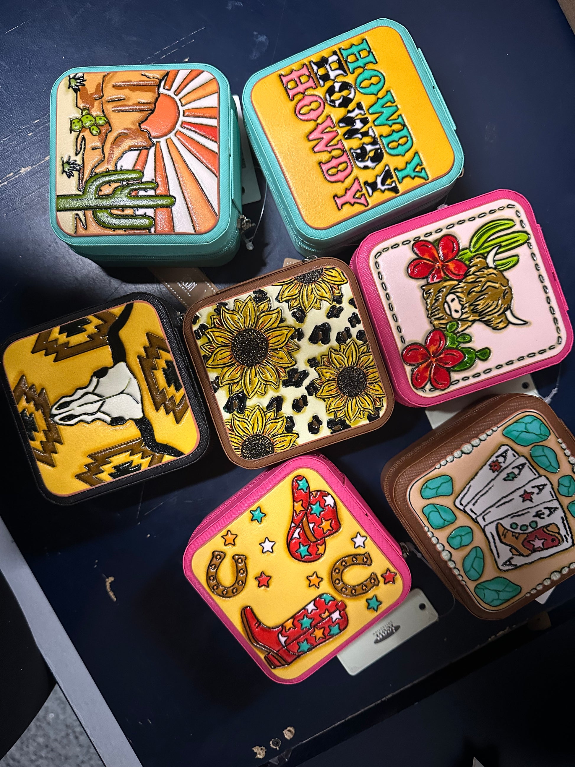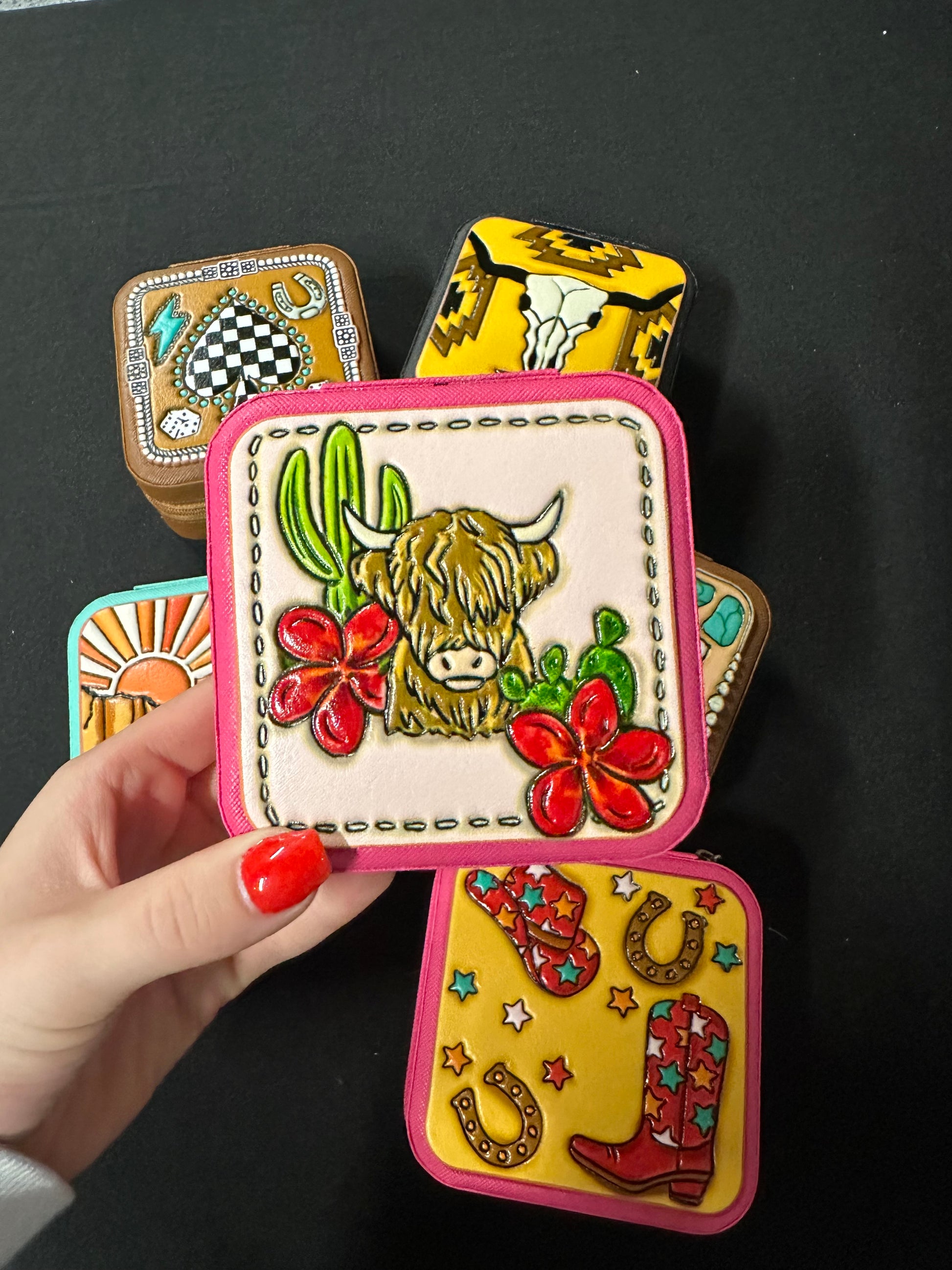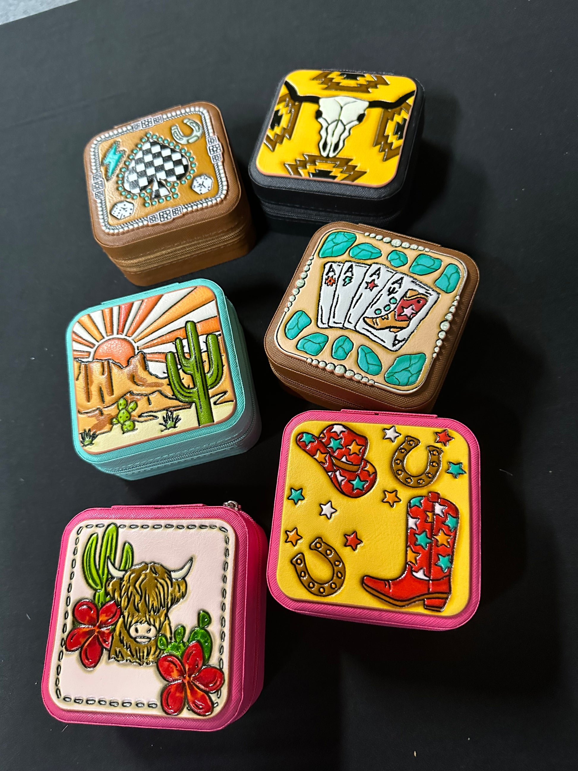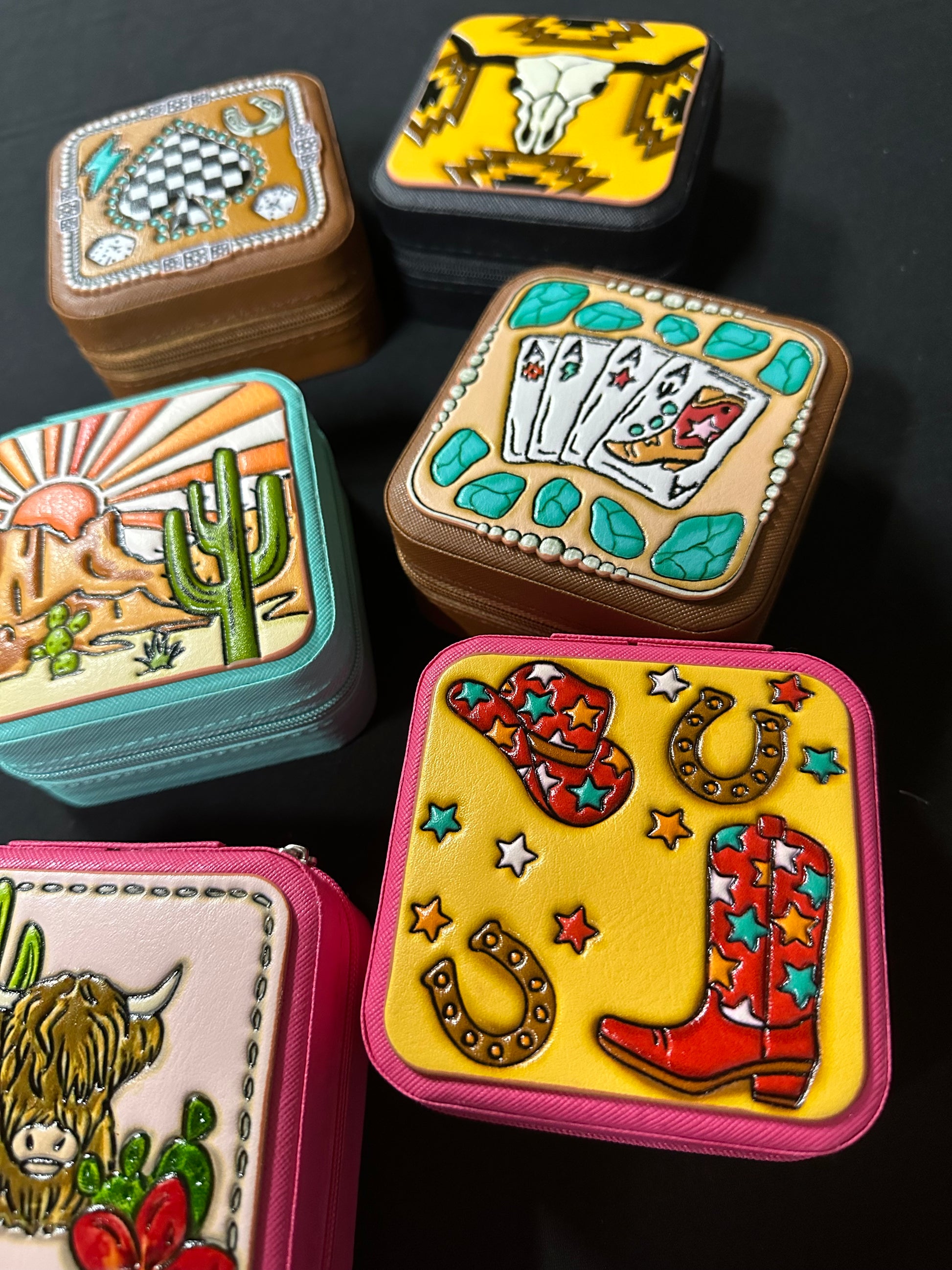 This Western tooled leather travel jewelry box is a stylish and practical solution for storing your valuables while on the go. Crafted from high-quality leather, it features intricate tooled detailing and a spacious interior for all your jewelry essentials. Keep your treasures safe and organized with this must-have travel accessory.