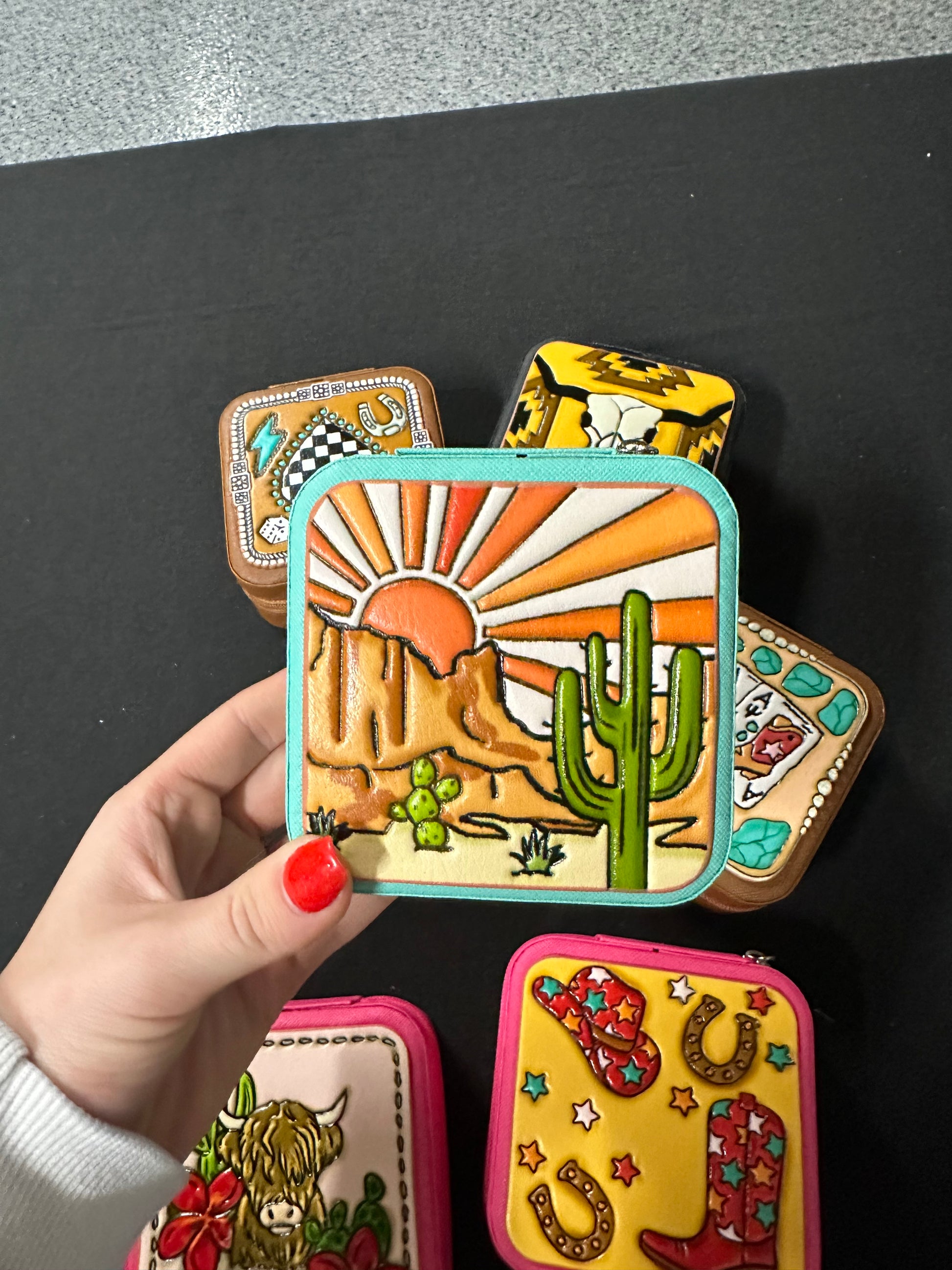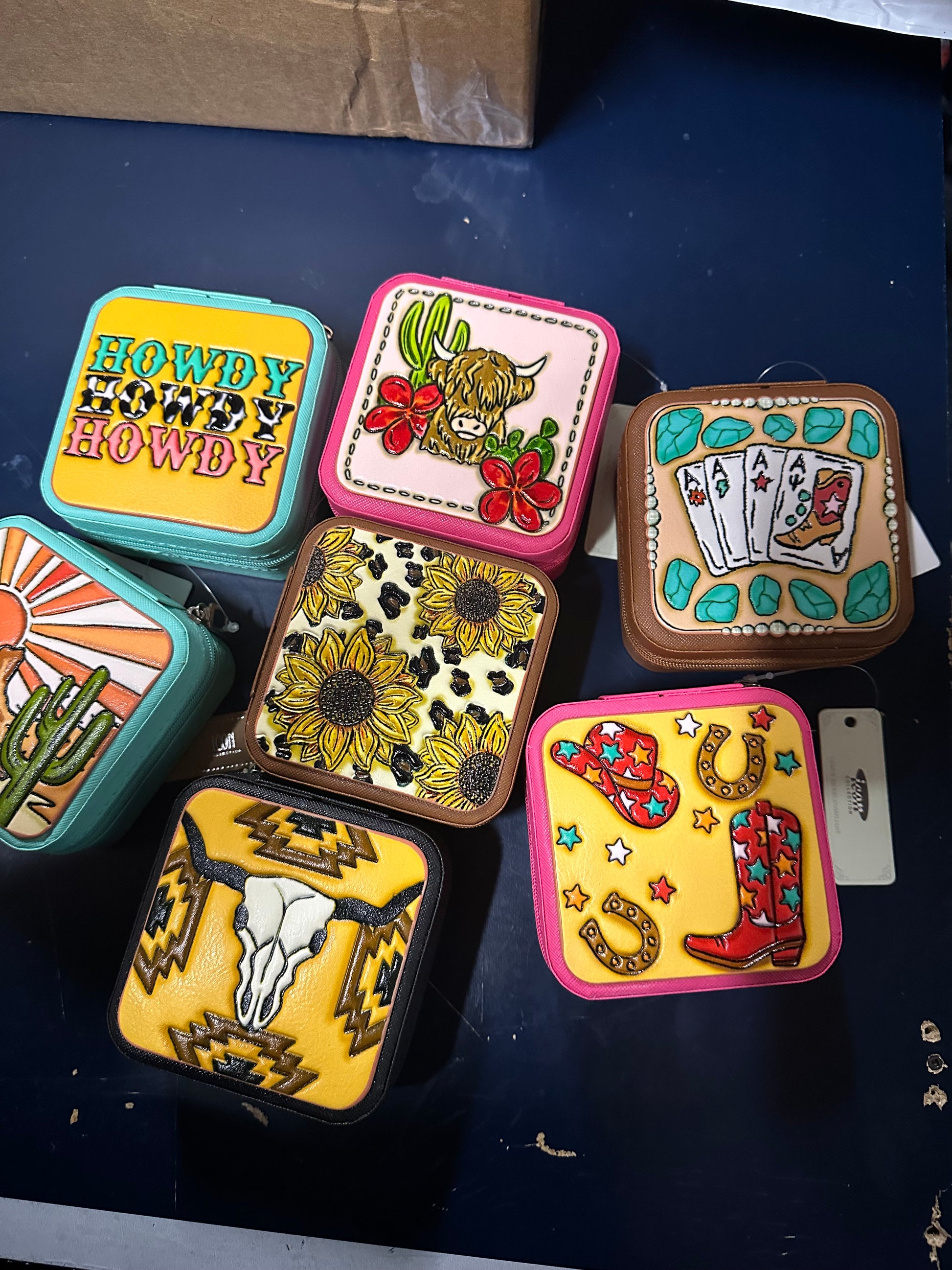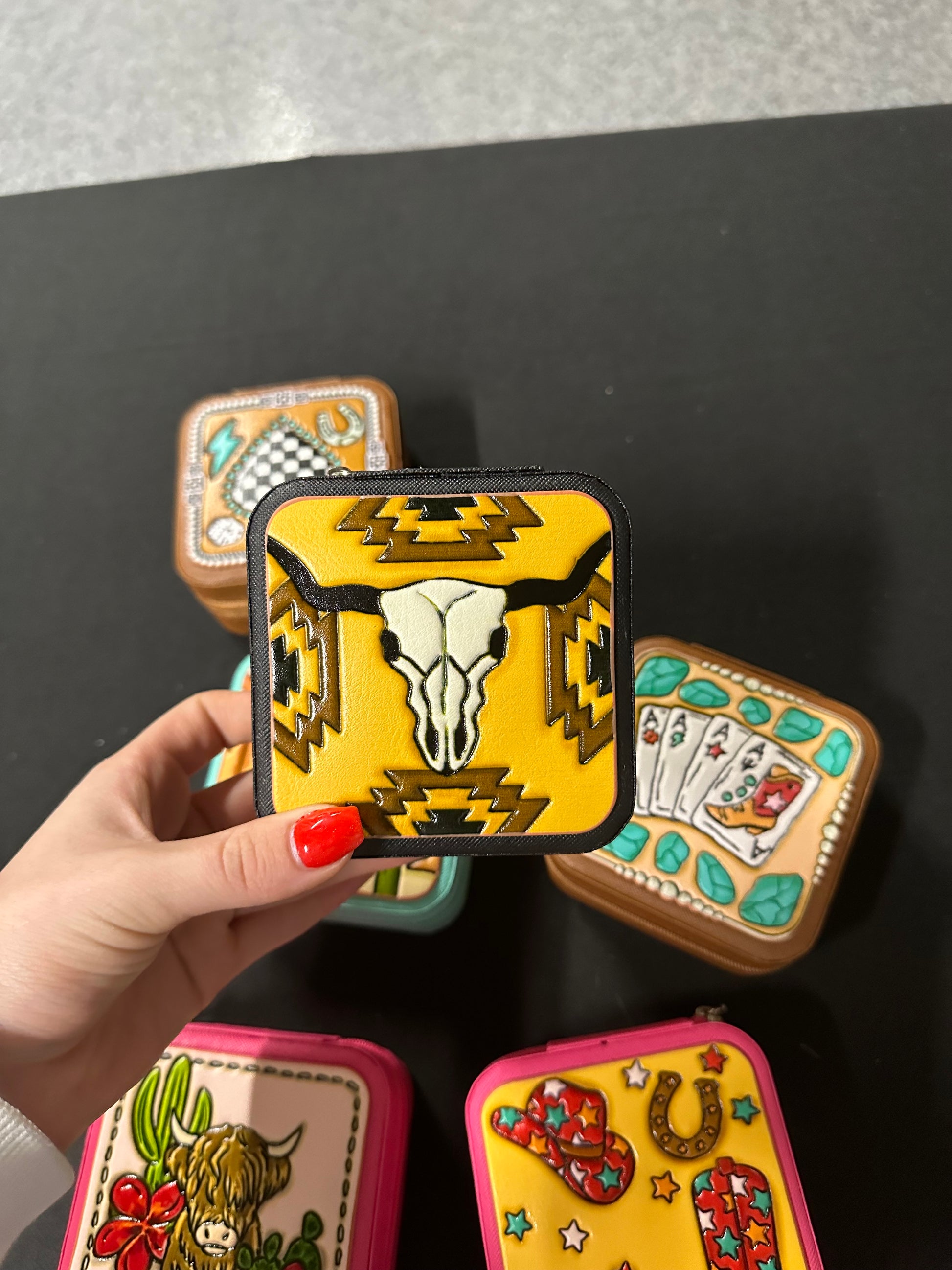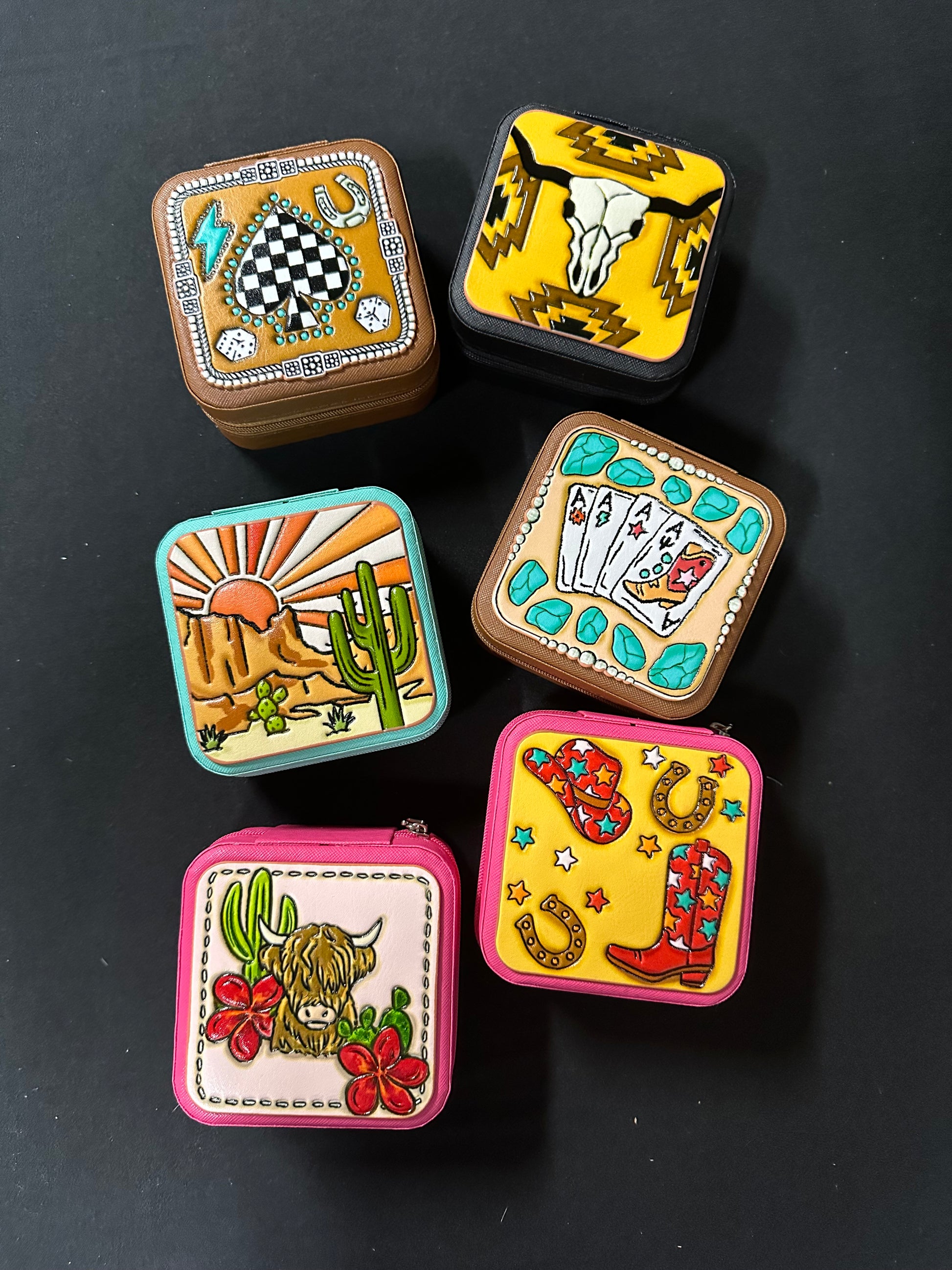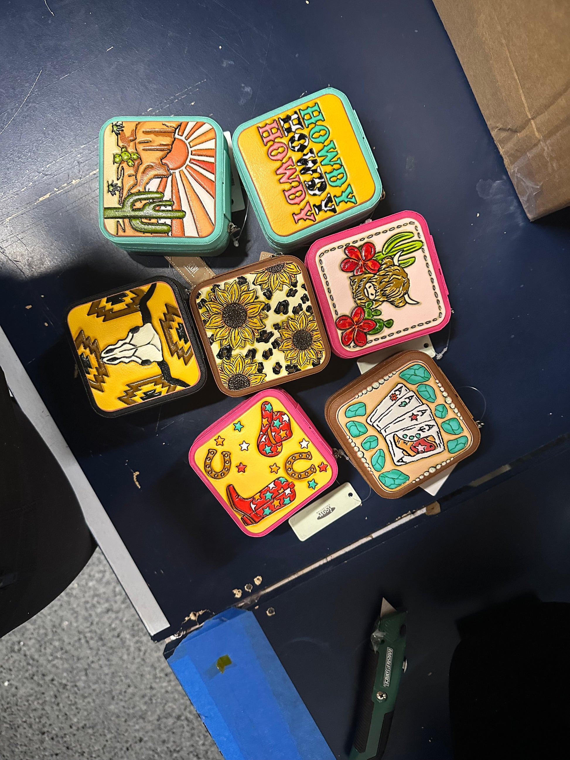 This Western tooled leather travel jewelry box is a stylish and practical solution for storing your valuables while on the go. Crafted from high-quality leather, it features intricate tooled detailing and a spacious interior for all your jewelry essentials. Keep your treasures safe and organized with this must-have travel accessory.